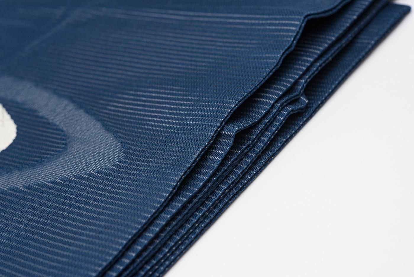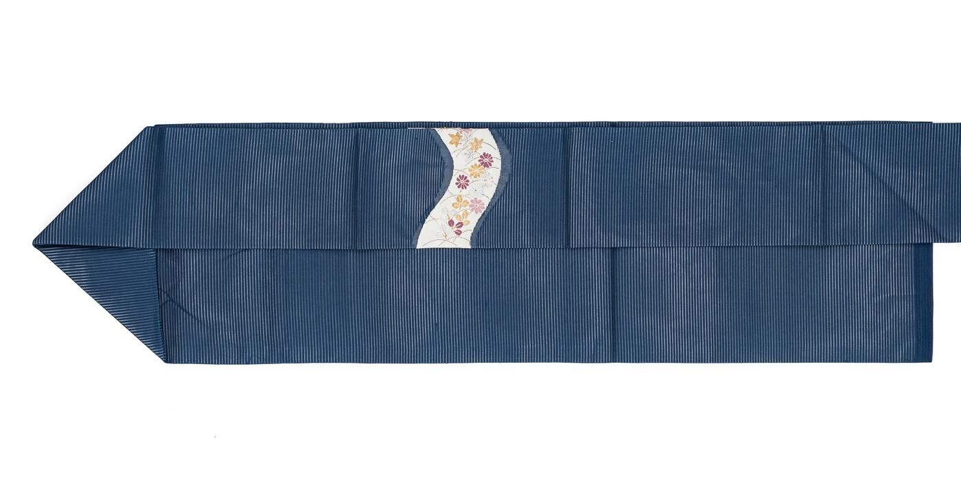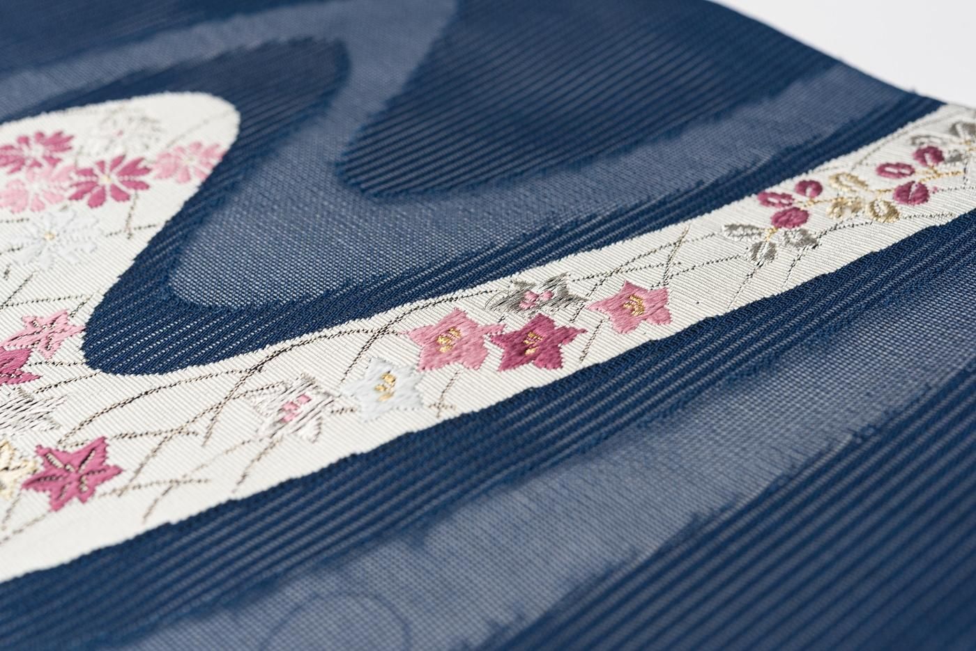 落ち着いた青地に流水模様を織り出した絽の九寸名古屋帯です。