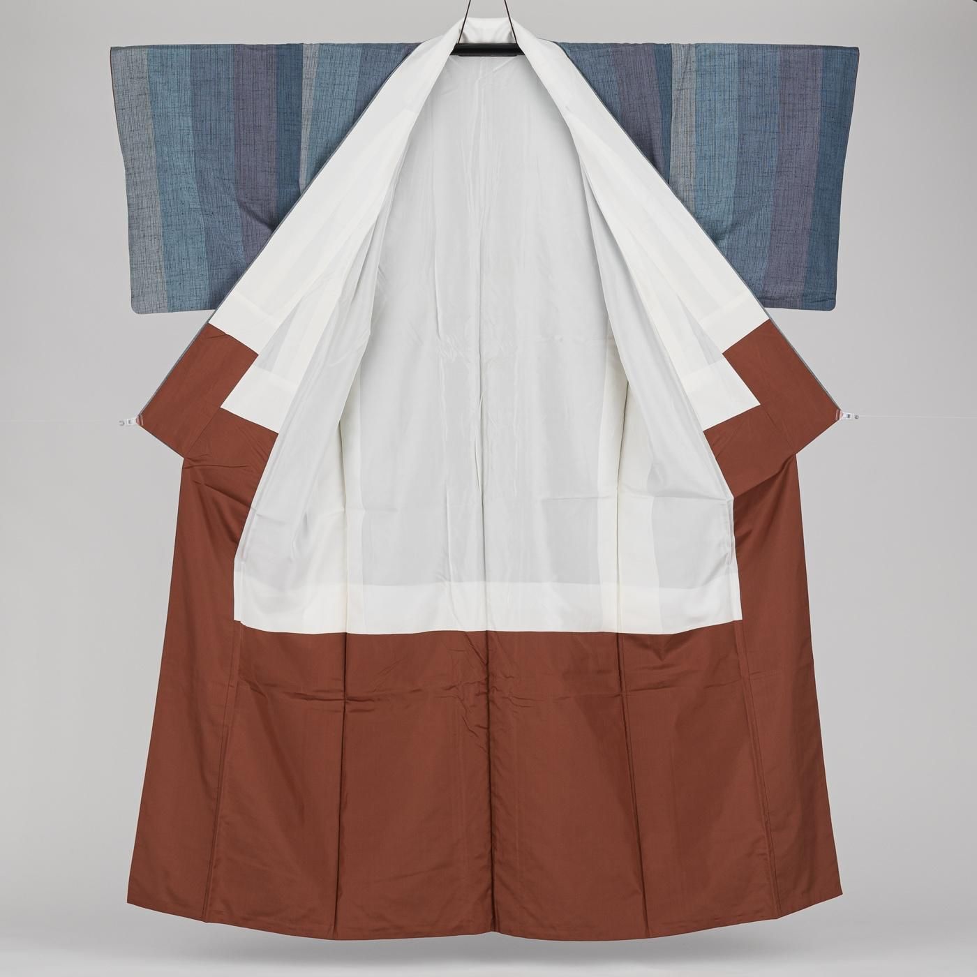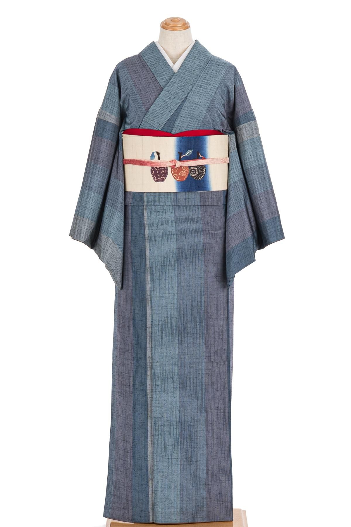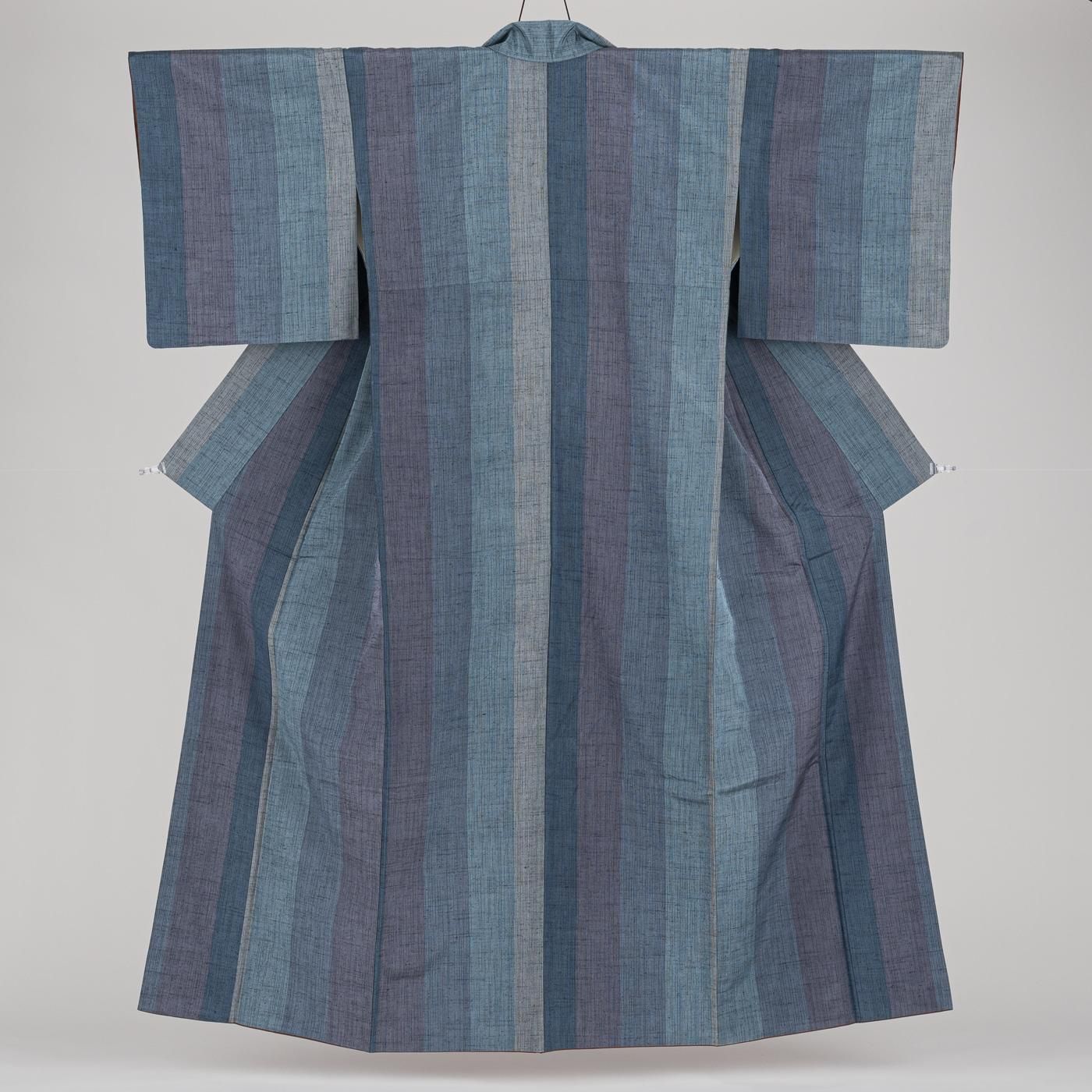 青を基調とした縞模様を織り出した紬の着物です。