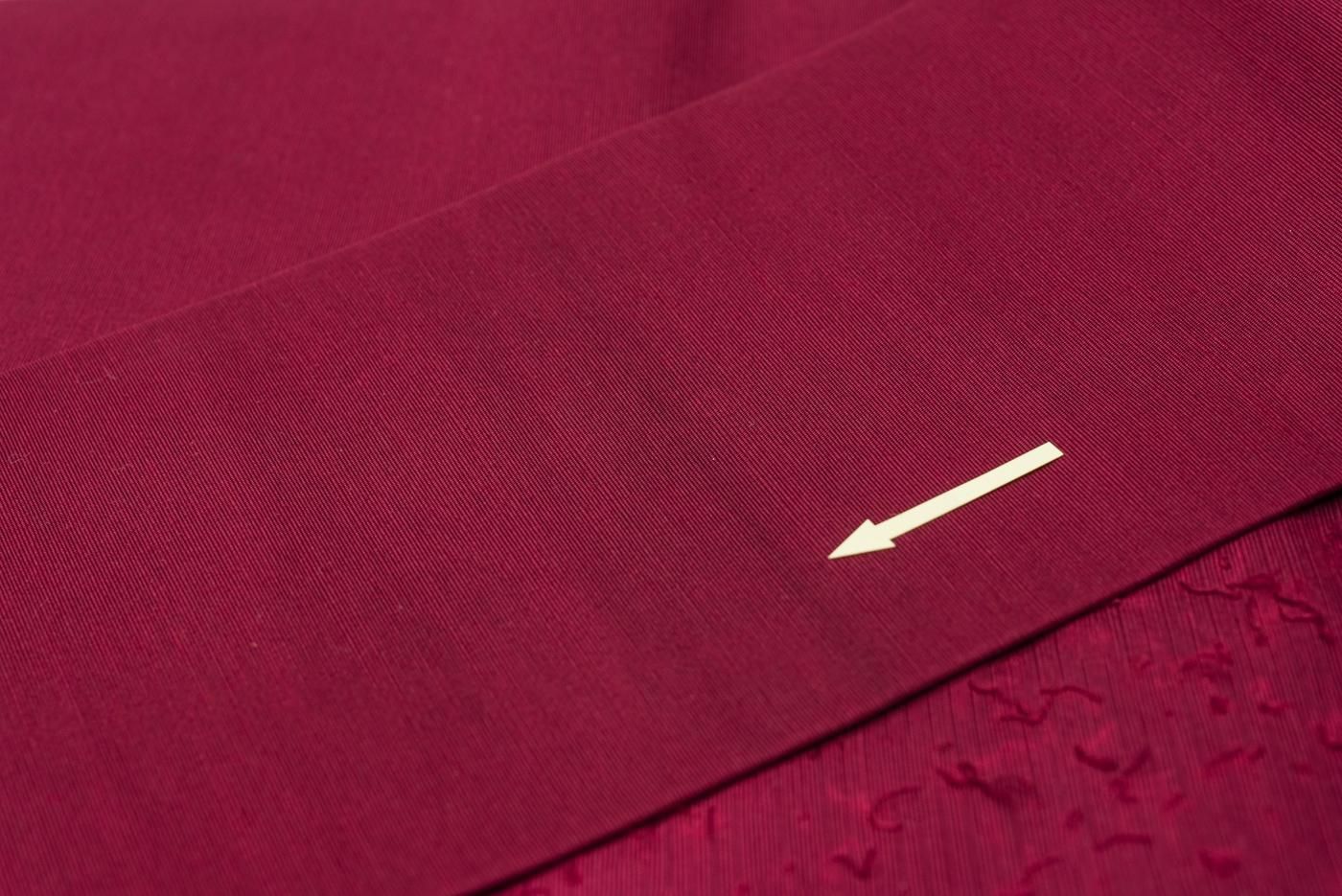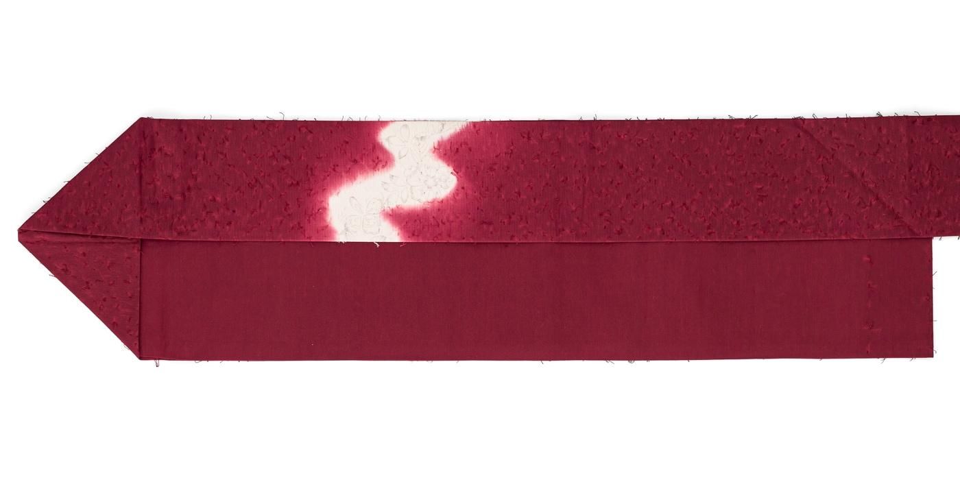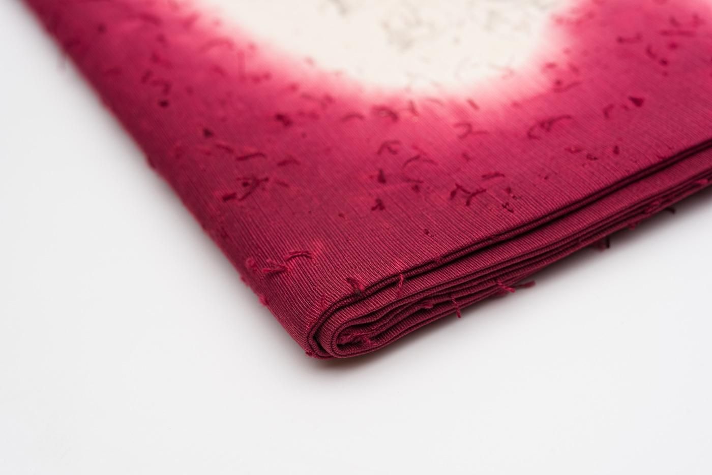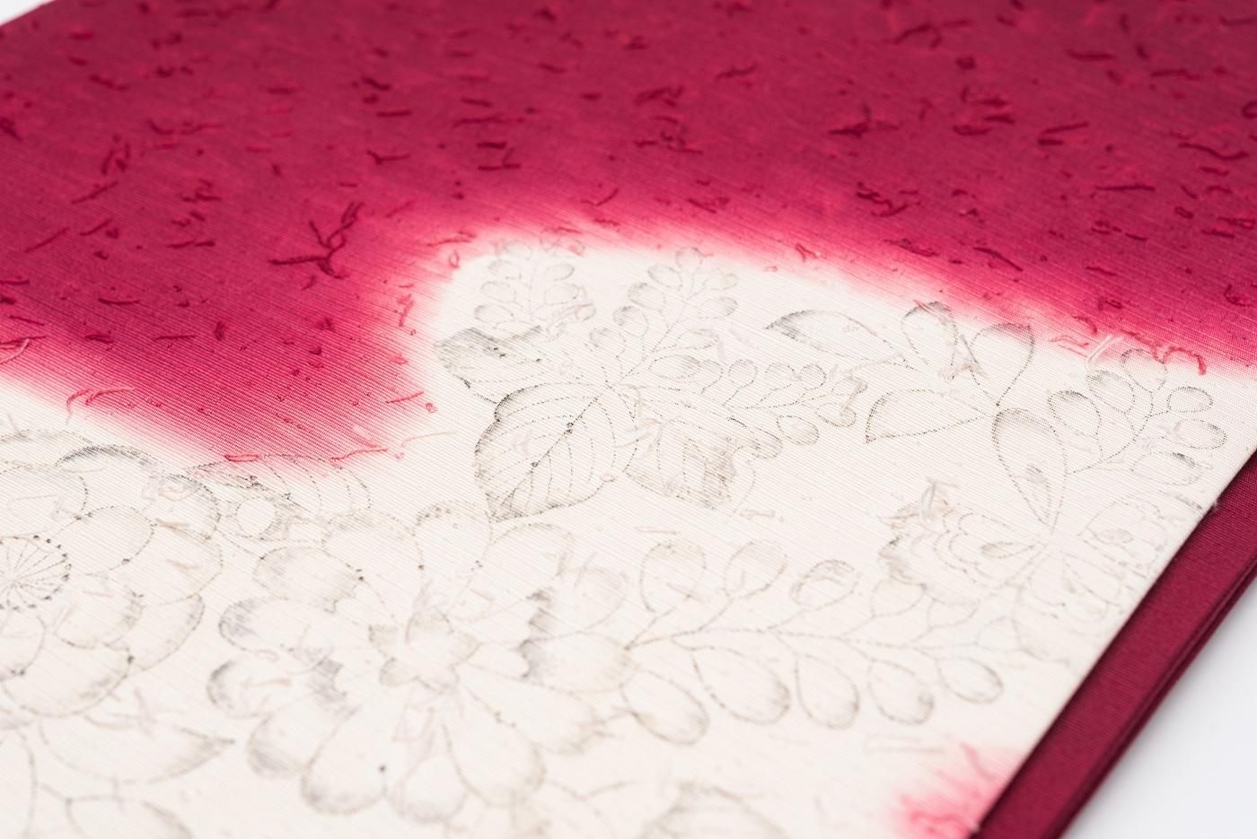 ワインレッドの地にゆらりと広がる霞模様が幻想的な九寸名古屋帯です。
