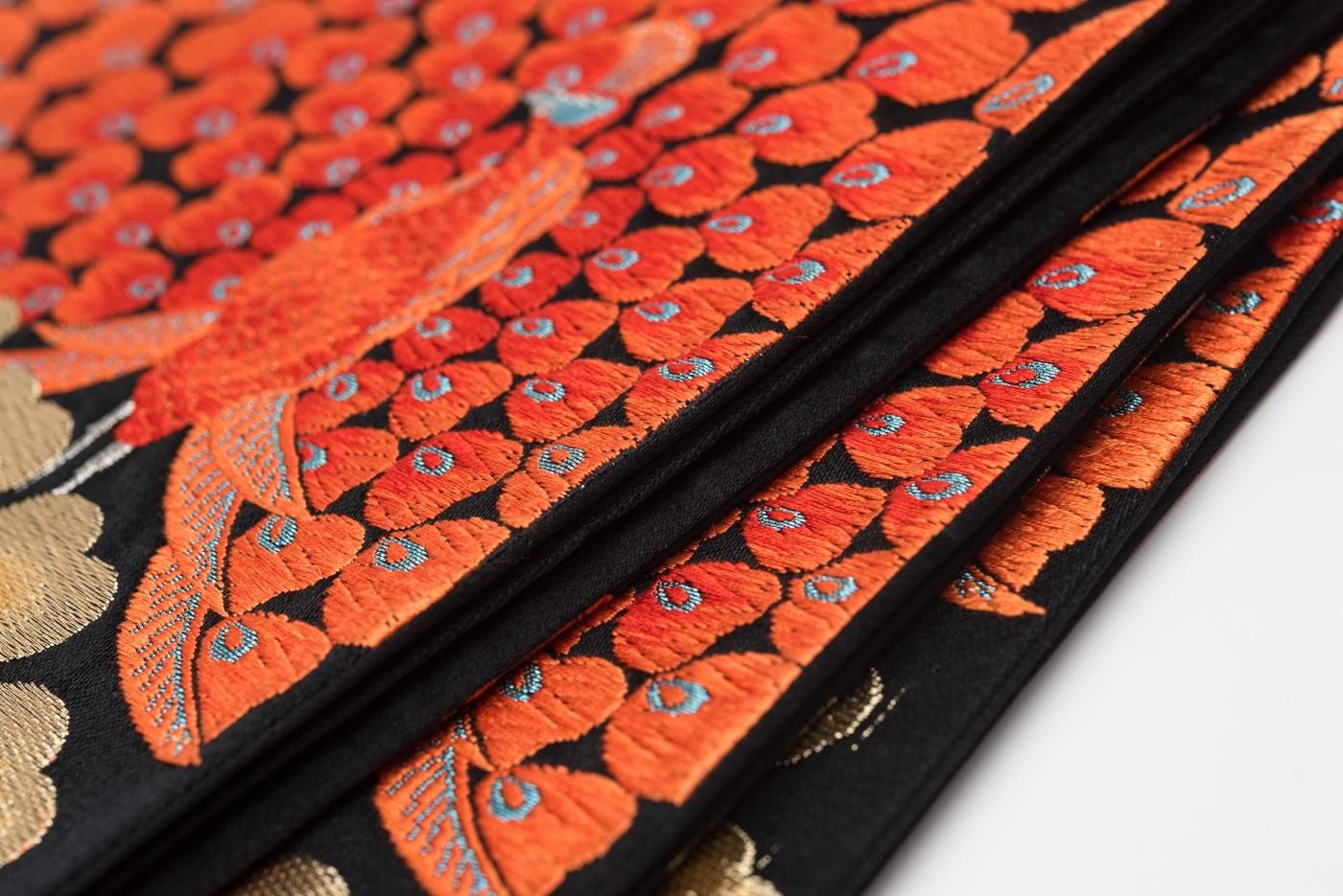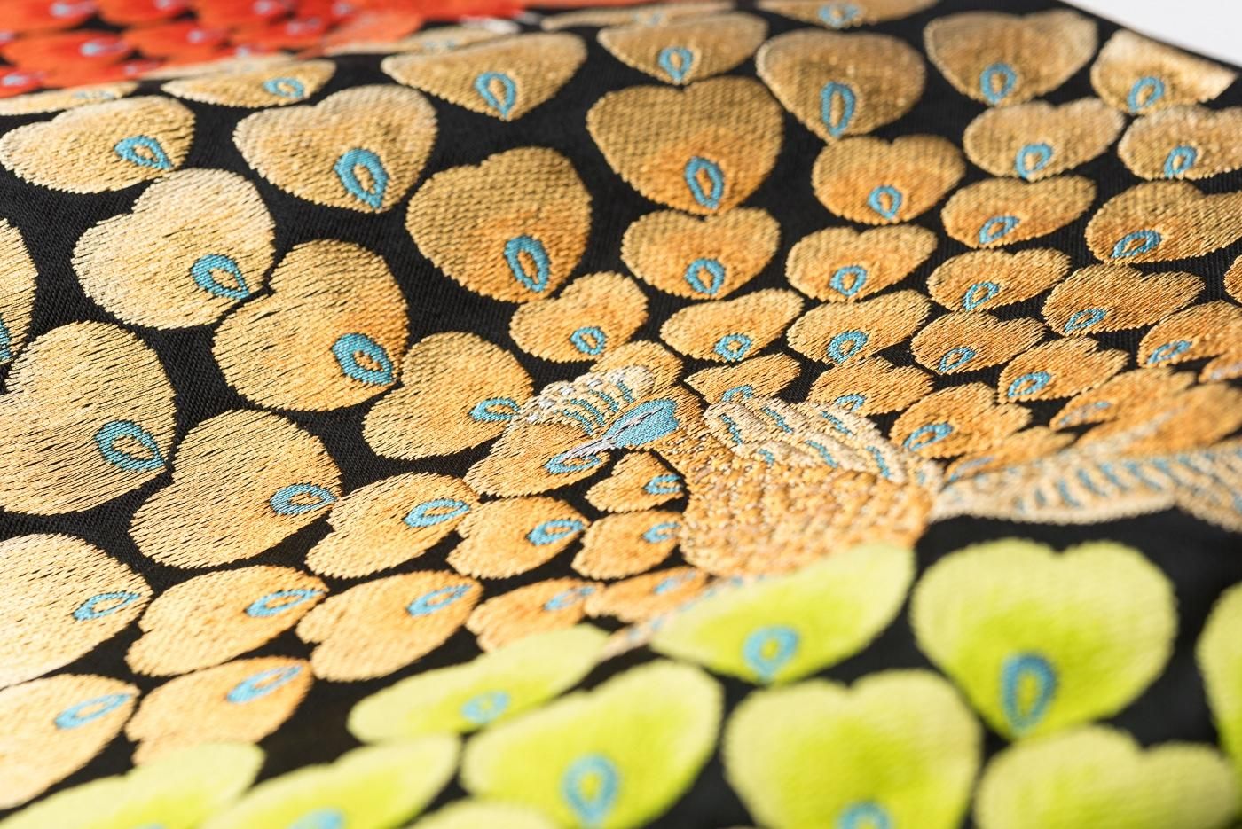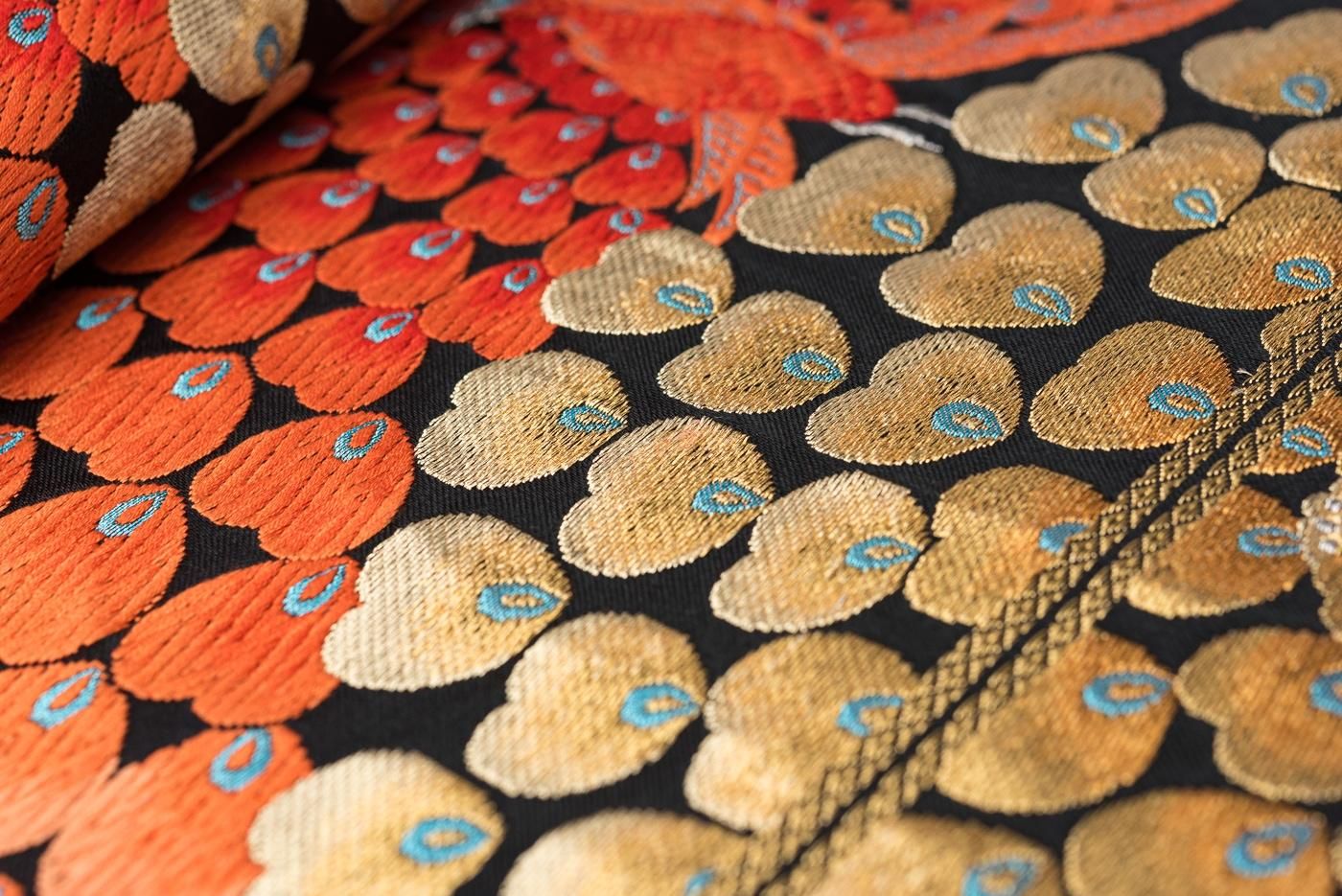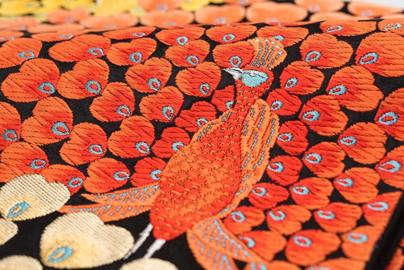 大きく孔雀を織り出したセミアンティークの袋帯です。