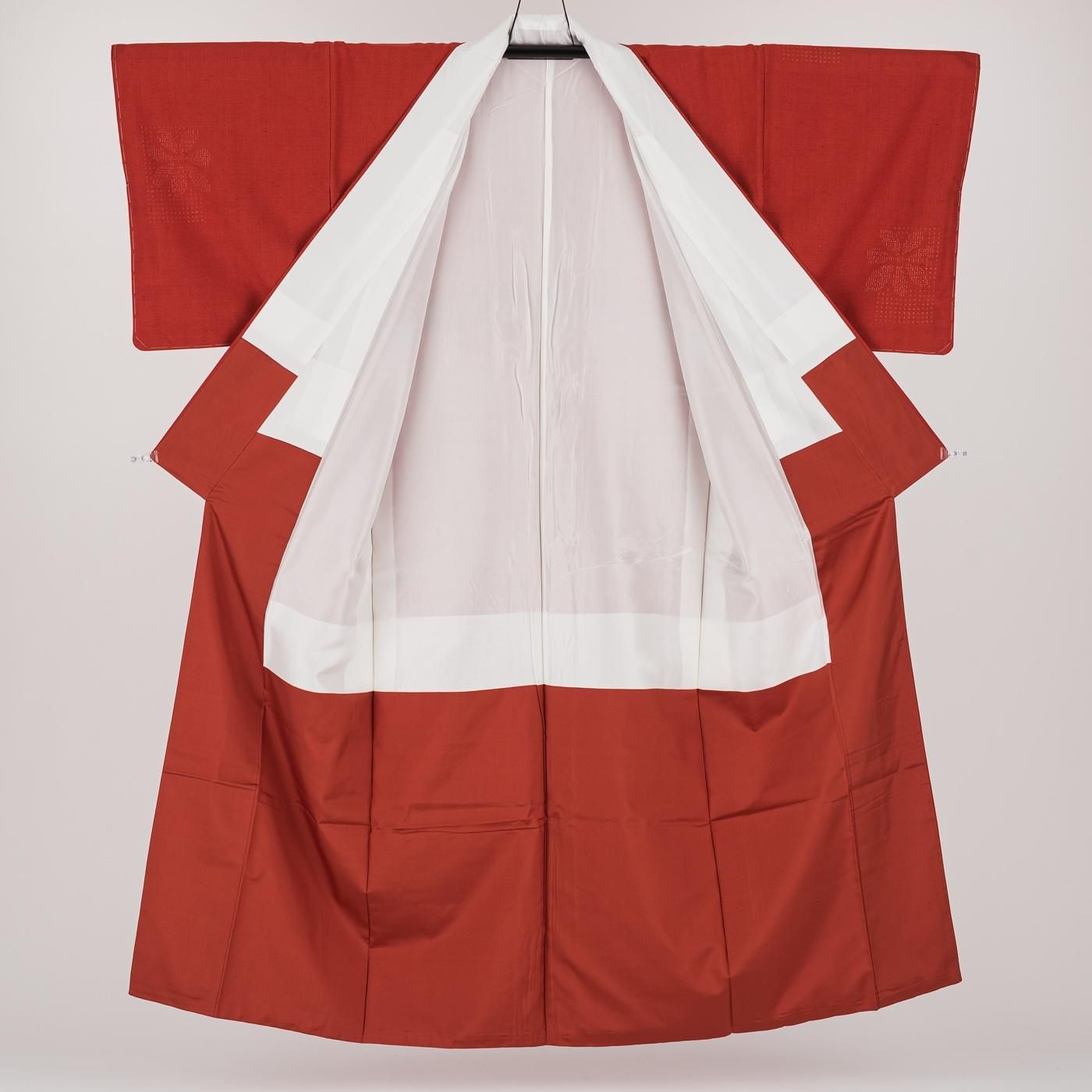 鮮やかな朱赤の地に飛び柄の花を織り出した紬の着物です。