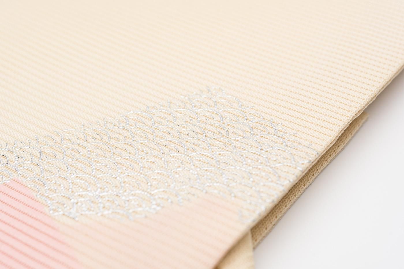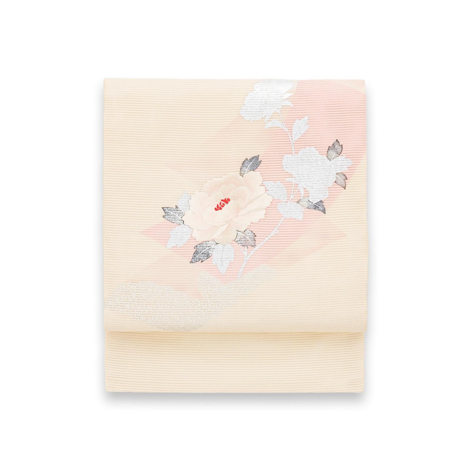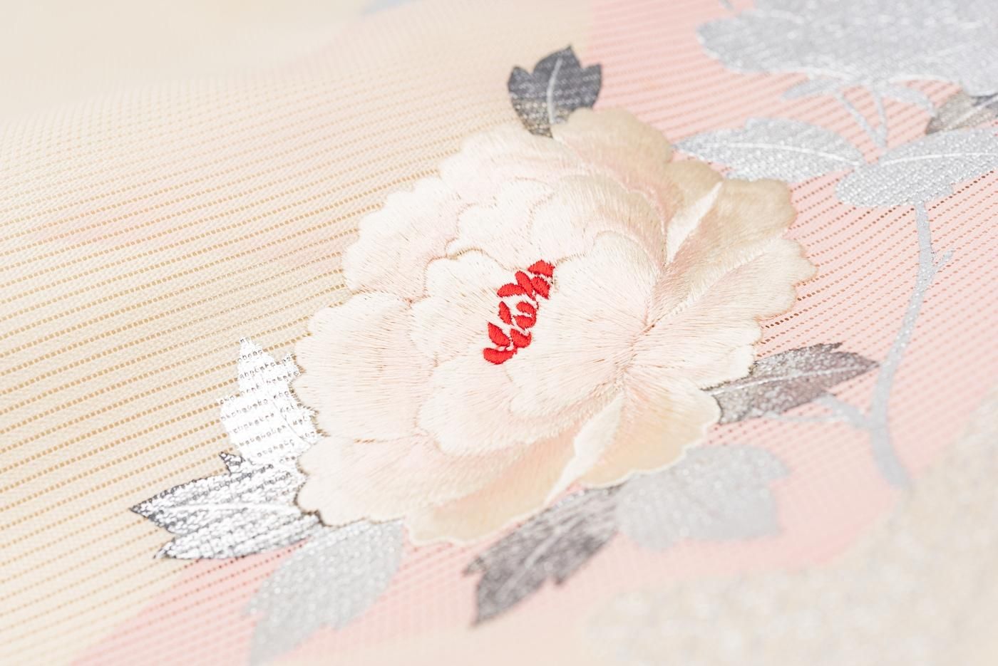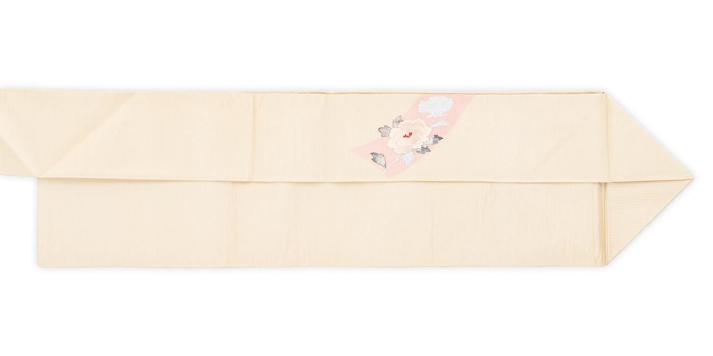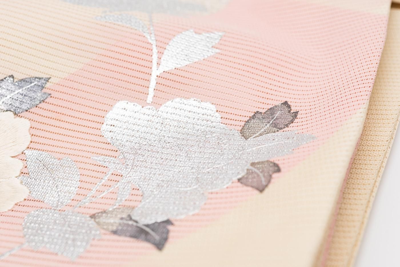 蒸栗色の地に白牡丹を刺繍した絽の九寸名古屋帯です。