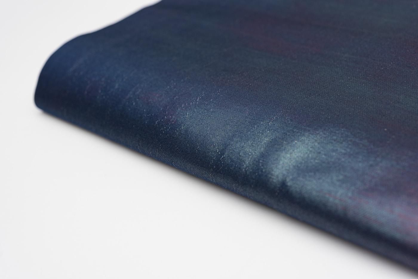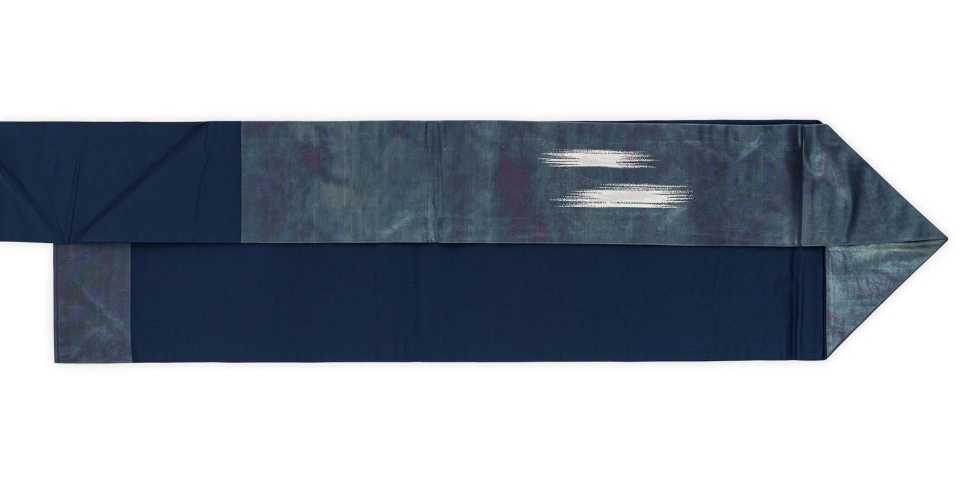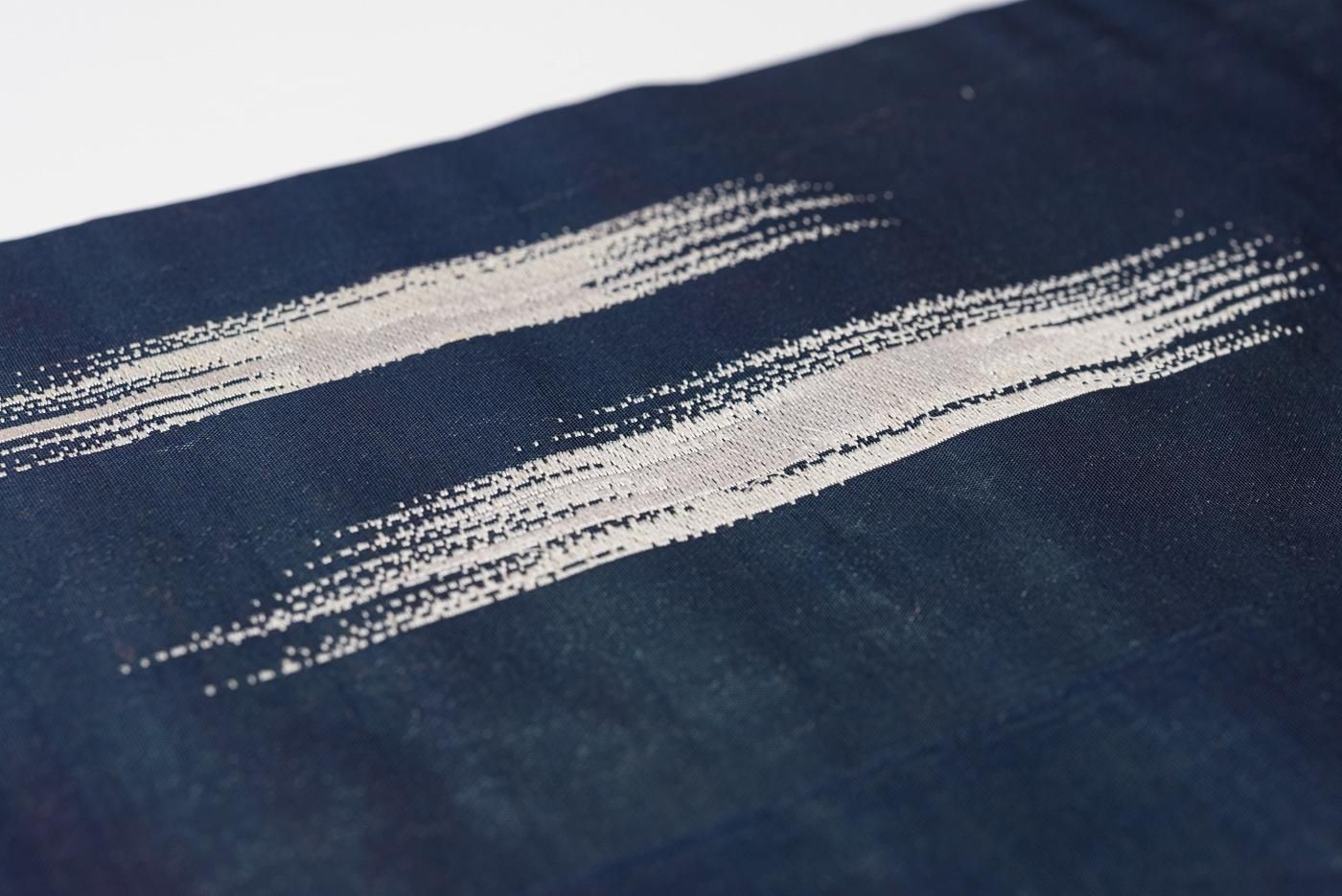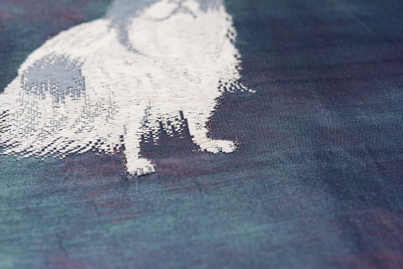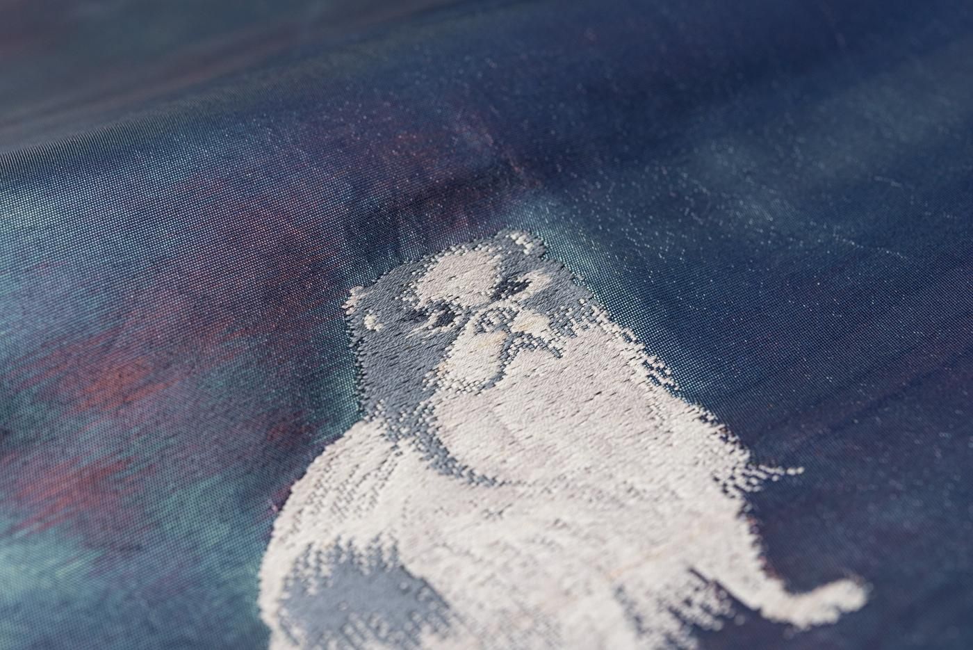 青緑の暈し地に狆の姿を織り出した九寸名古屋帯です。