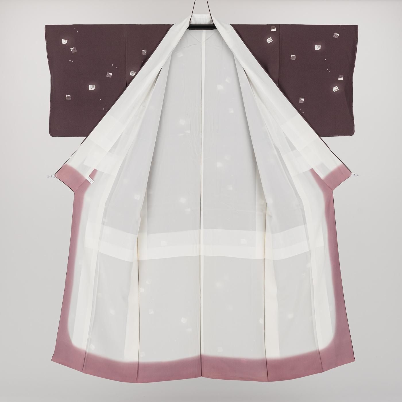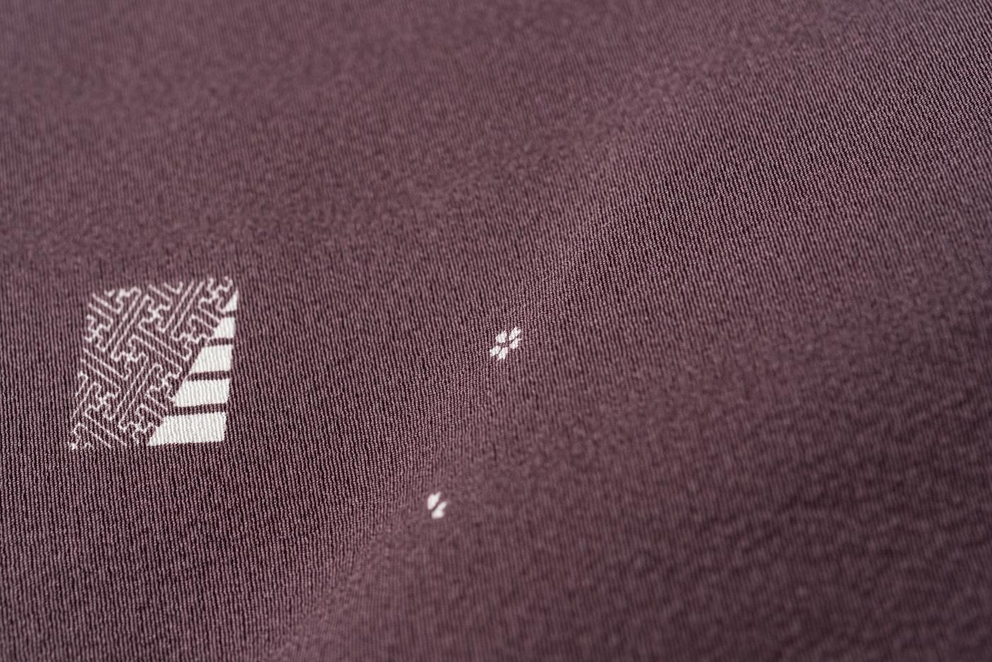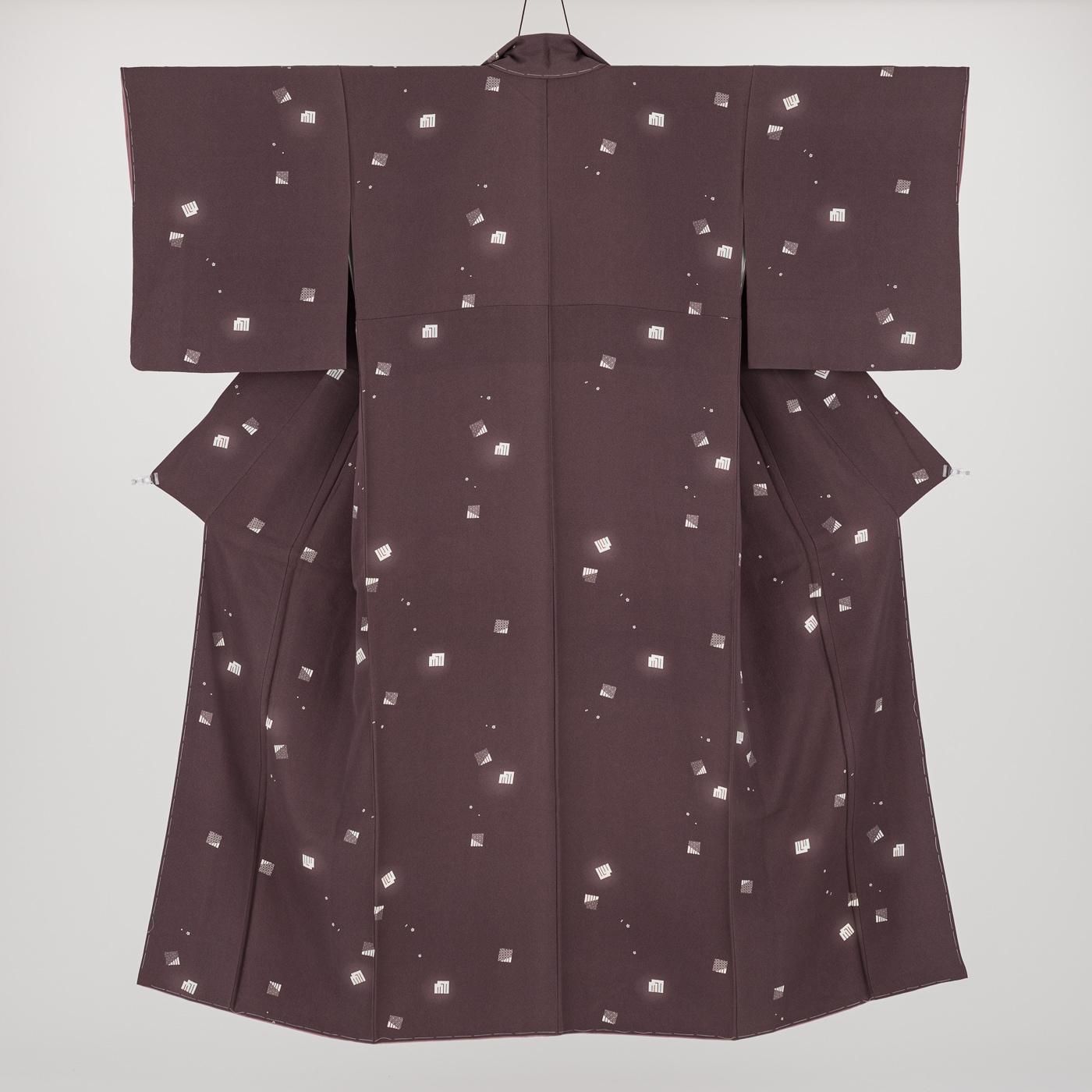 やや黄味がかった落ち着いた紫の地に源氏香模様を染めた小紋の着物です。