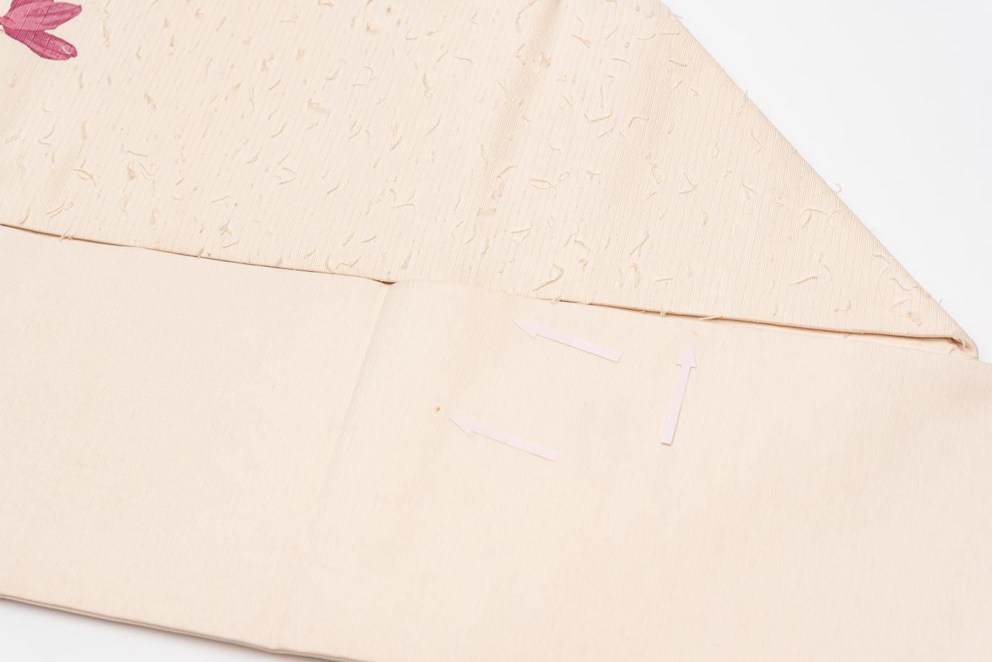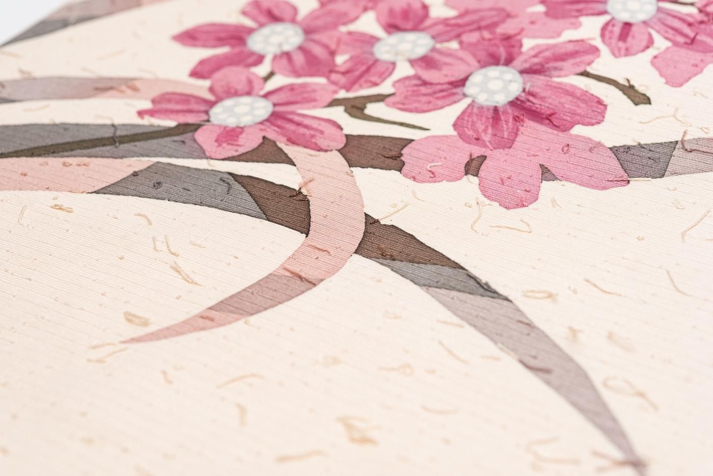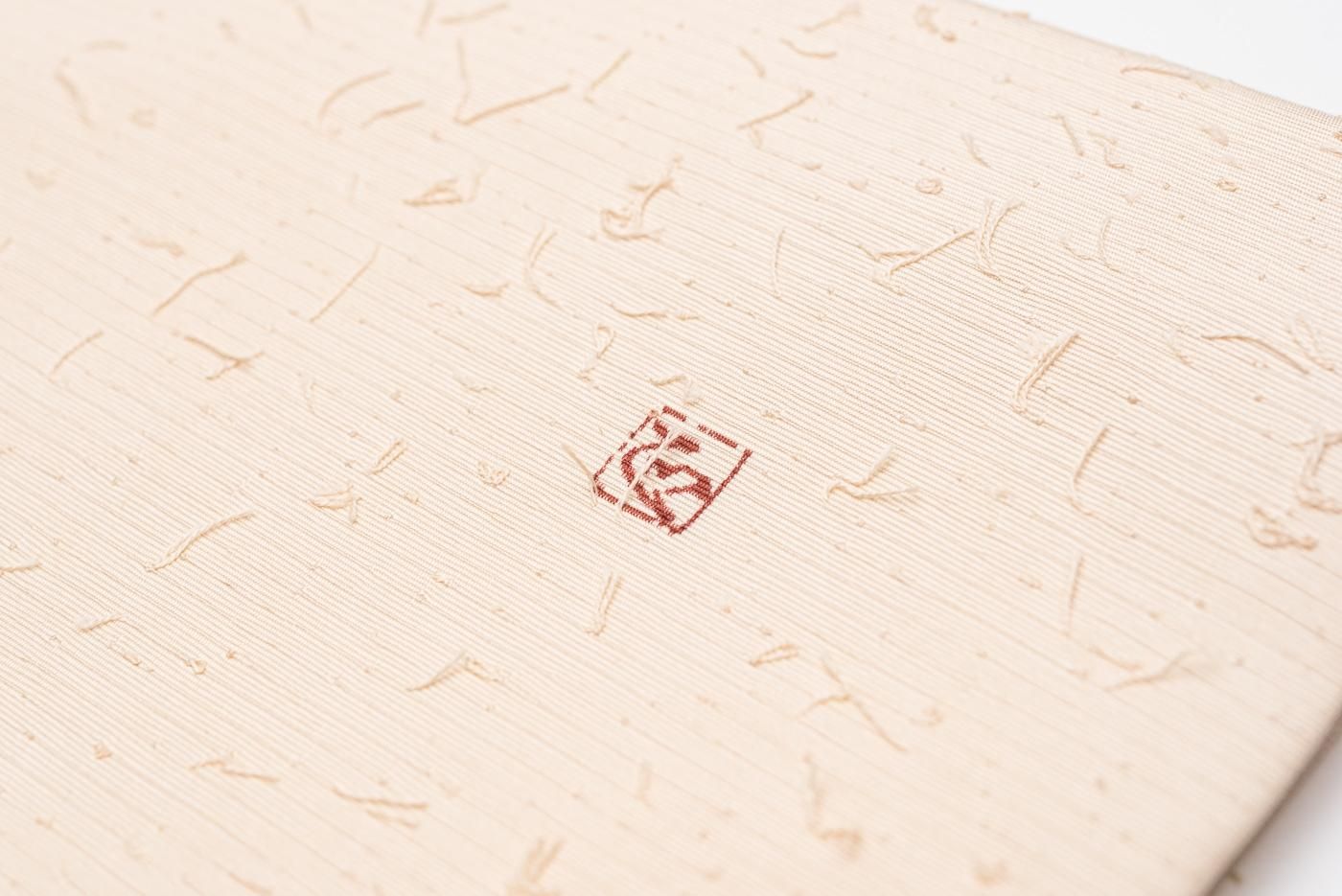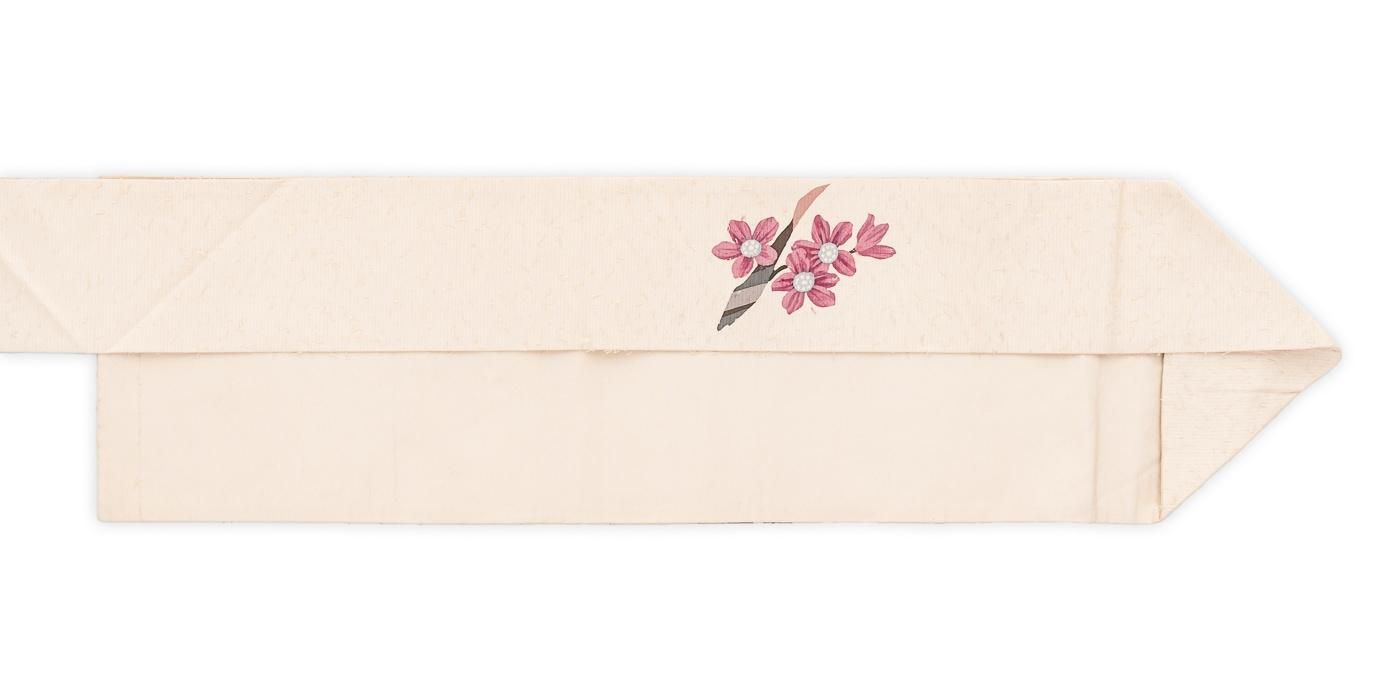 アイボリーの紬地にピンクの花を描いた九寸名古屋帯です。
