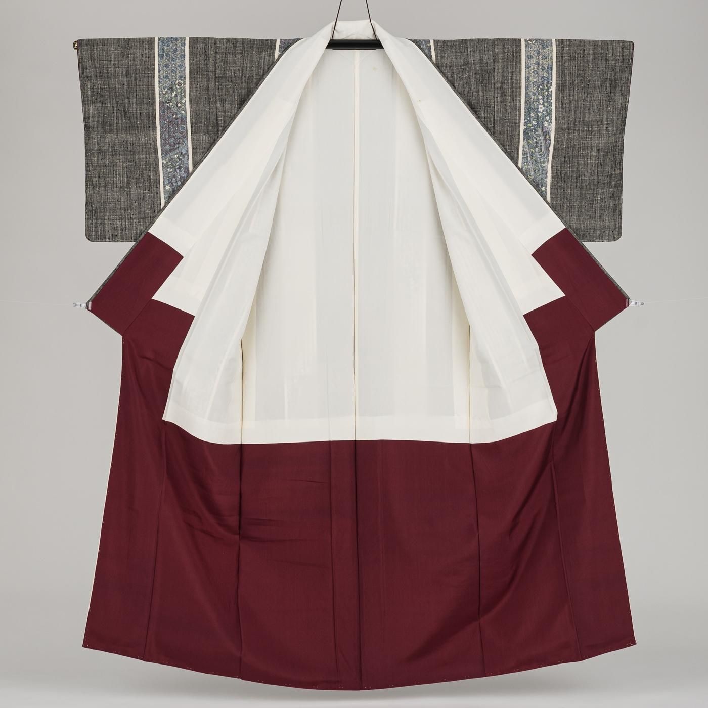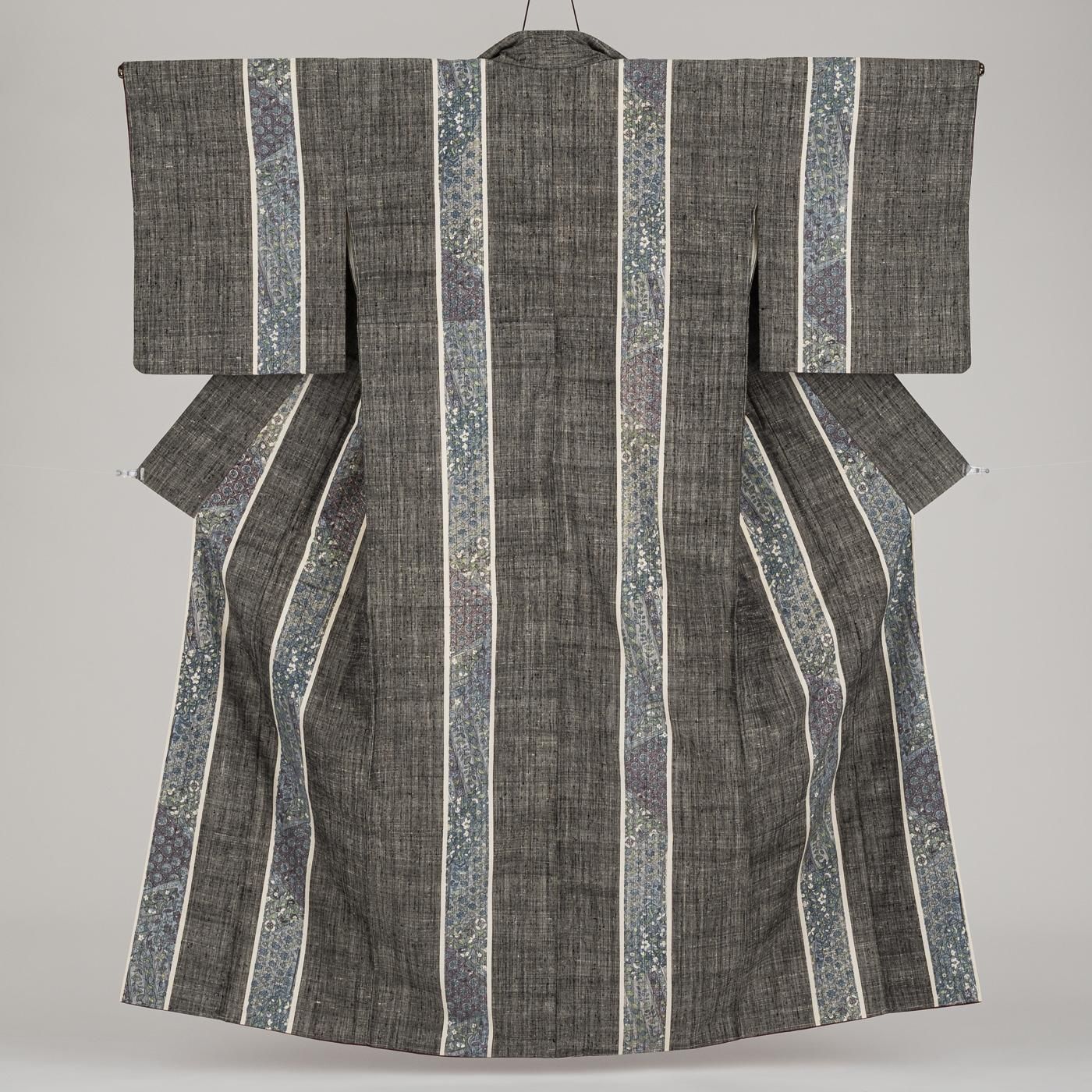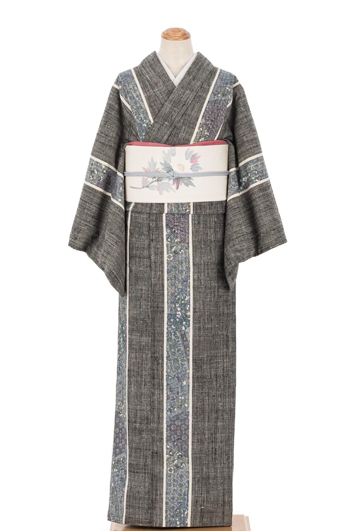 太い一本縞の中に細かく花更紗模様を染めた紬の着物です。