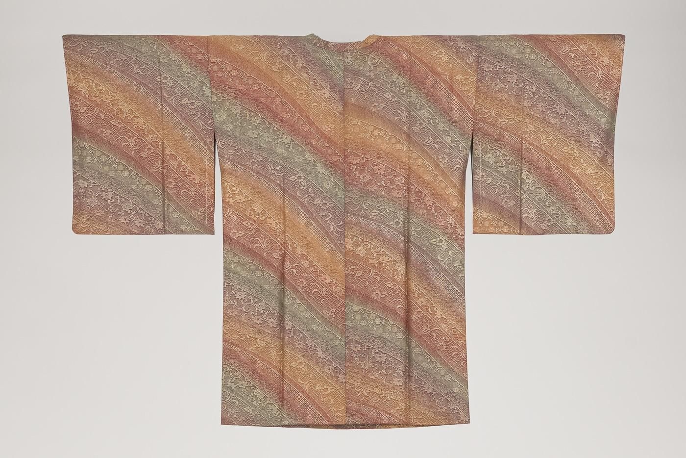 斜めのラインに唐草、笹蔓、紗綾形、菊などの模様を織り出したロング丈の道行コートです。