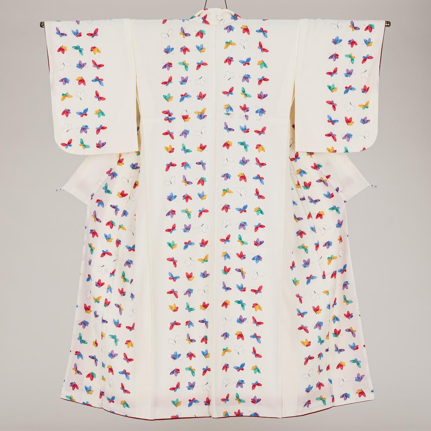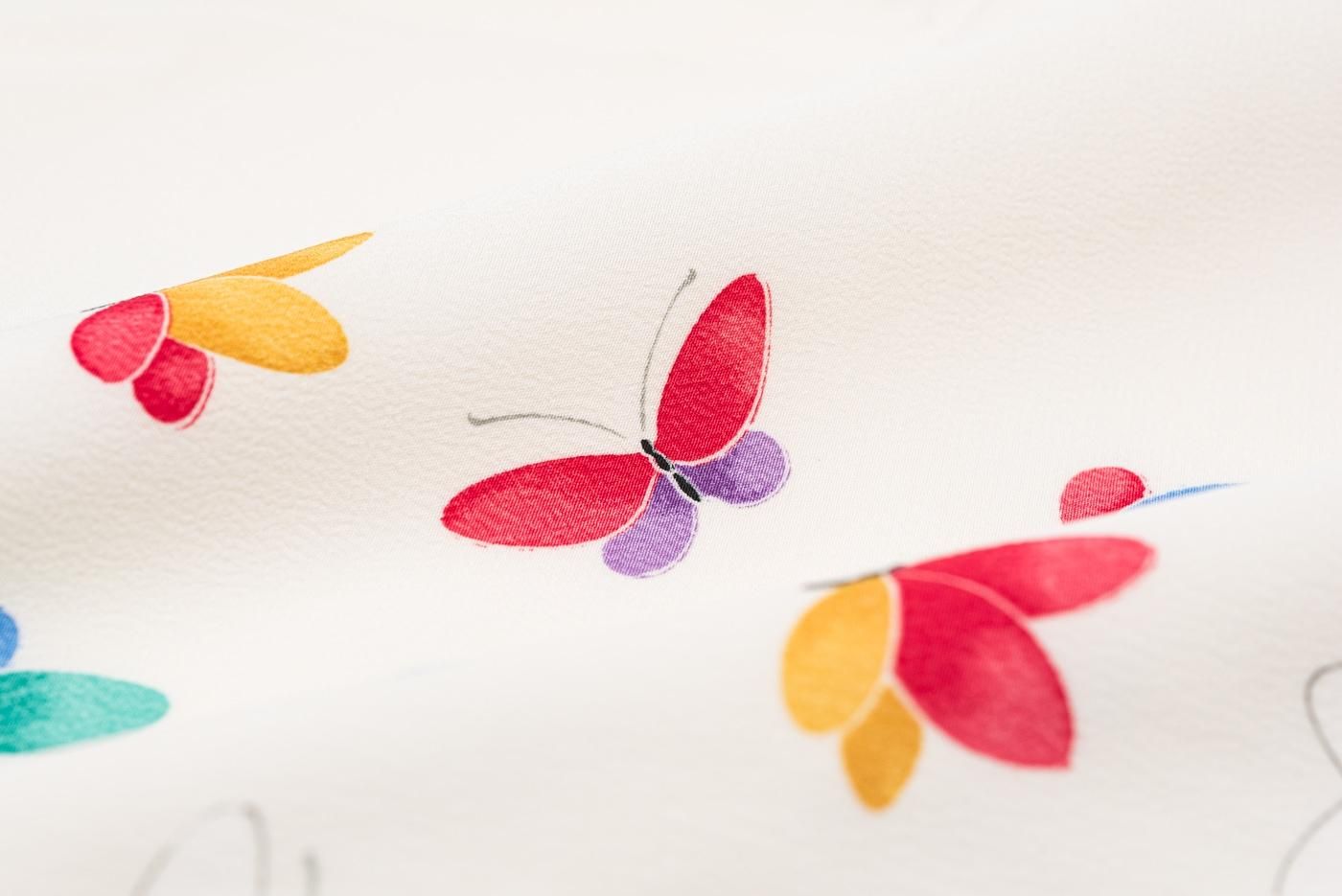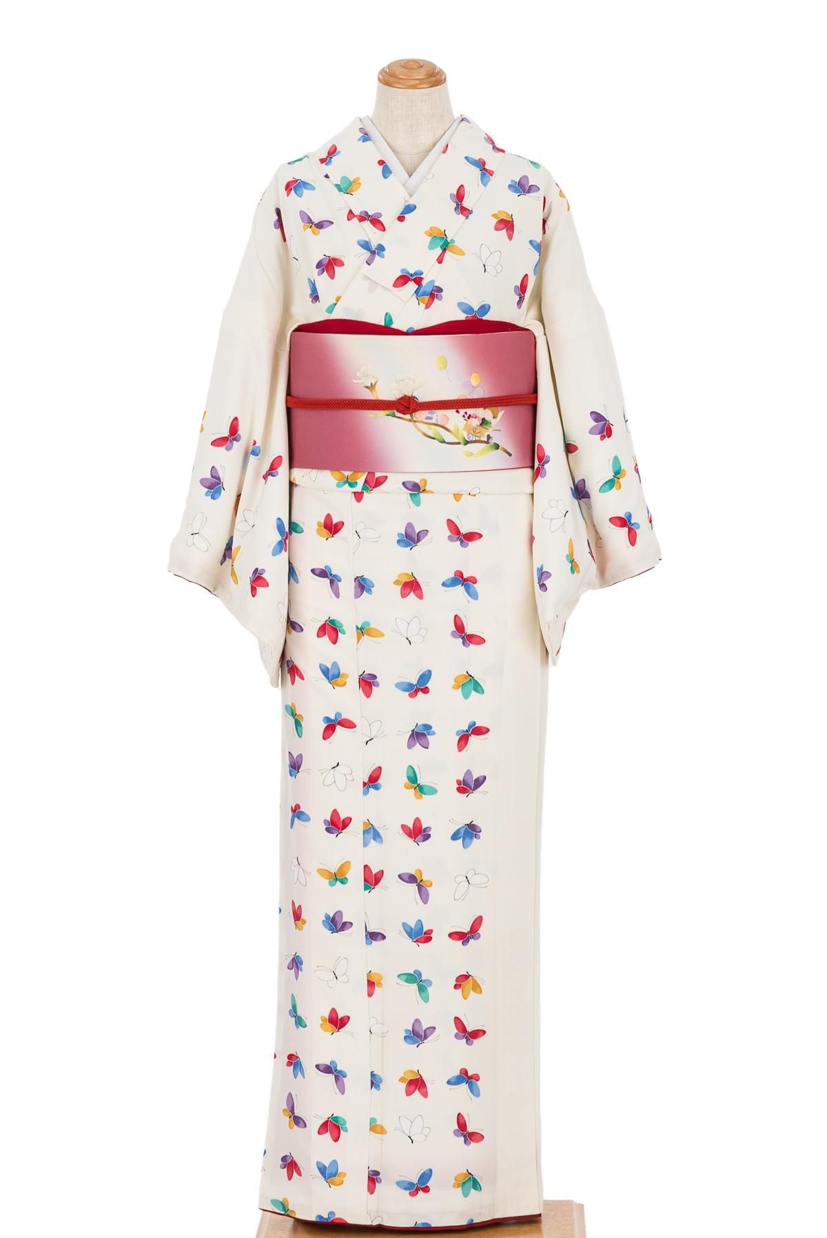 すっきりとした白色の地にカラフルな蝶々を染めた小紋の着物です。