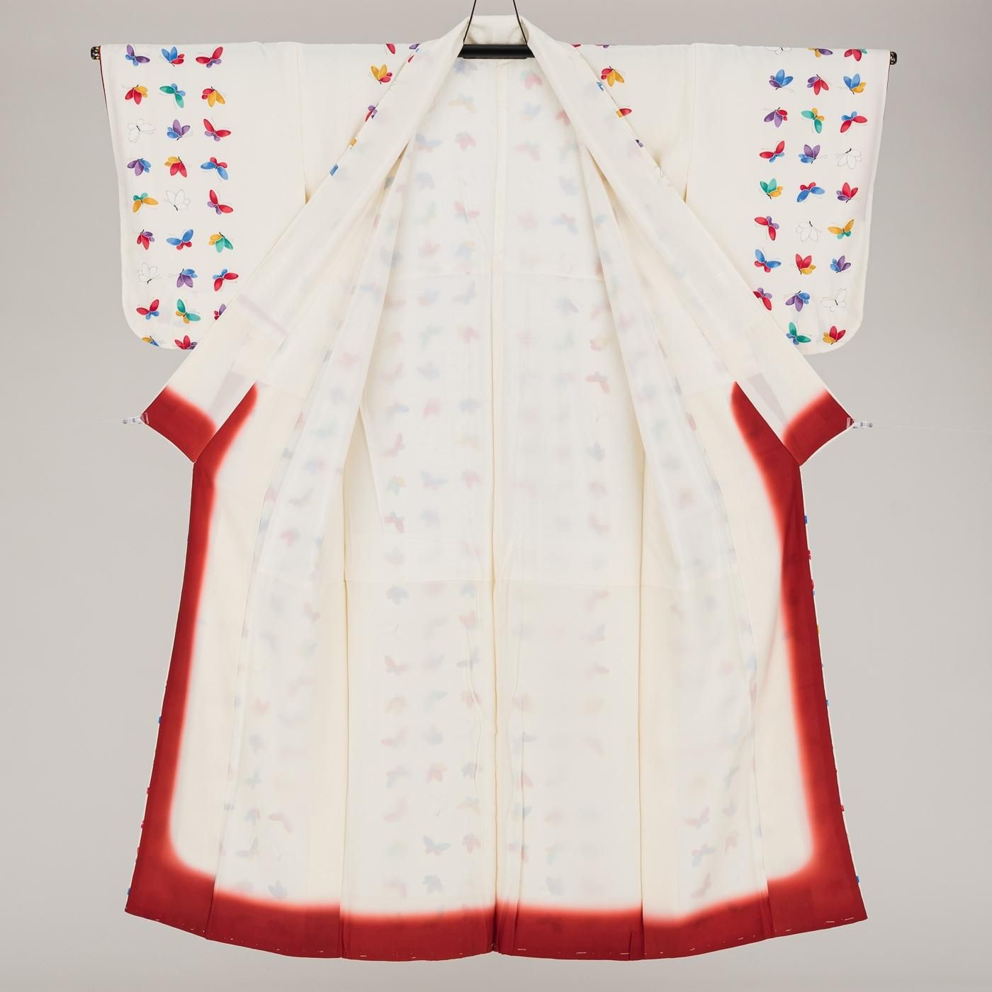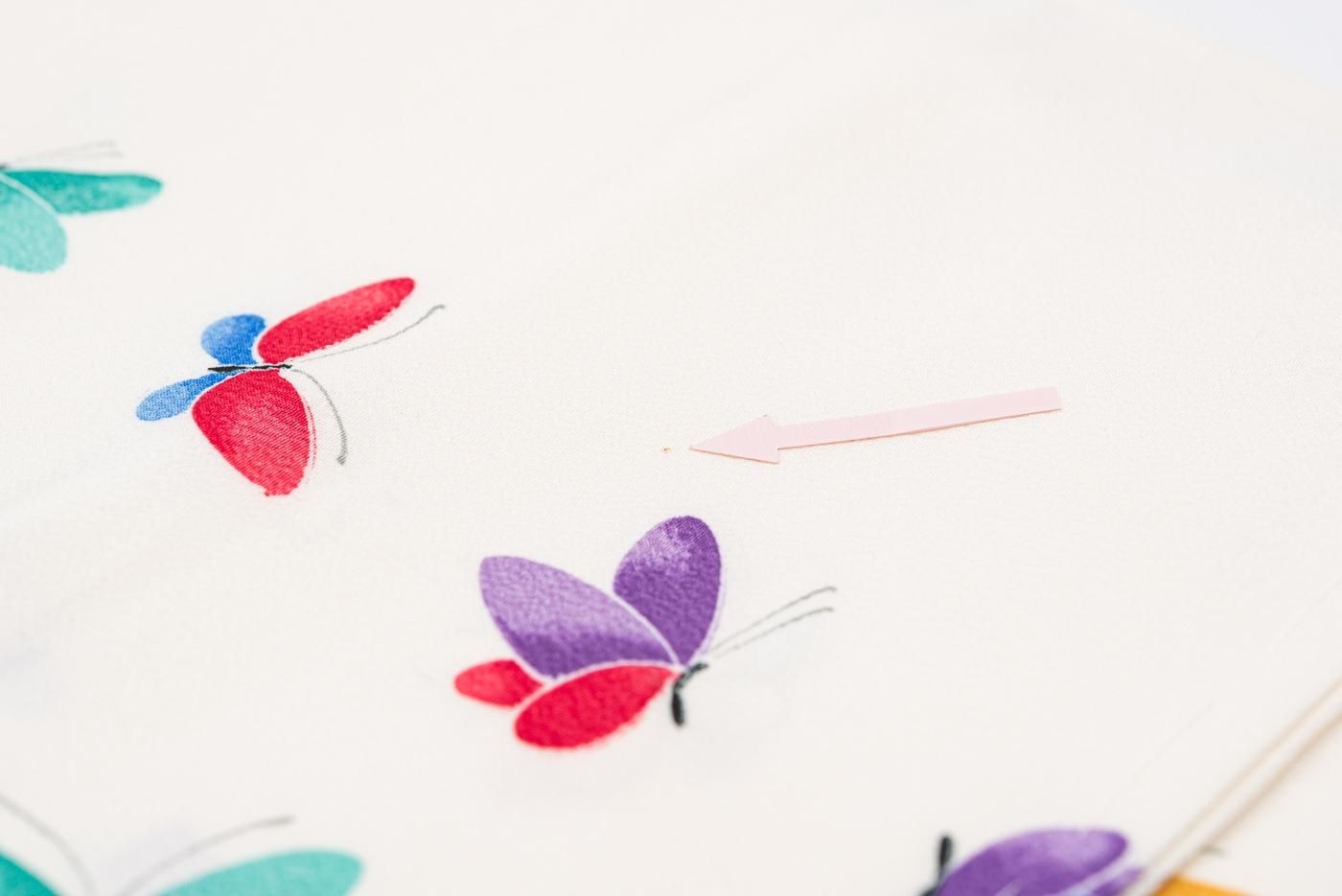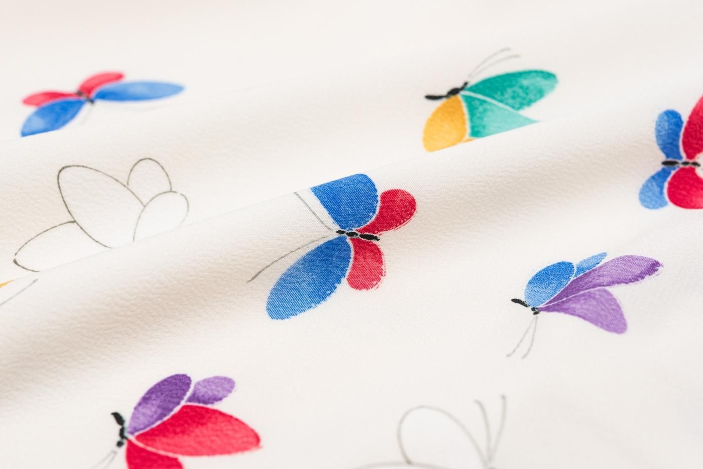 すっきりとした白色の地にカラフルな蝶々を染めた小紋の着物です。