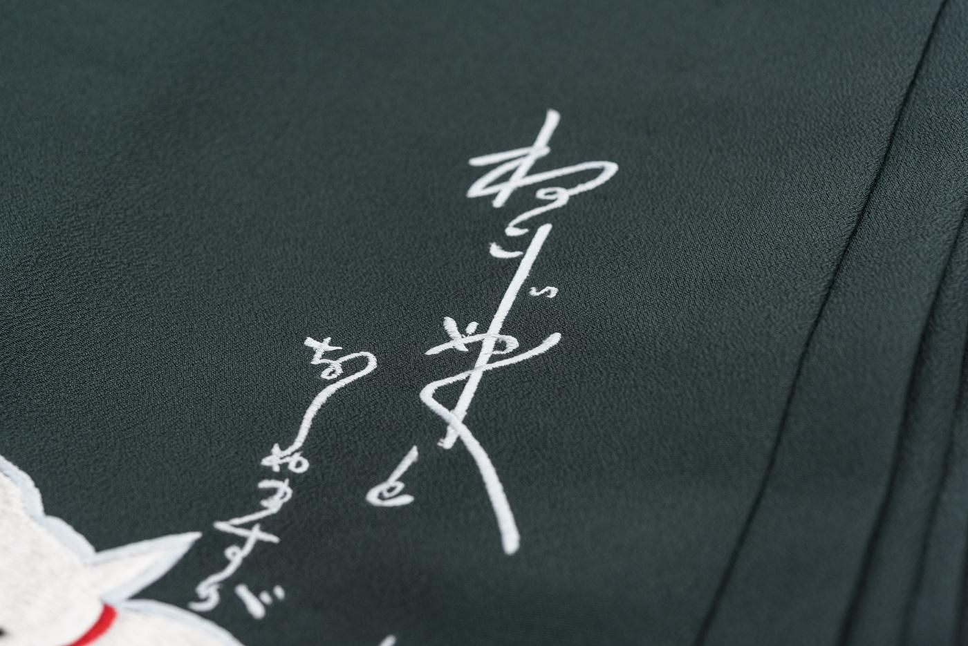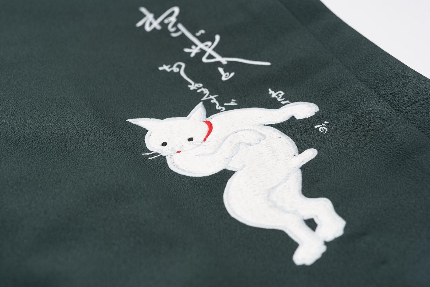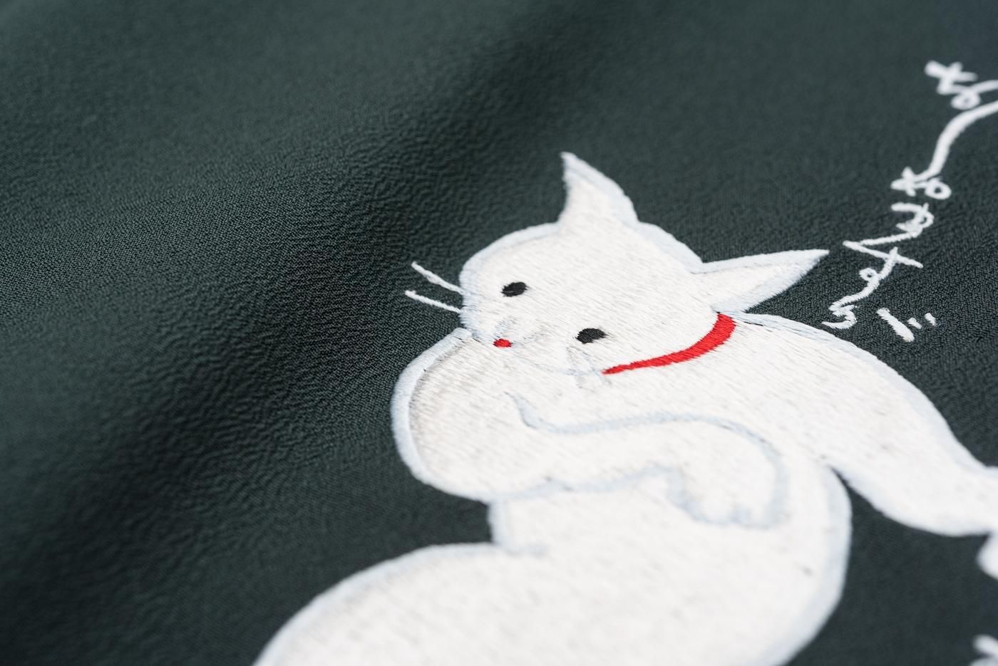 明治時代に流行した長唄に合わせて白猫がダンスをしている羽織です。