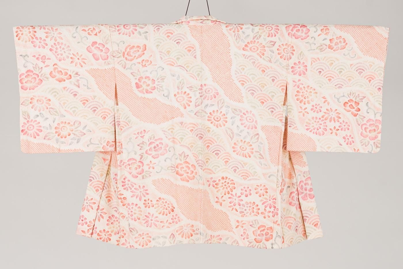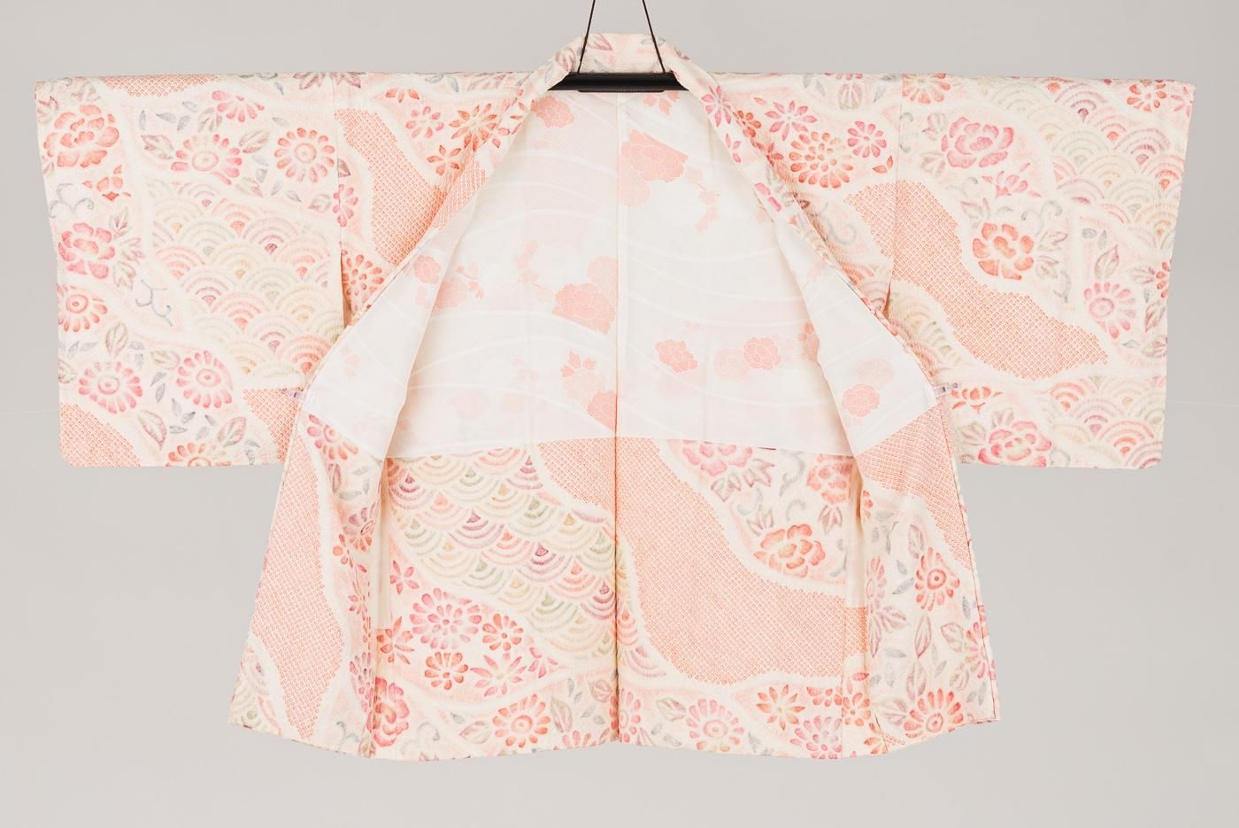 道長取りに花や青海波を添えた総絞りの絵羽織です。