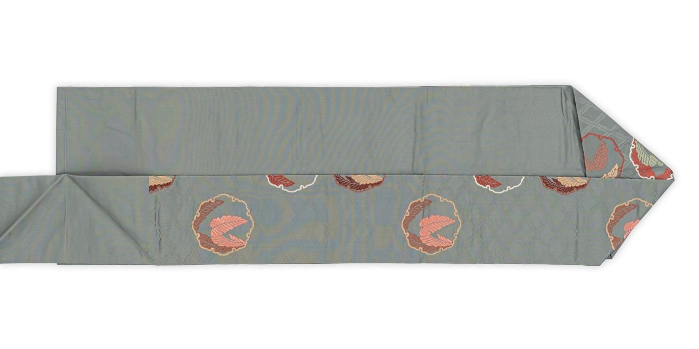 雪輪に羊歯を添えた唐織の九寸名古屋帯です。