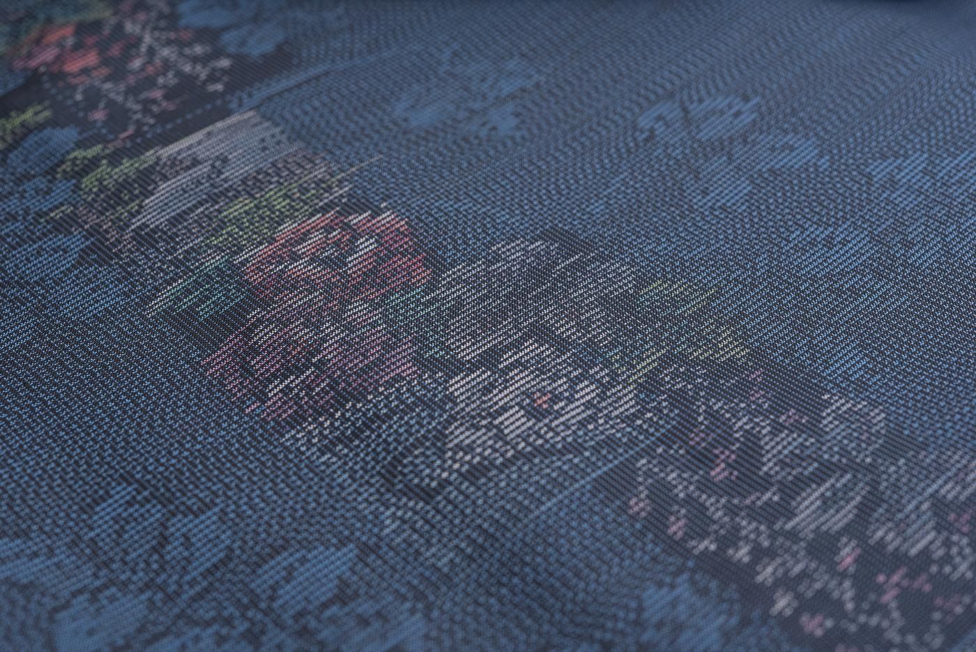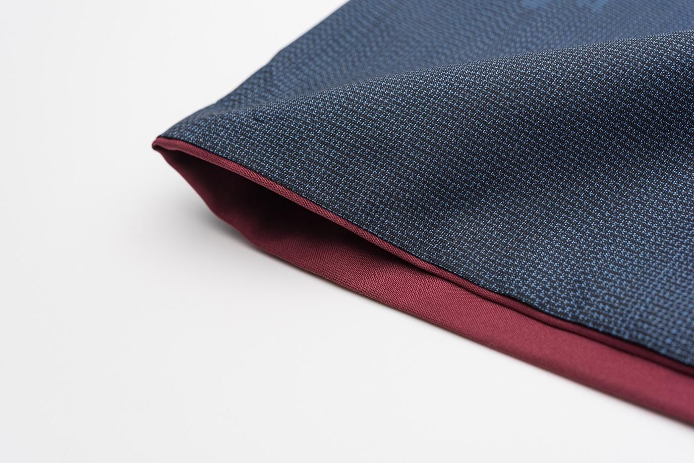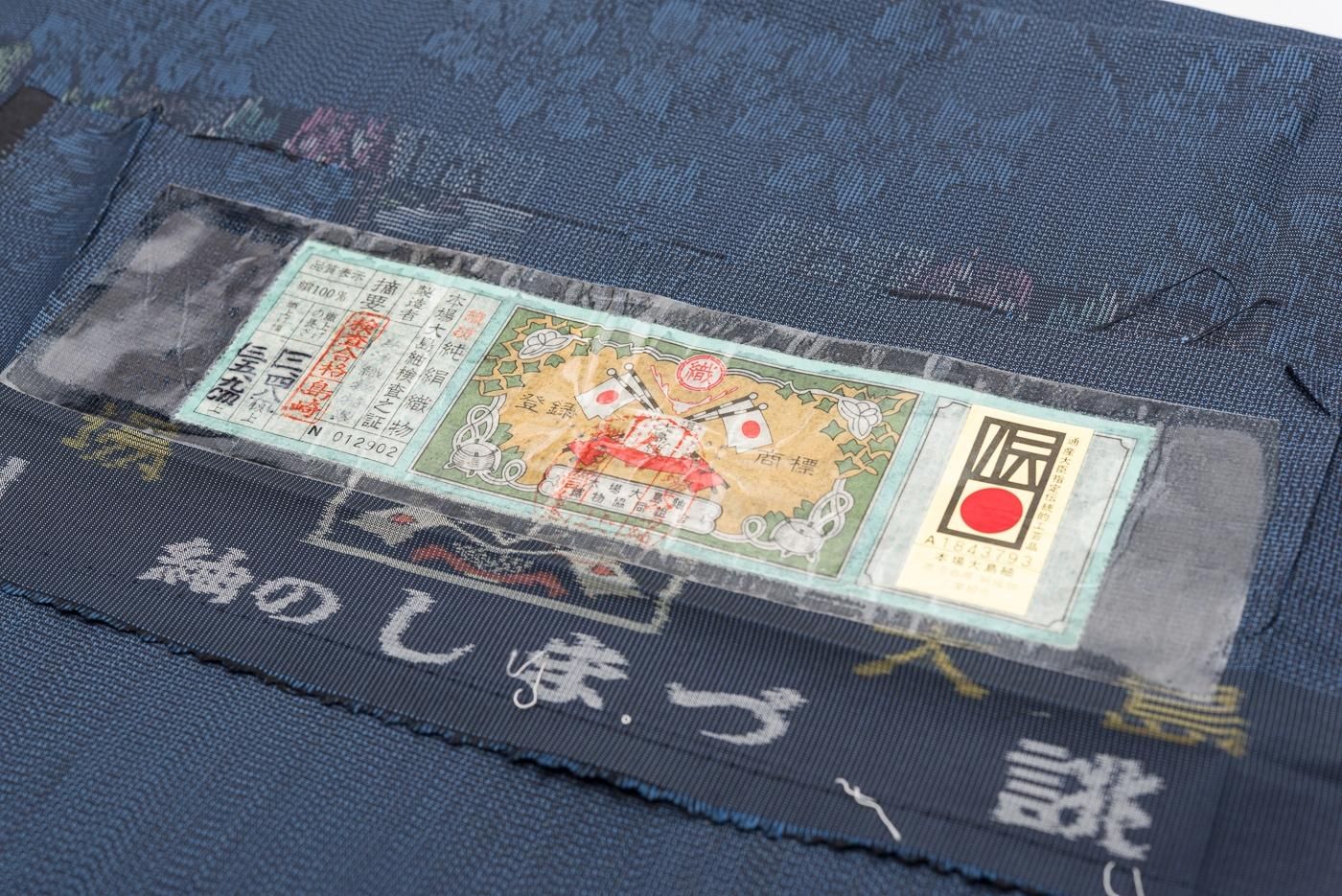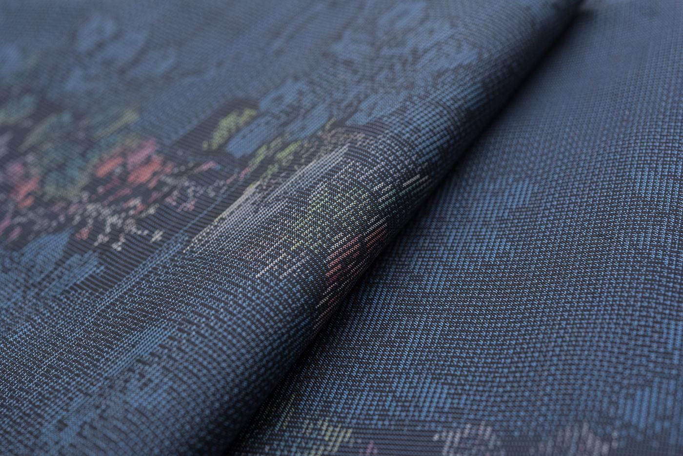 大島紬らしい藍の中に花の赤や紫がさりげなく映える大人可愛いデザインです。