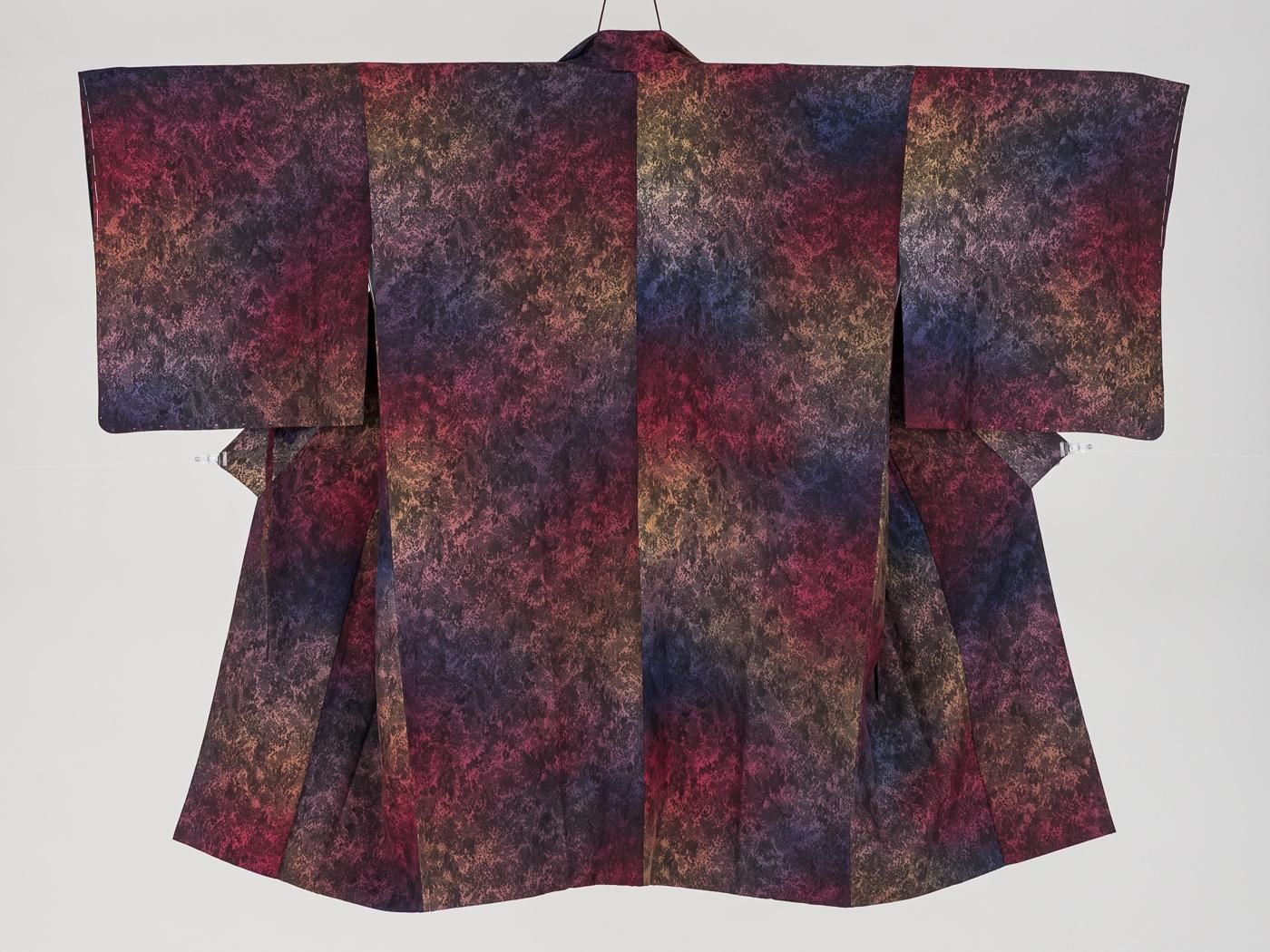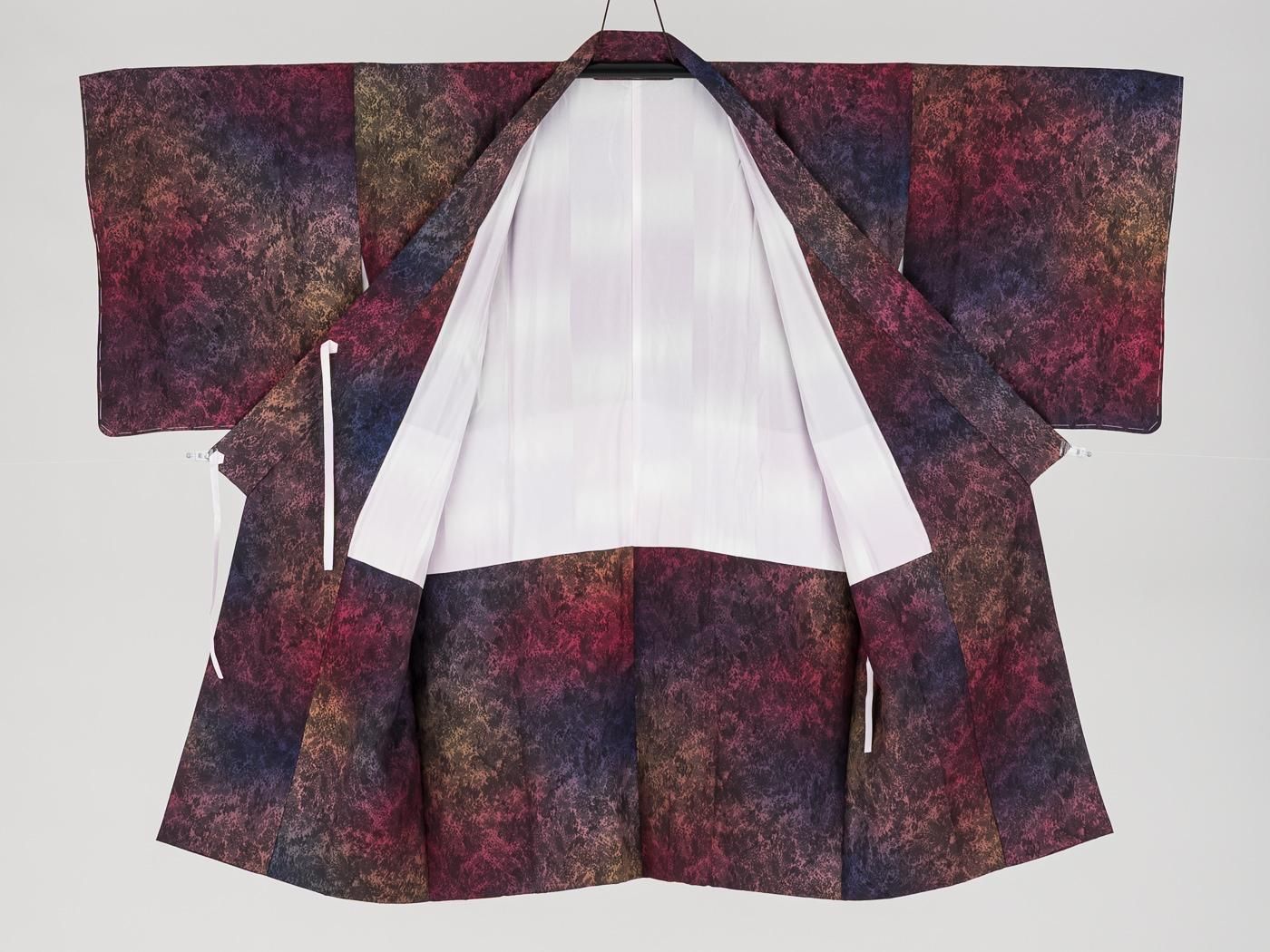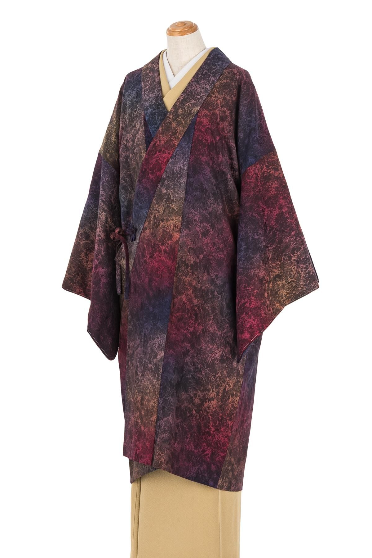 赤や紫の暈しが美しいロング丈の道中着です。