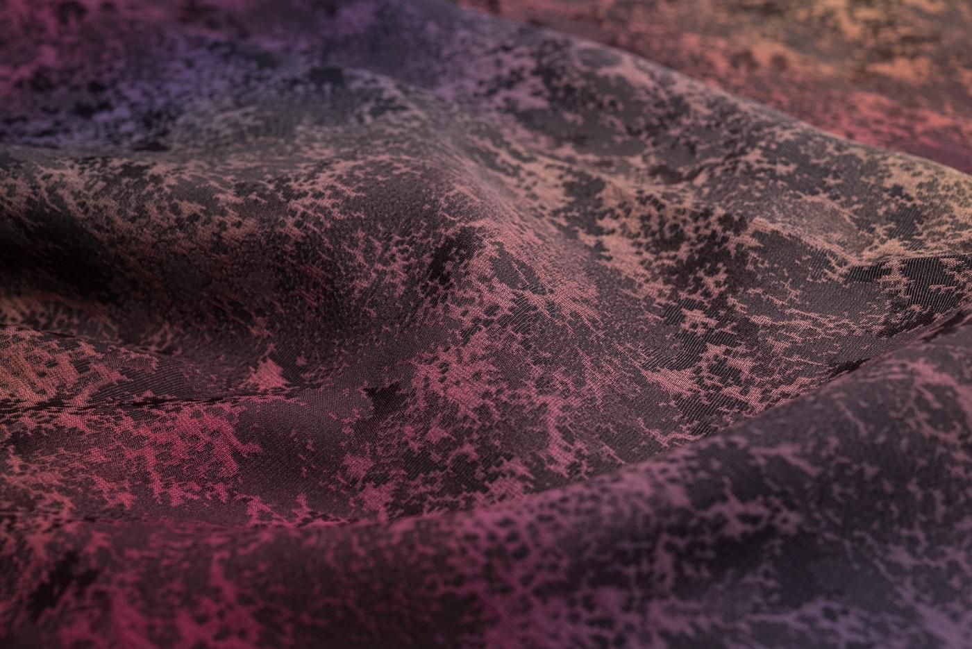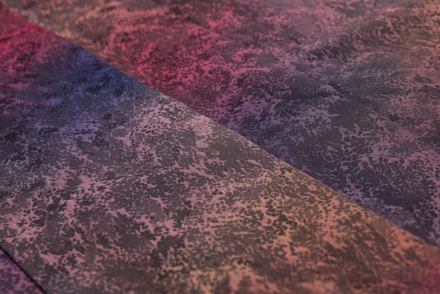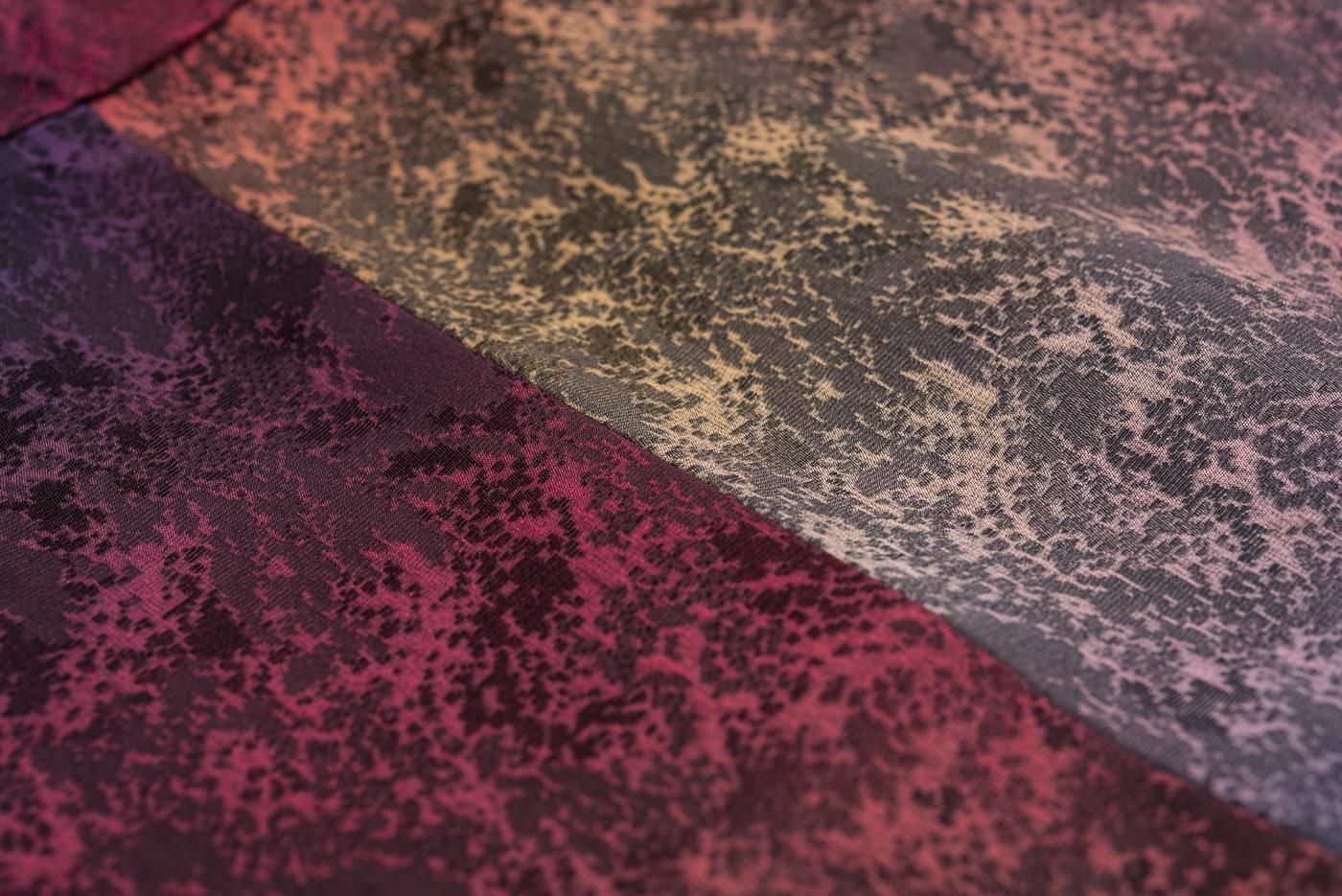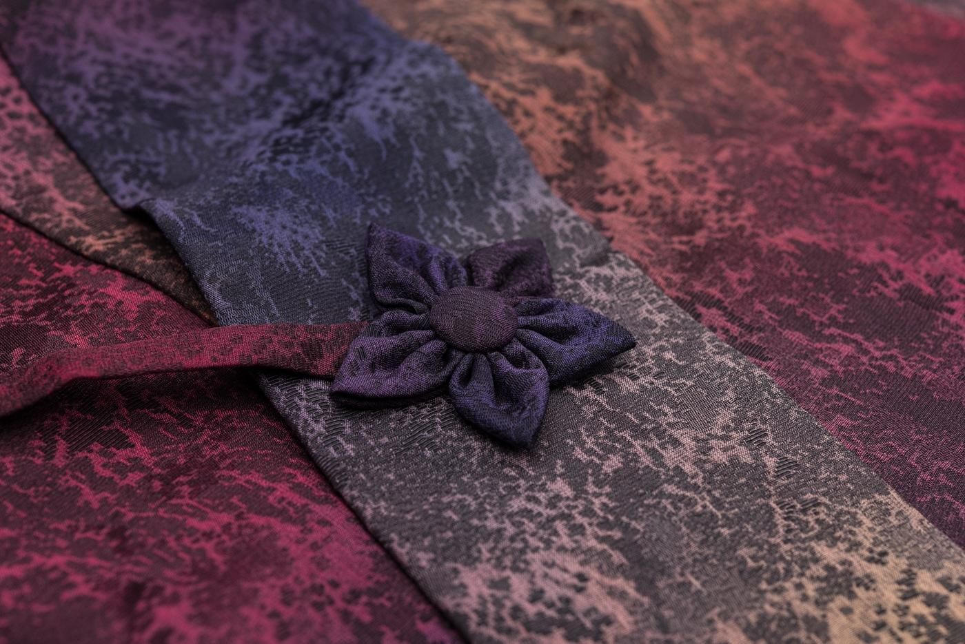 赤や紫の暈しが美しいロング丈の道中着です。