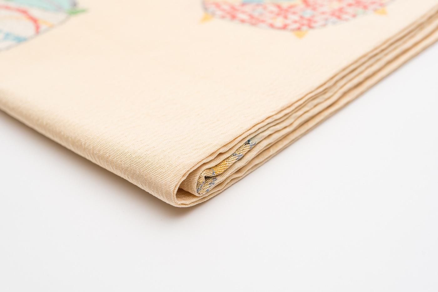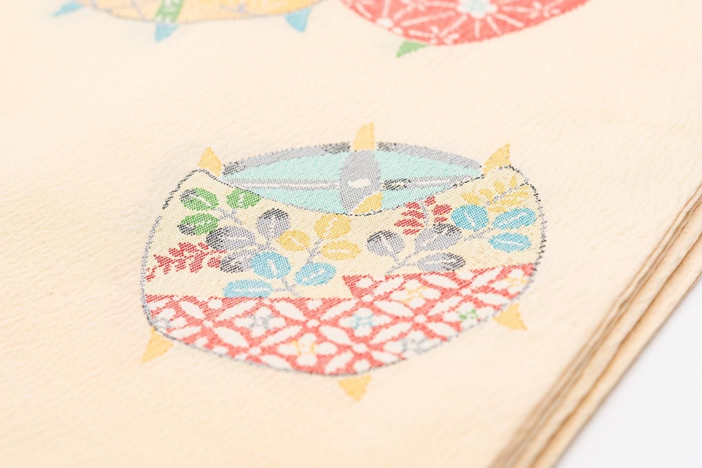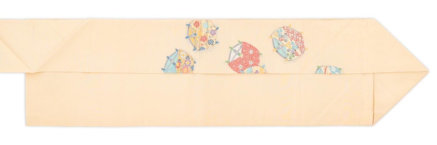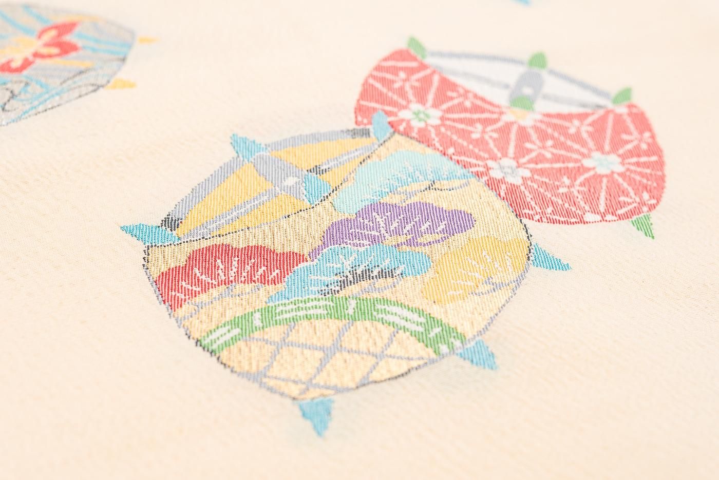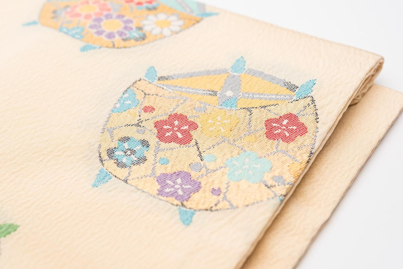 卵色の地に糸巻き模様を織り出した九寸名古屋帯です。