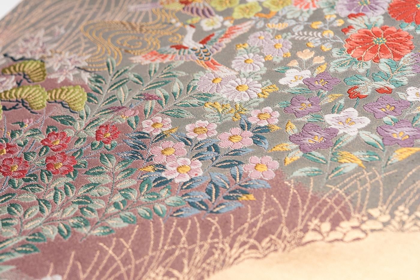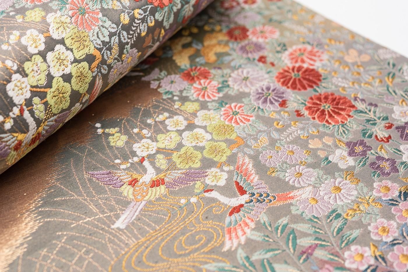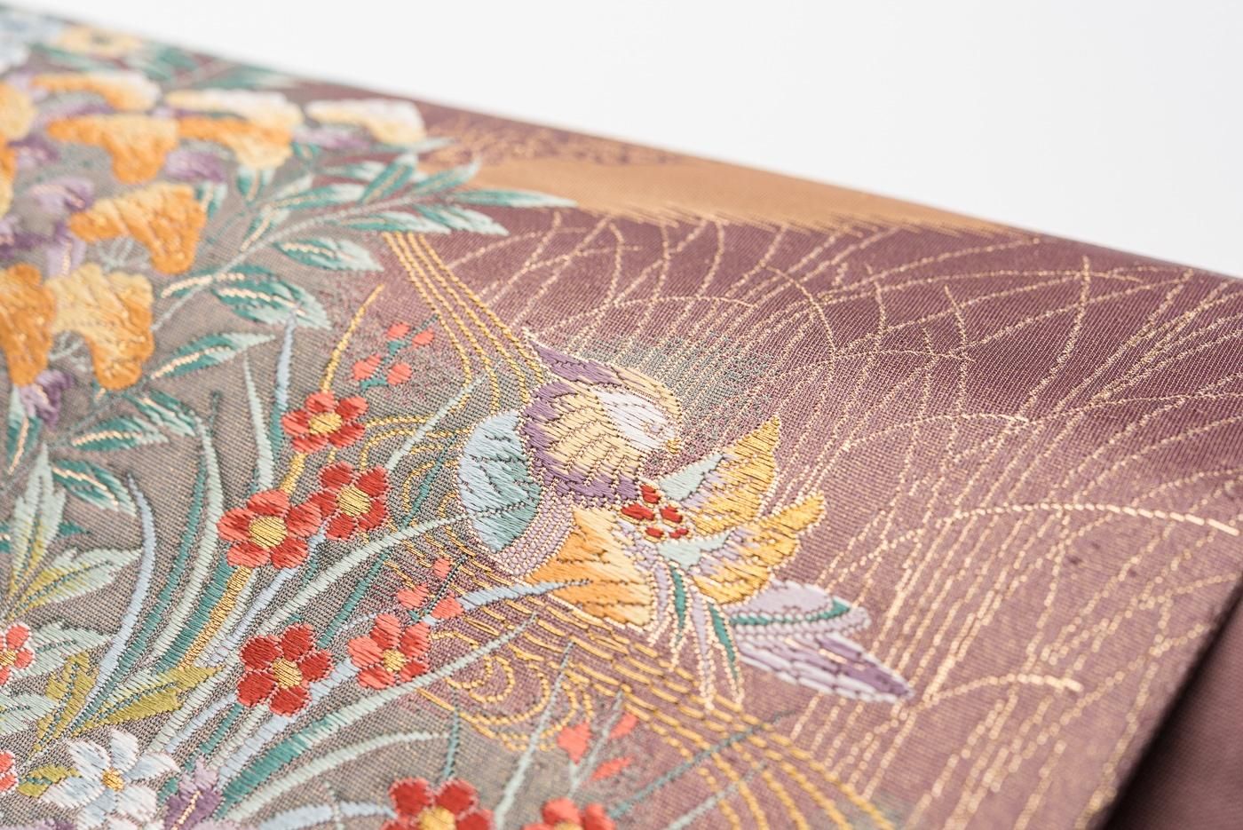 色鮮やかな花鳥模様を織り出した袋帯です。