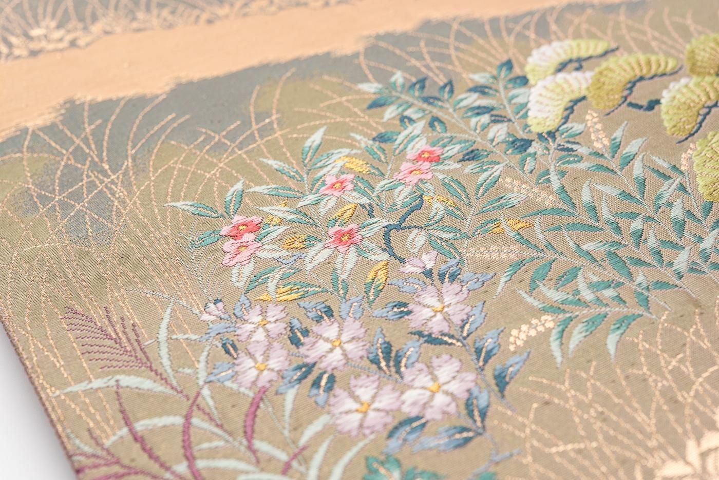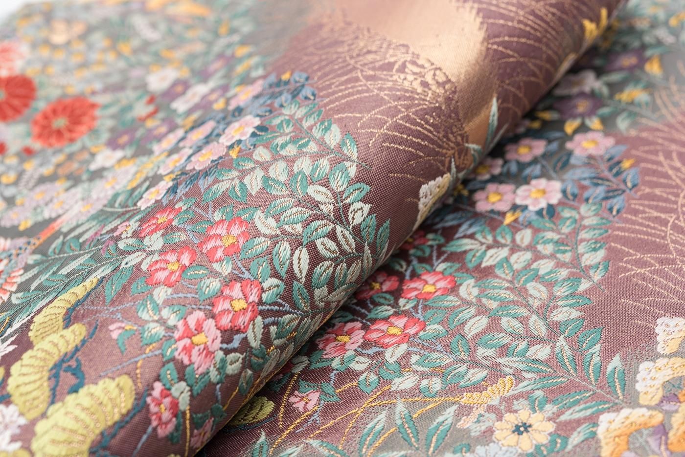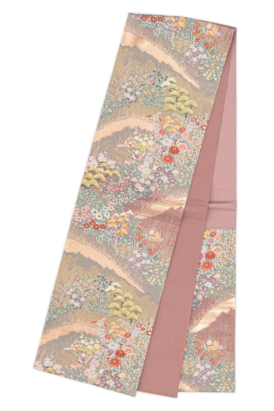 色鮮やかな花鳥模様を織り出した袋帯です。