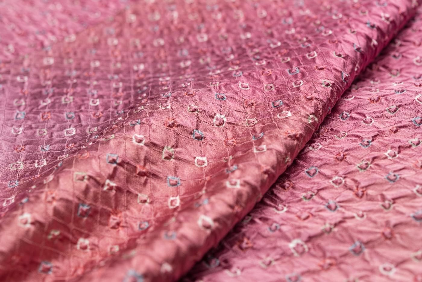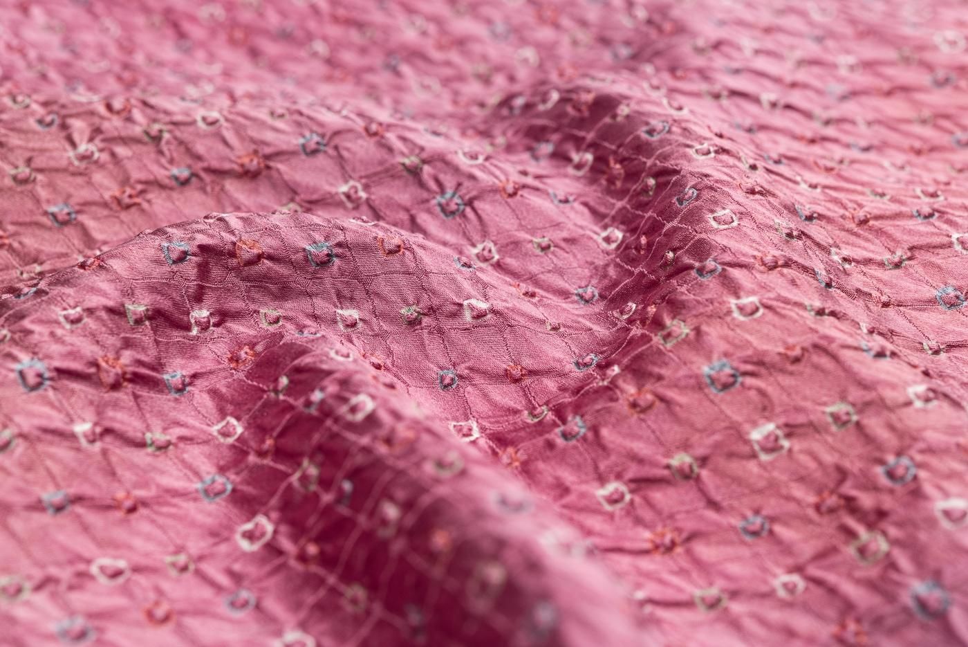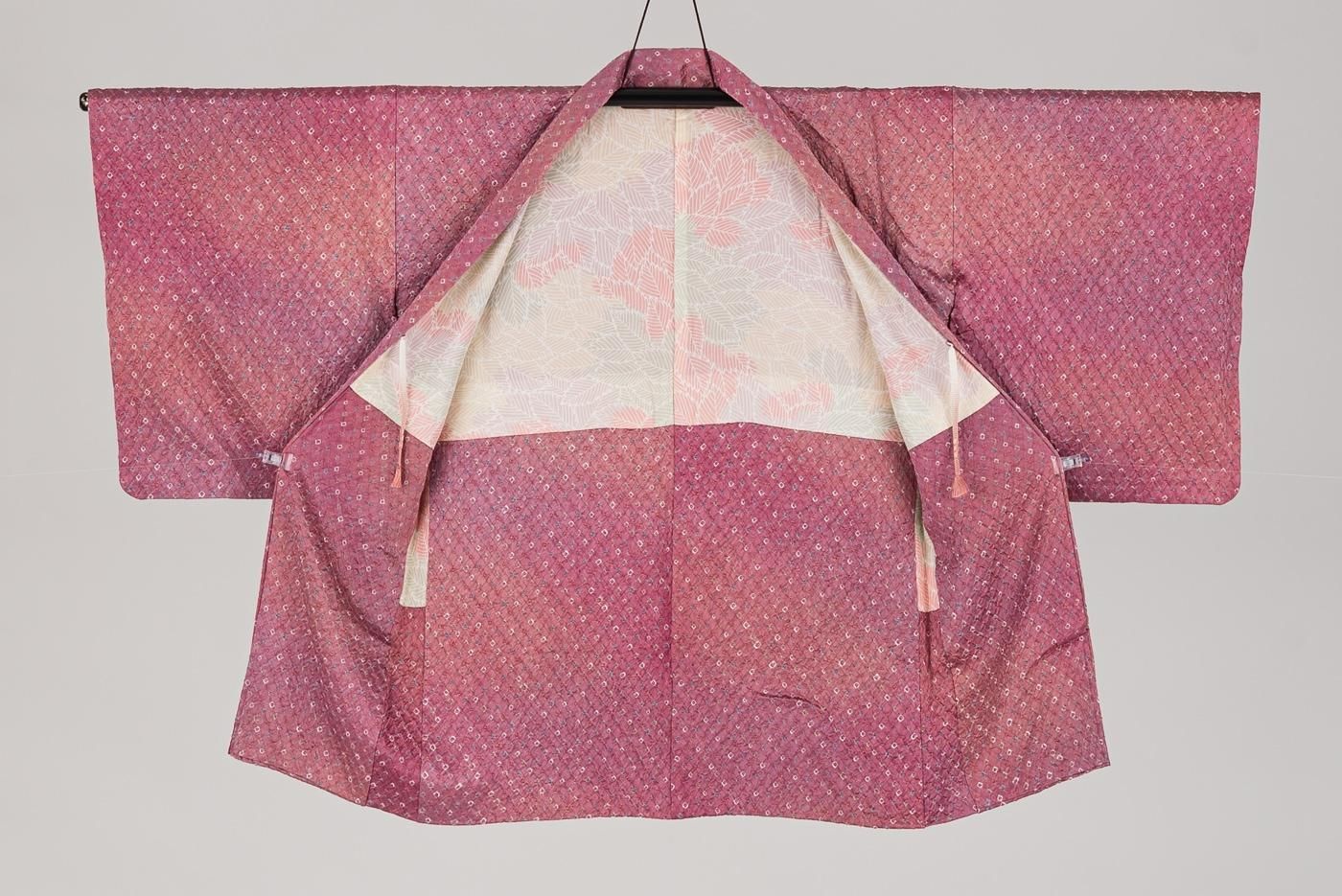 チェリーピンクの暈し地に小さなドットが浮かぶ絞りの羽織です。