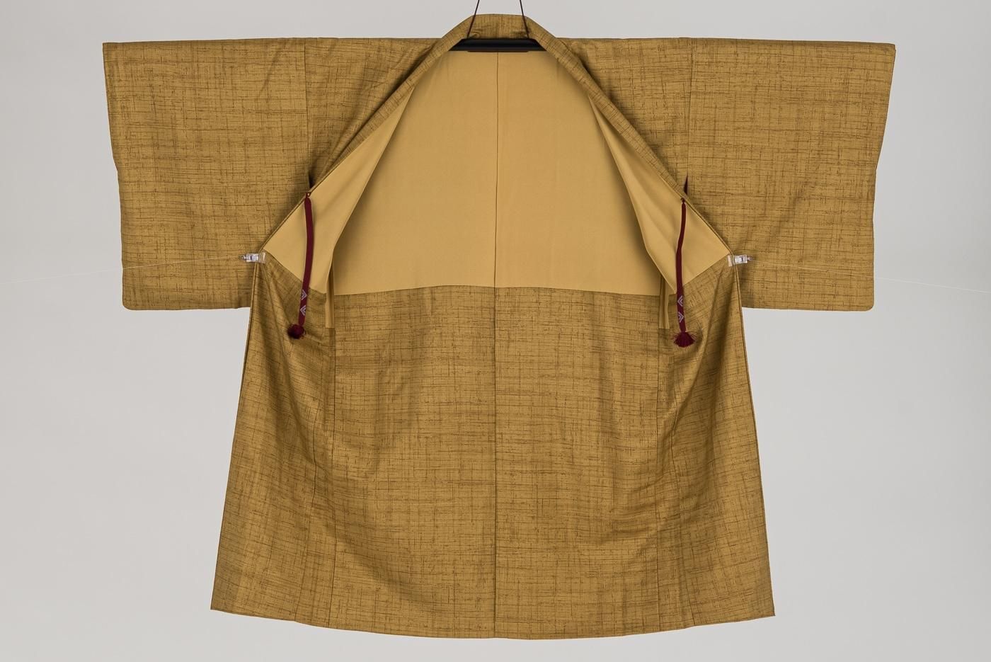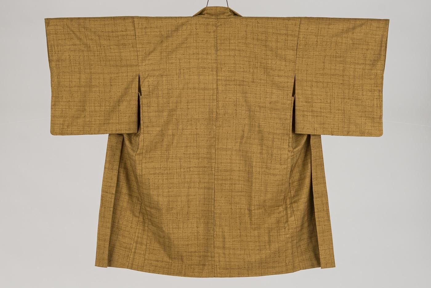 黄土色の地に乱れ格子柄を染めた紬地の長羽織です。