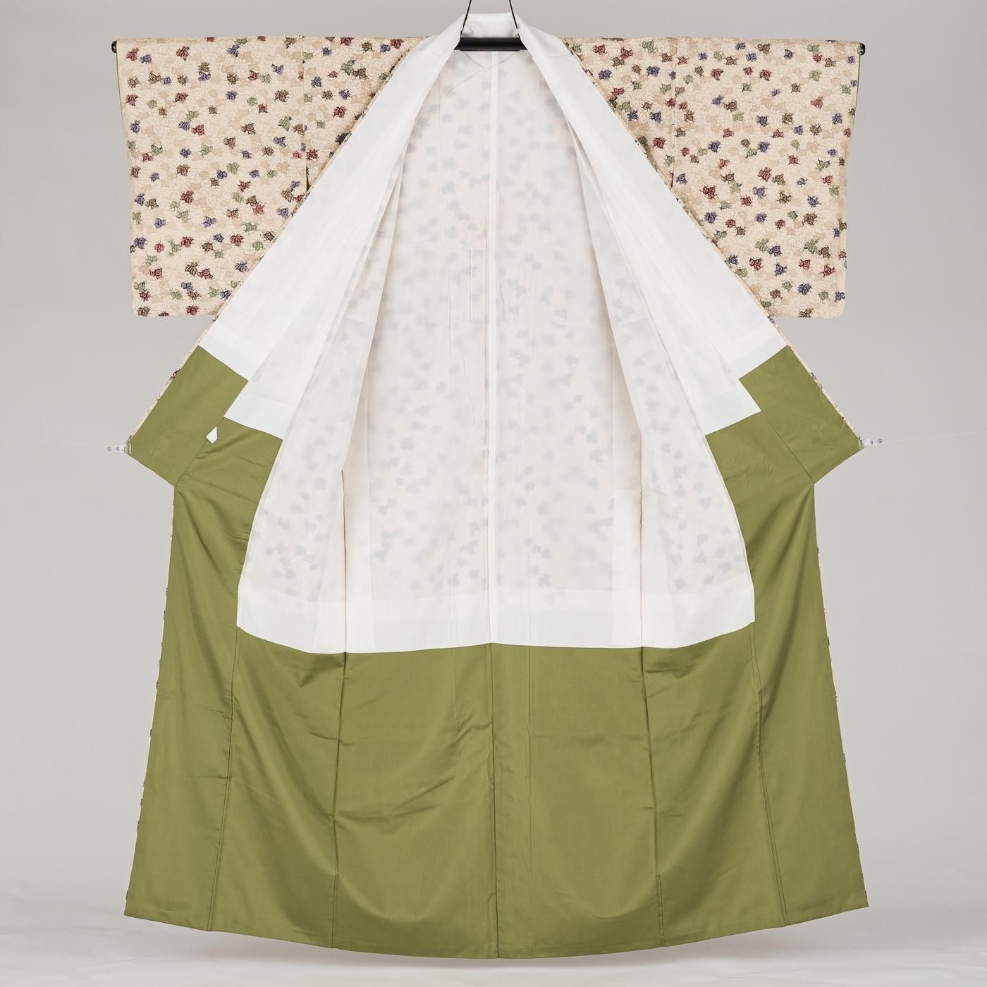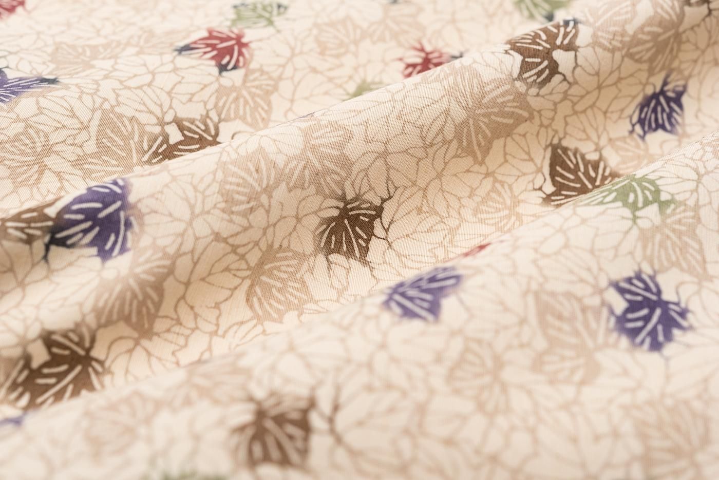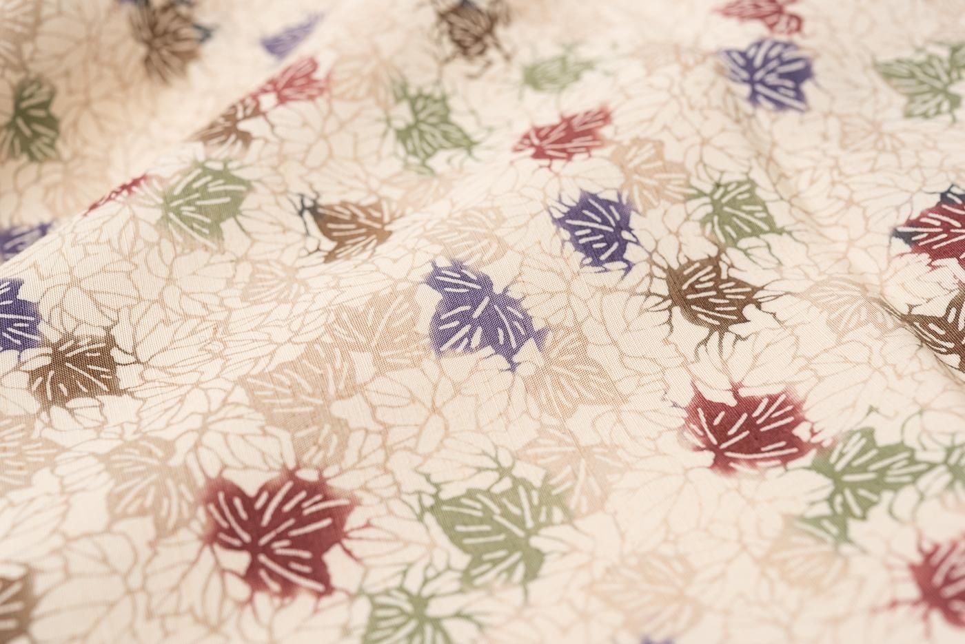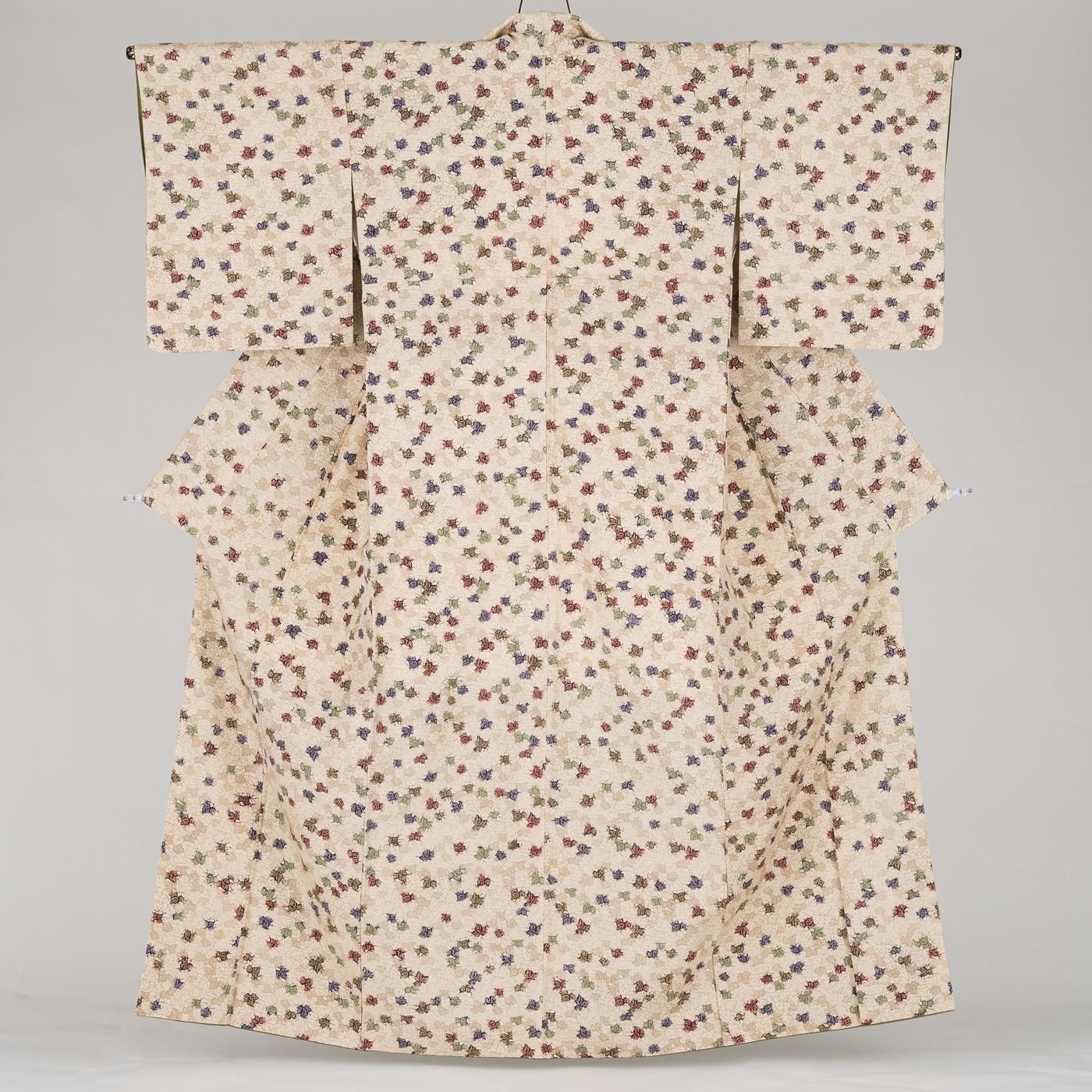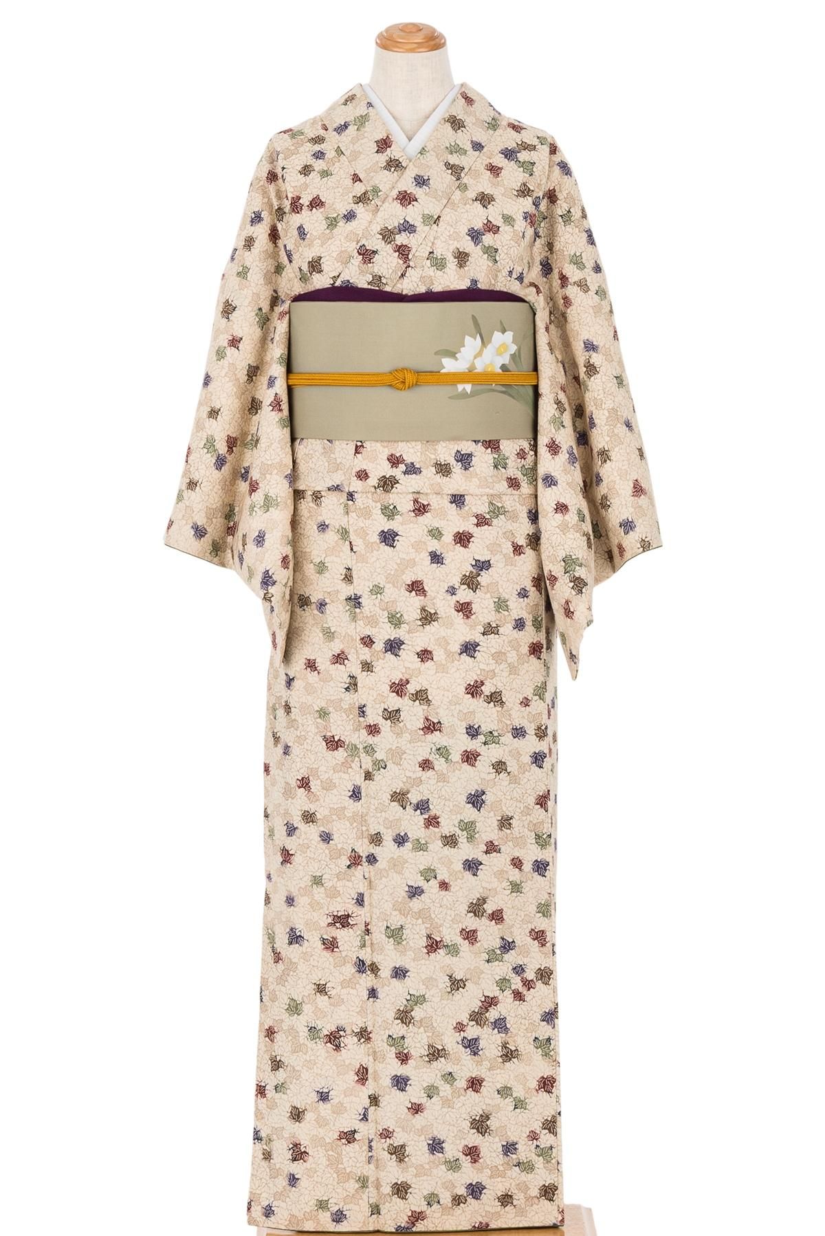 淡いベージュの紬地に蔦の葉模様を染めた着物です。