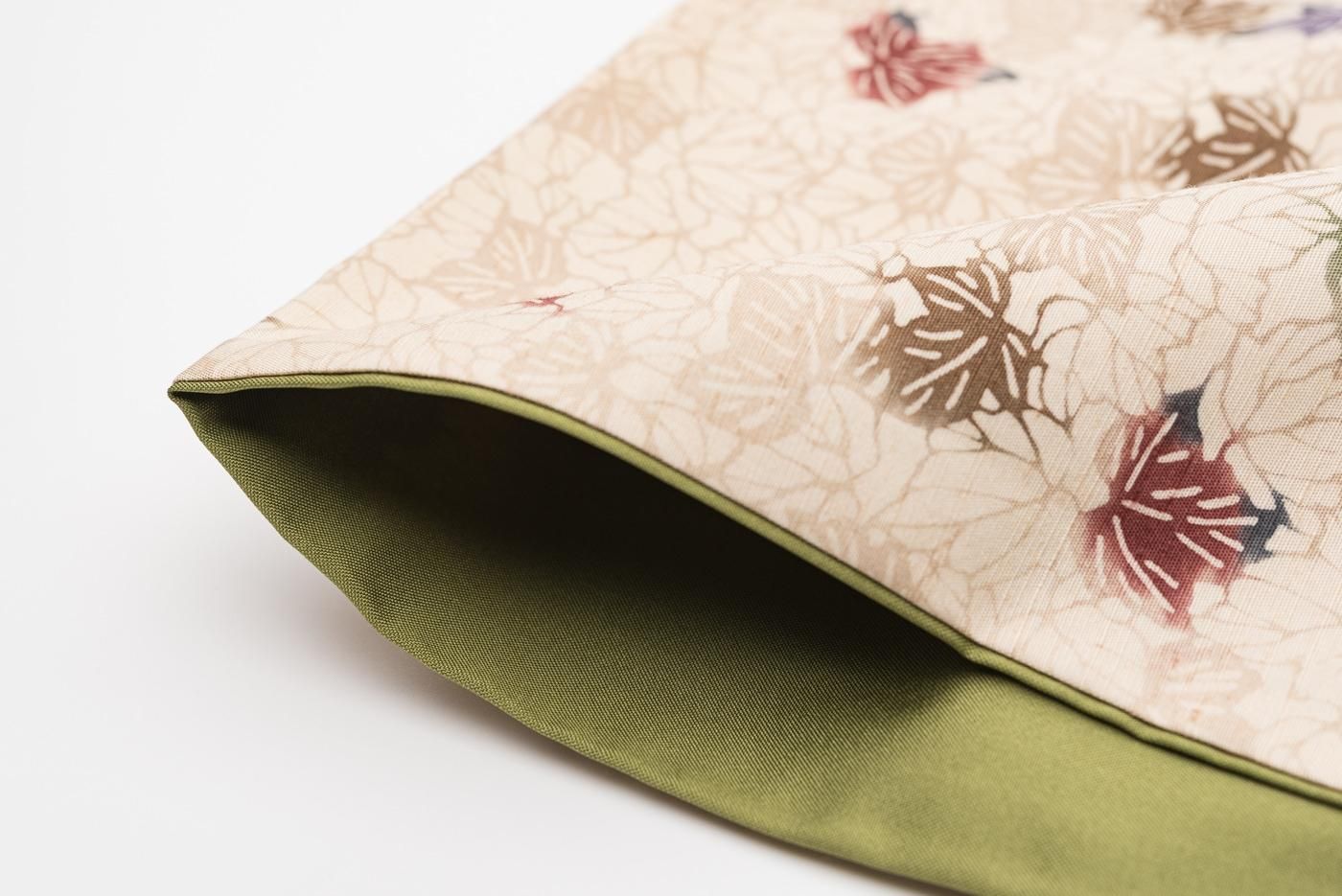 茶を基調に紫、緑、赤などの色をポイントに指したデザインはさりげなく可愛い雰囲気です。