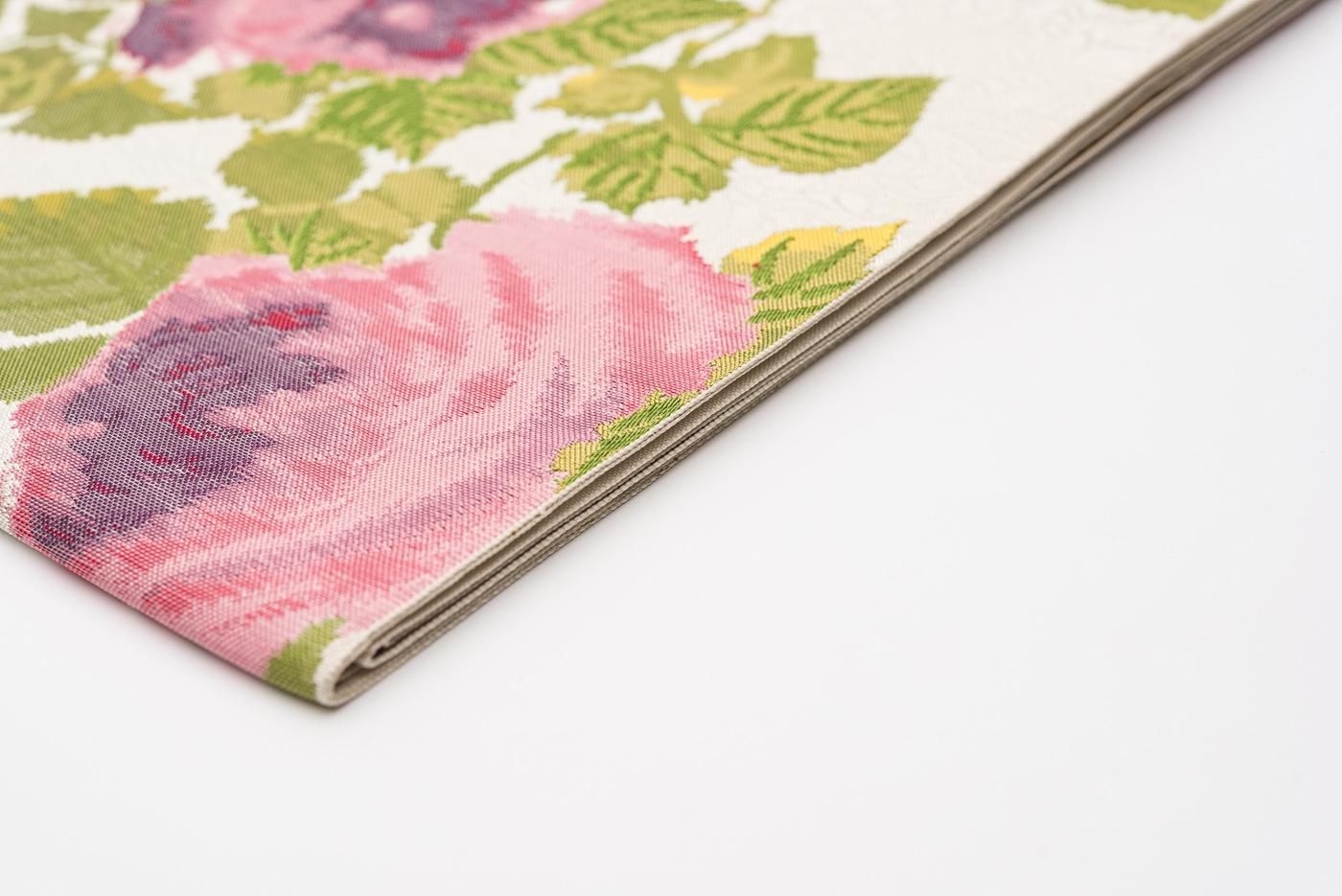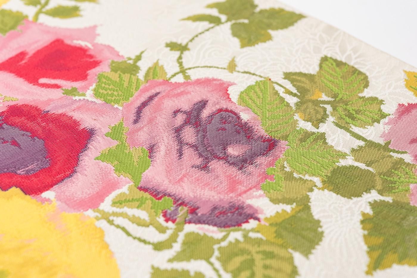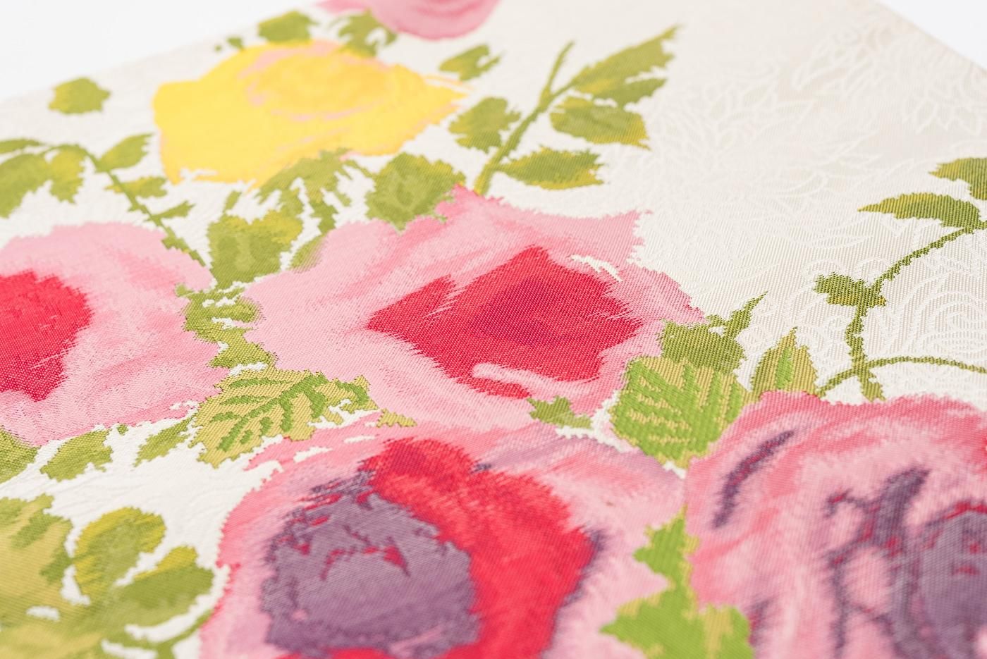 ピンクや黄色の薔薇を織り出した本場筑前博多織の八寸名古屋帯です。