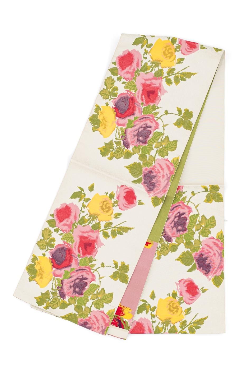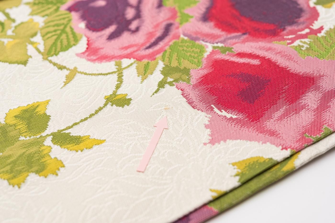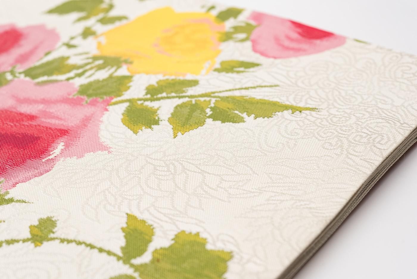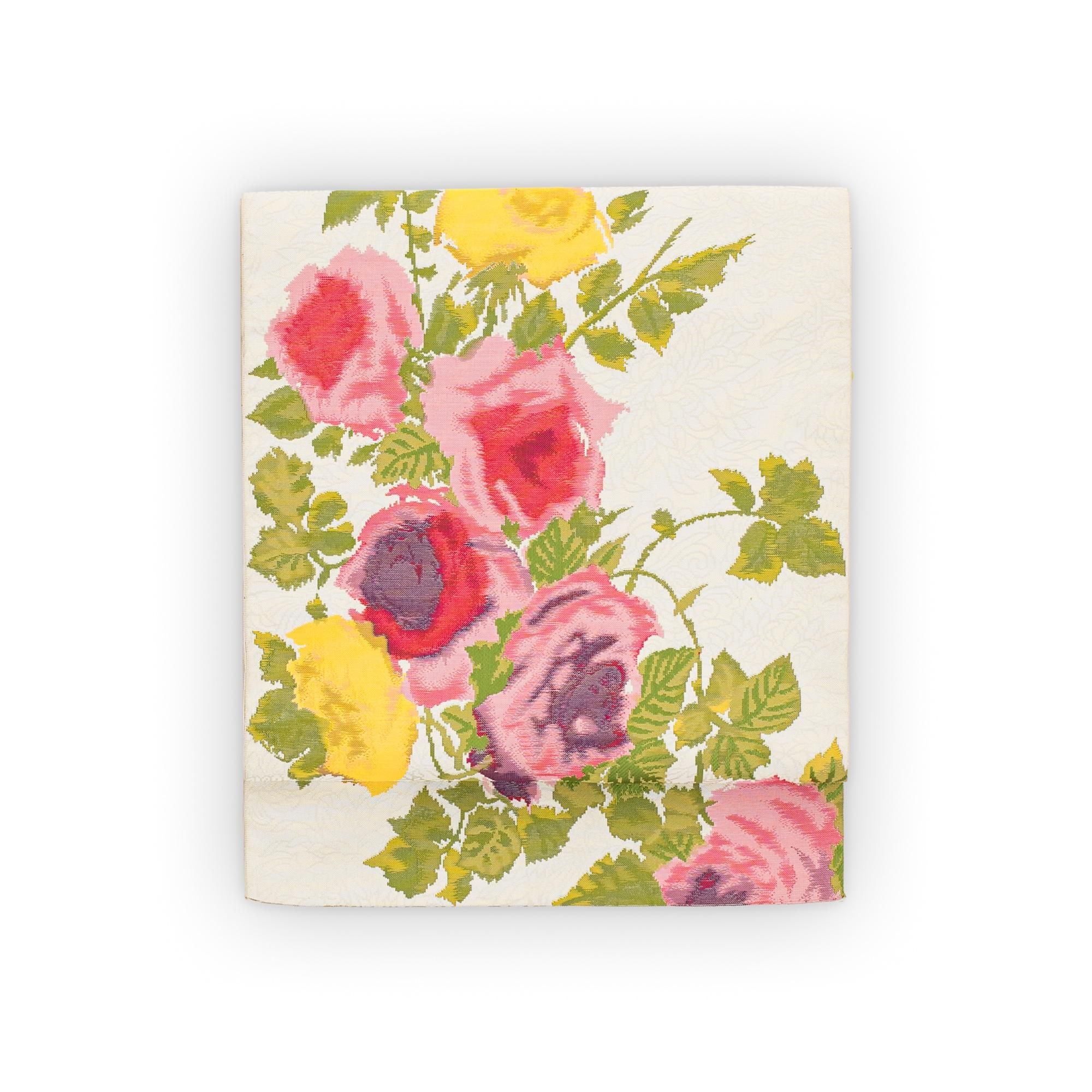 ピンクや黄色の薔薇を織り出した本場筑前博多織の八寸名古屋帯です。