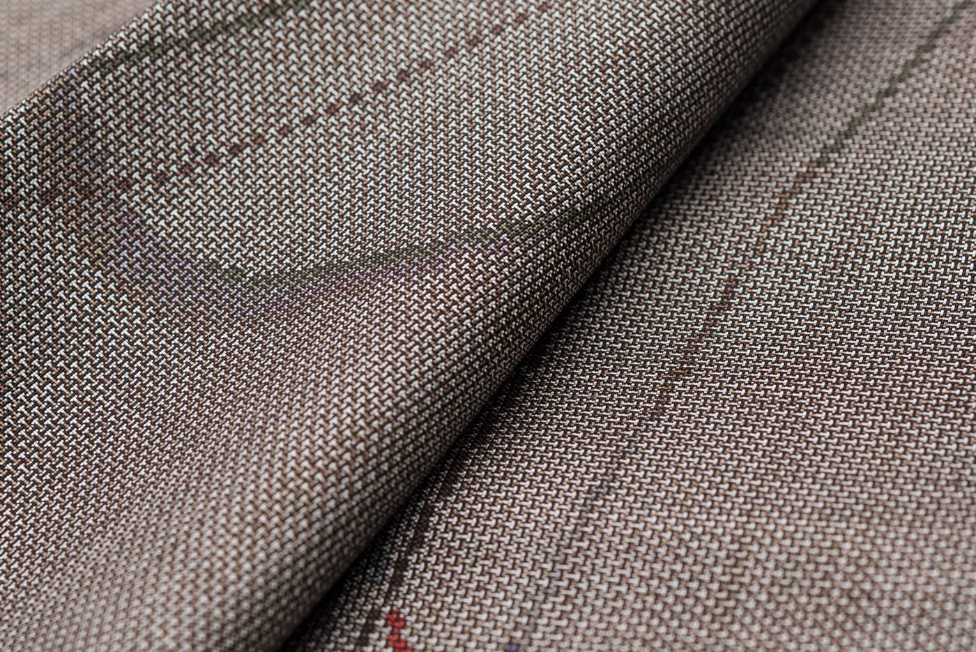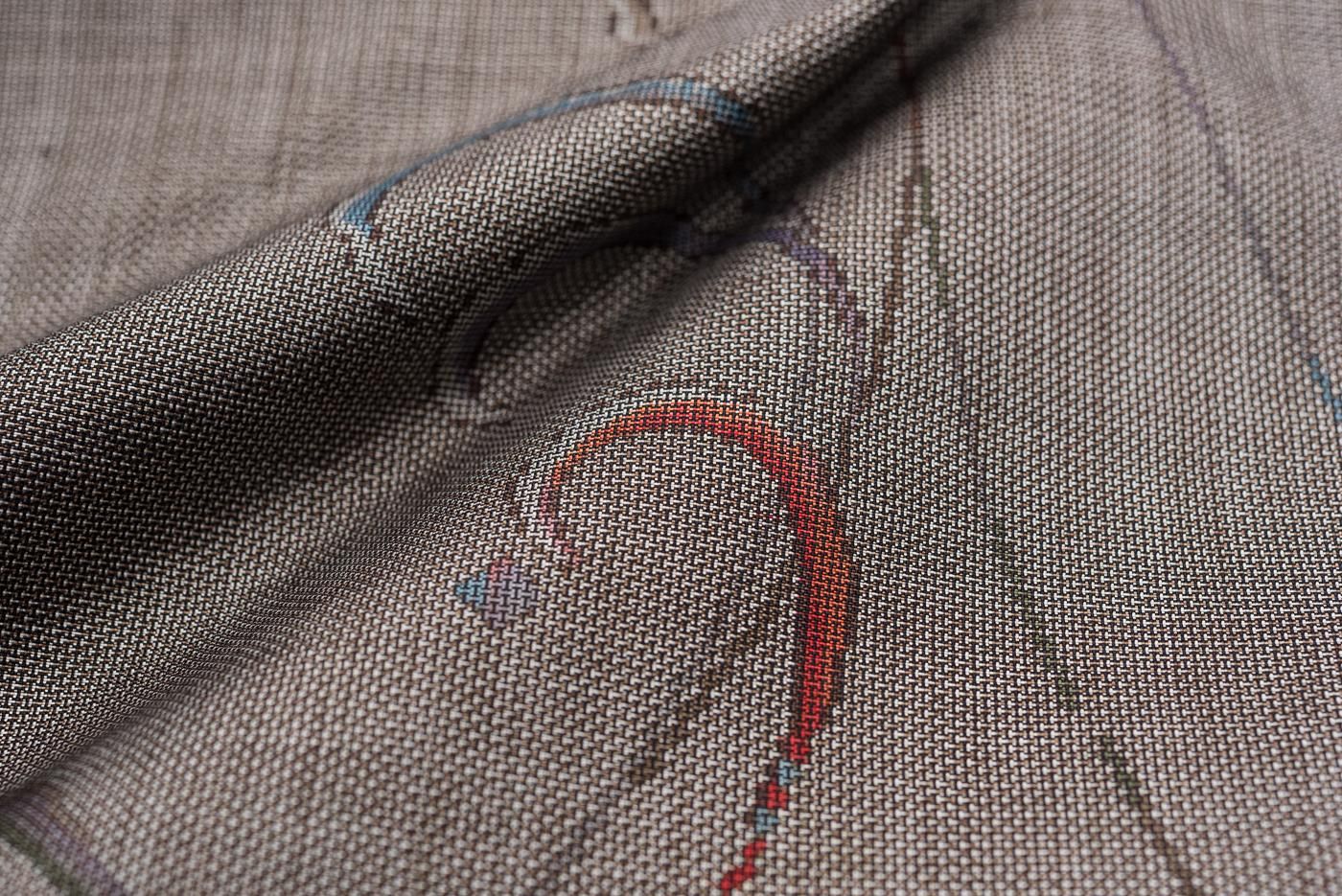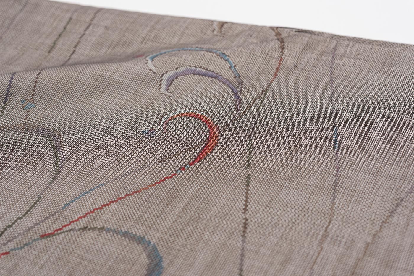 くるんと弧を描く流線模様を織り出した大島紬の着物です。