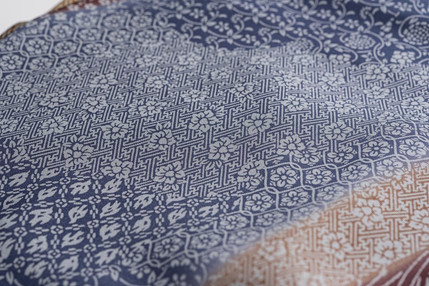 七宝、吹き寄せ、紗綾型など様々な柄をパズルのように組み合わせた華やかで洒落たデザインです。