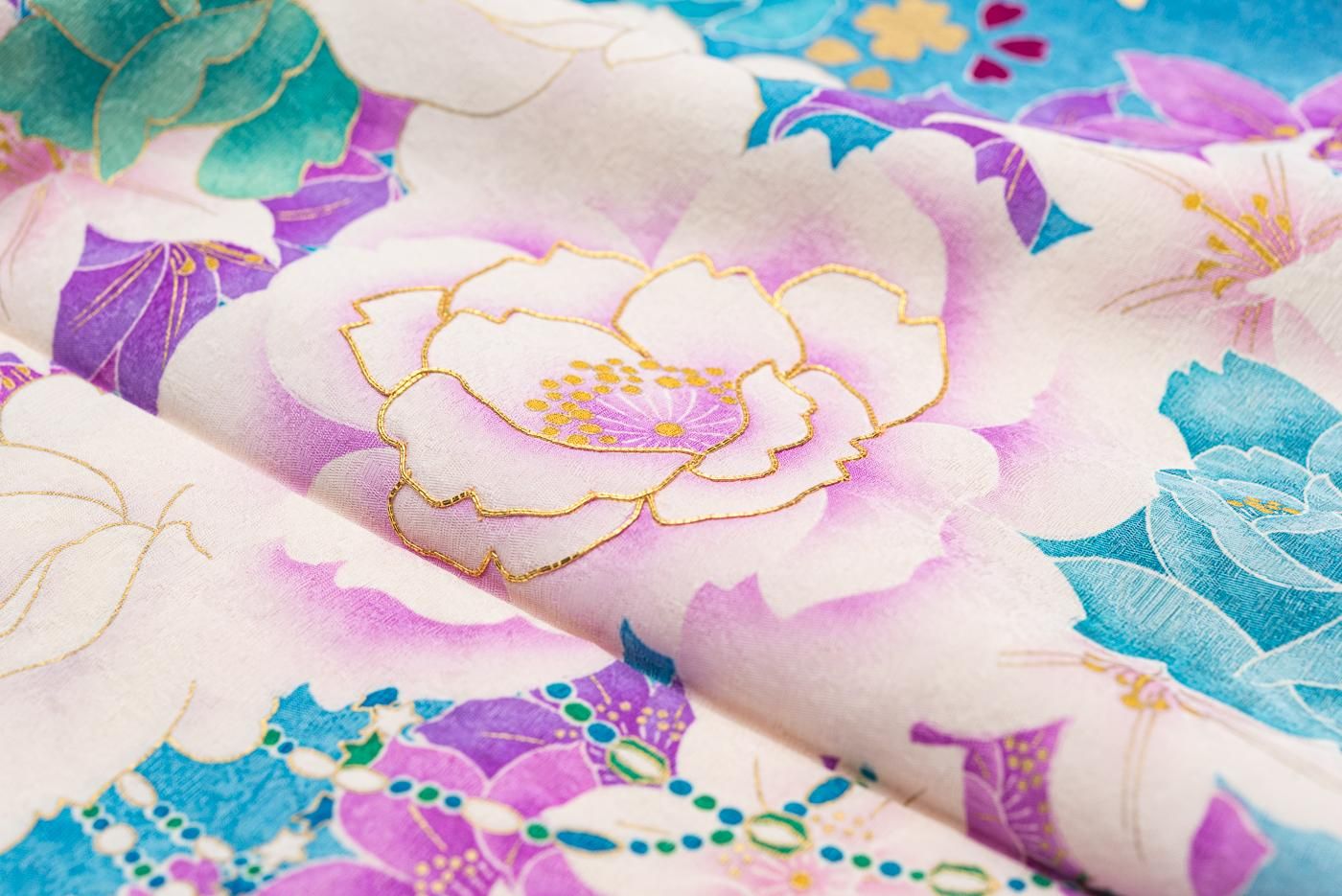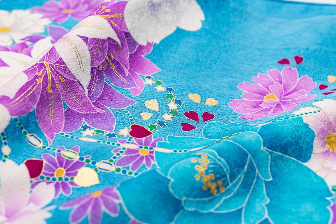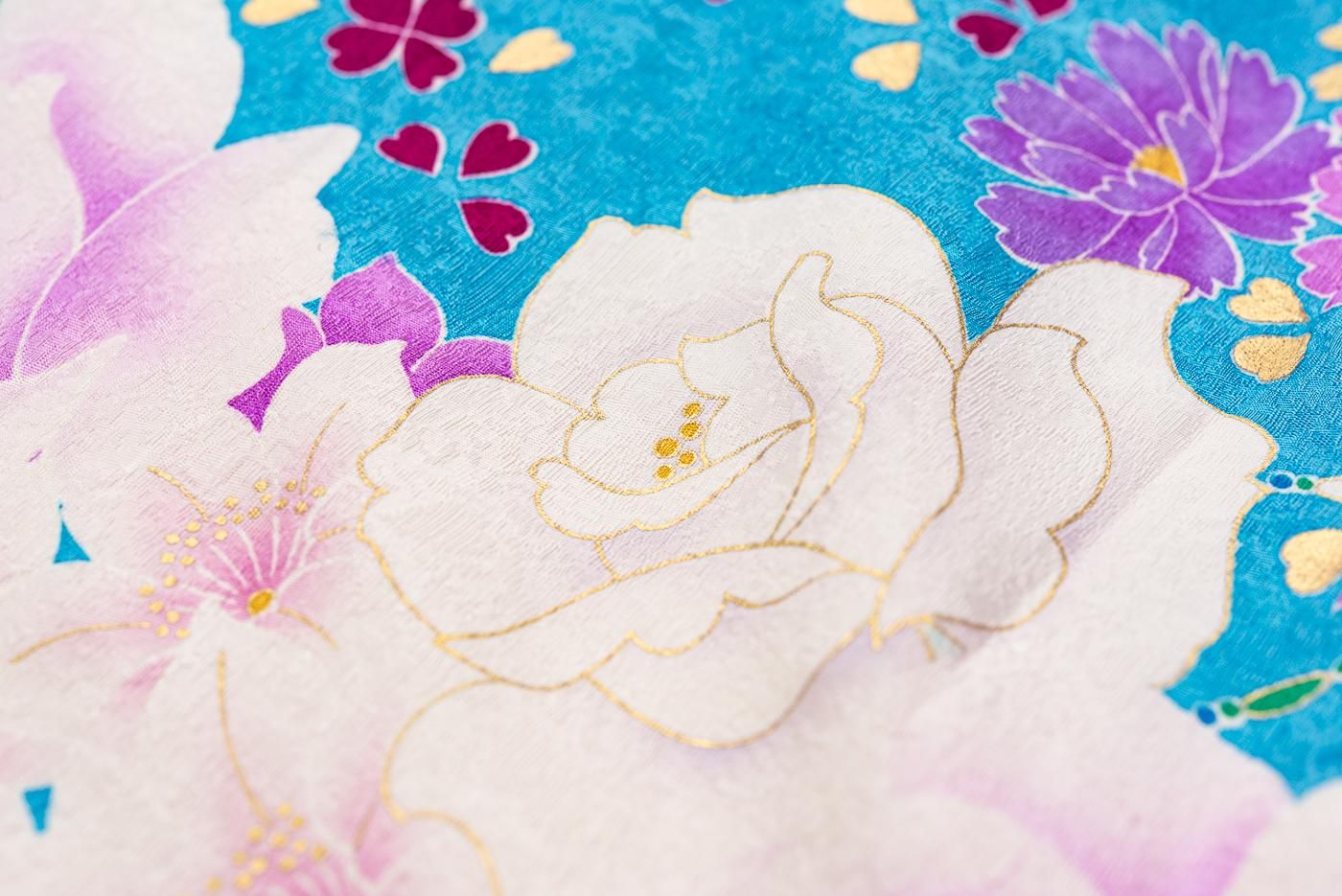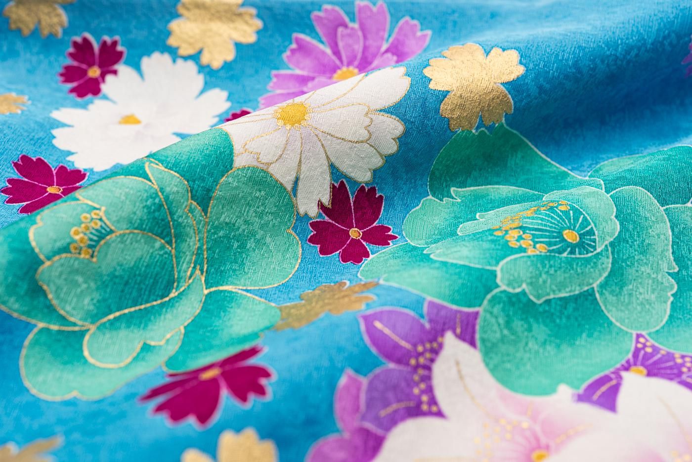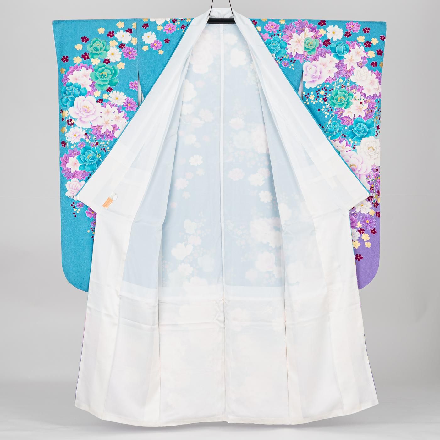 爽やかなシアンの地に大輪の薔薇や百合が咲く振袖です。