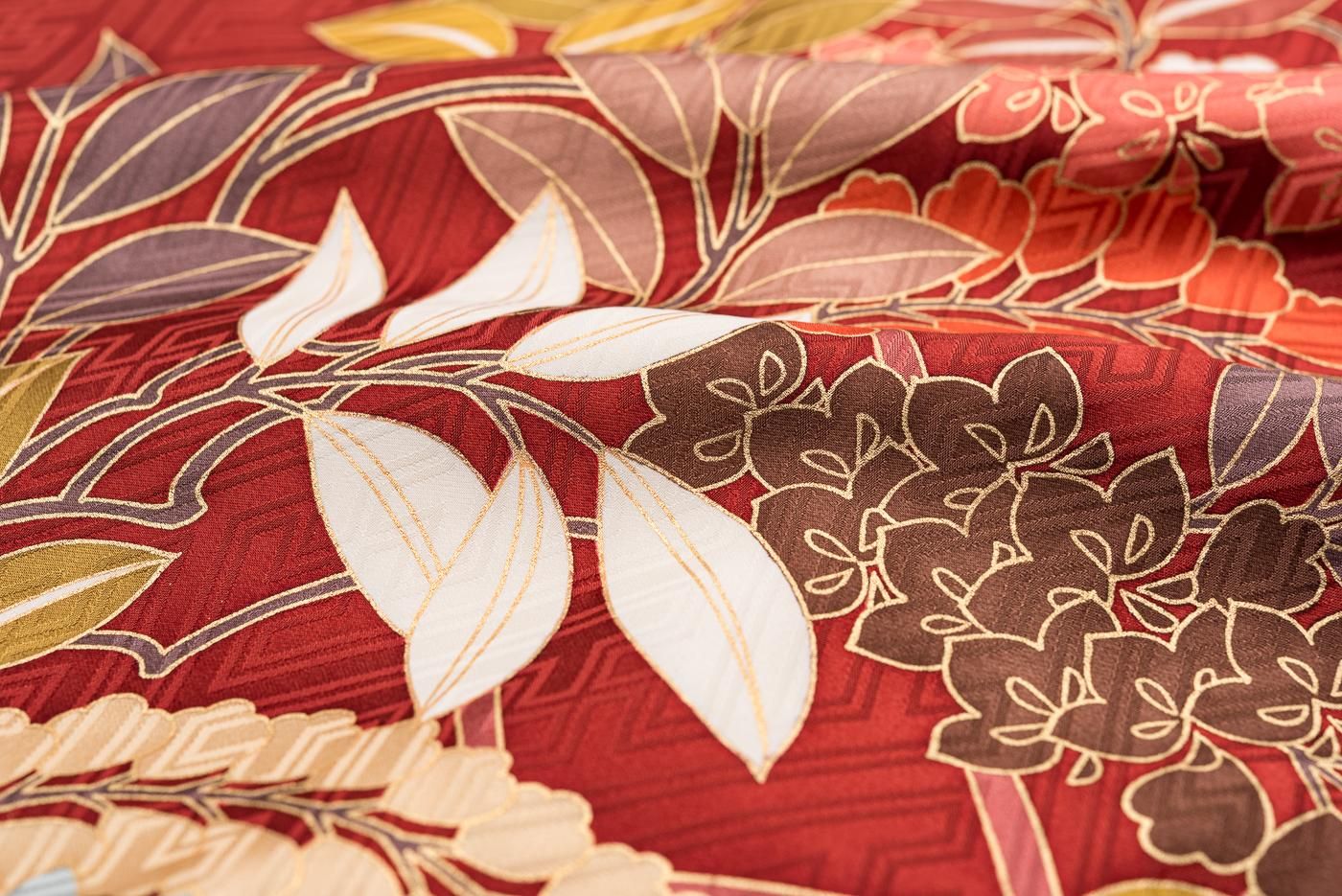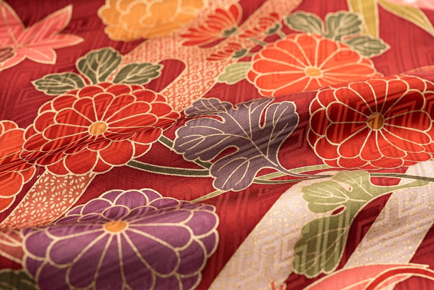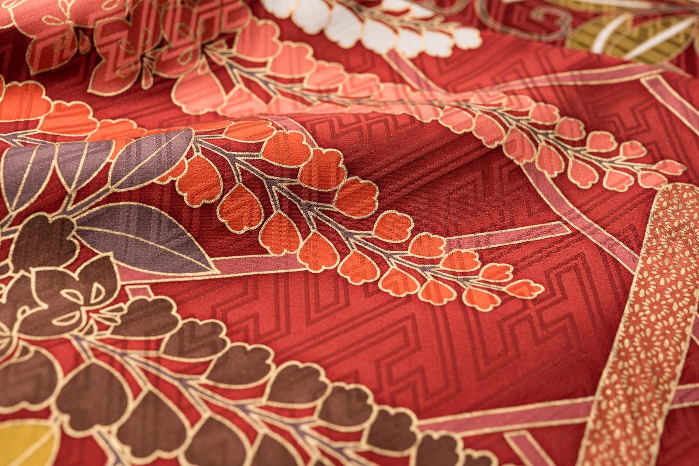 肩から裾まで途切れることなく柄が入っておりますので大変華やかな印象です。