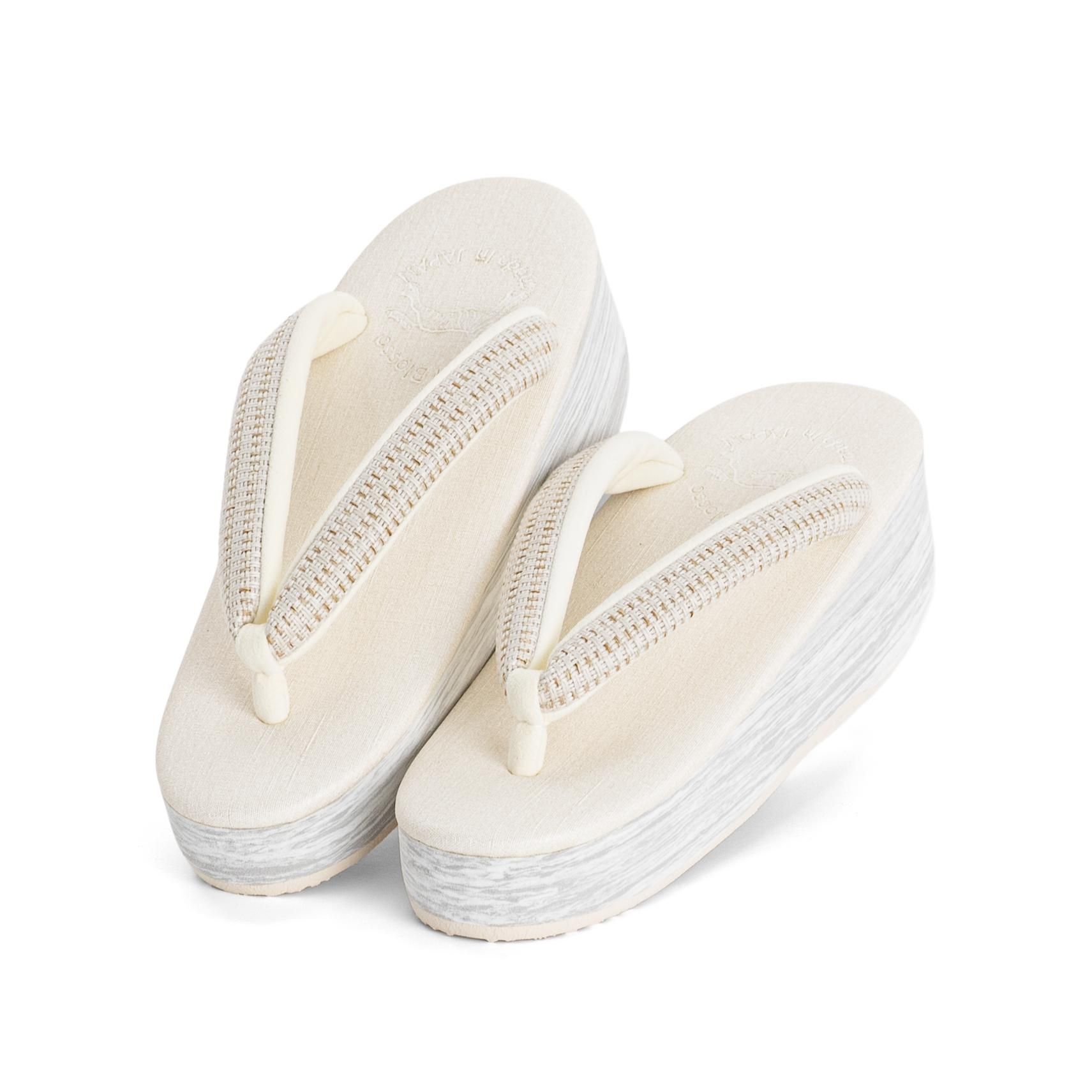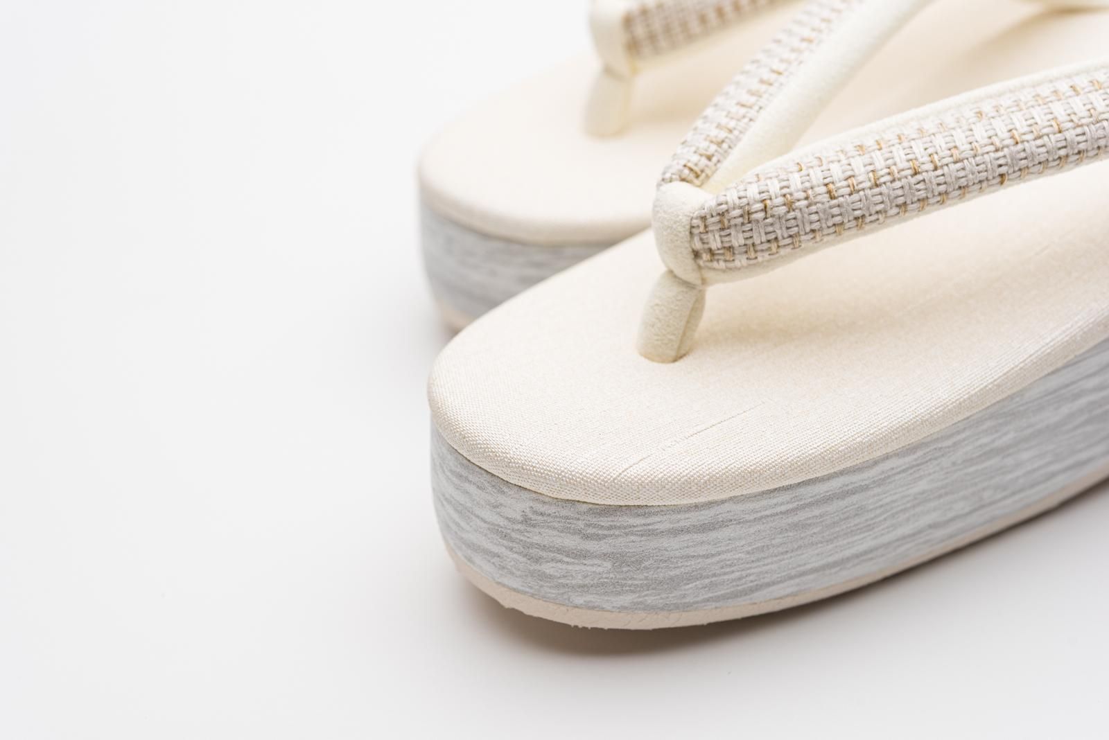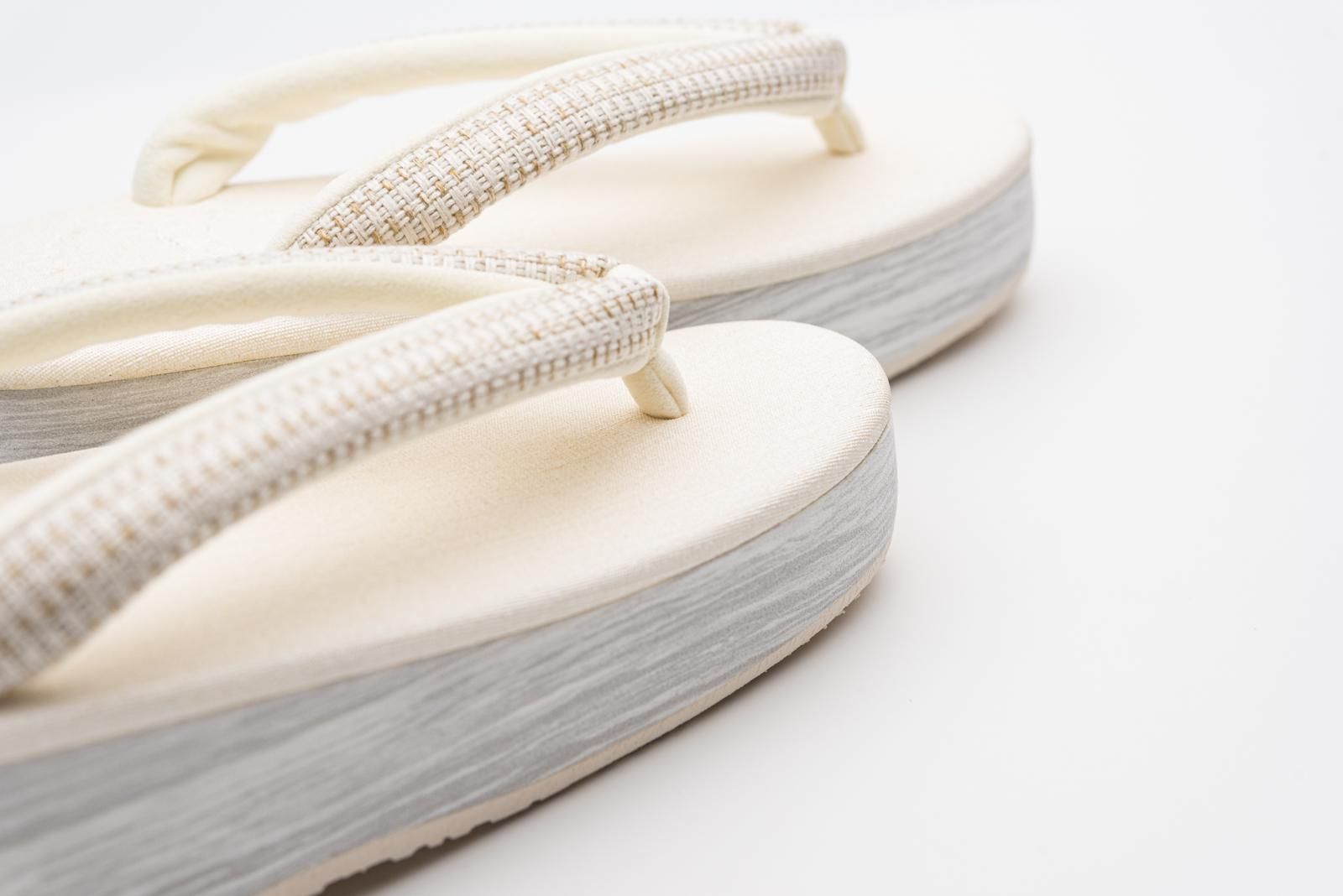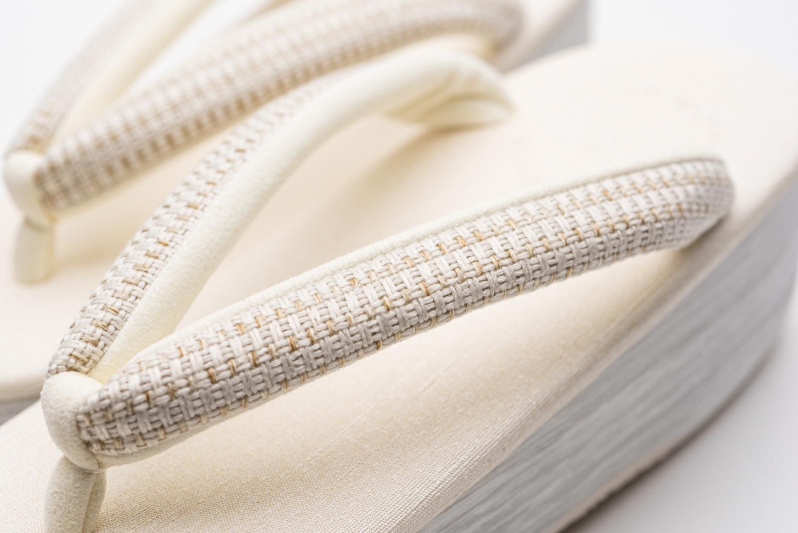 すっきりとした白の台に変わり横段織りの鼻緒を合わせたカフェ草履です。