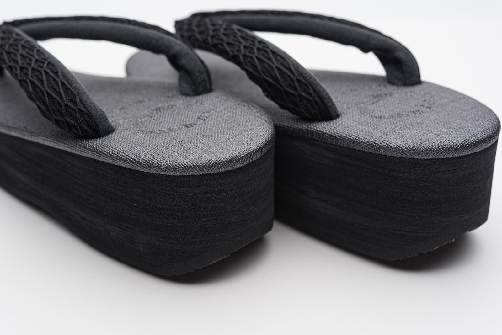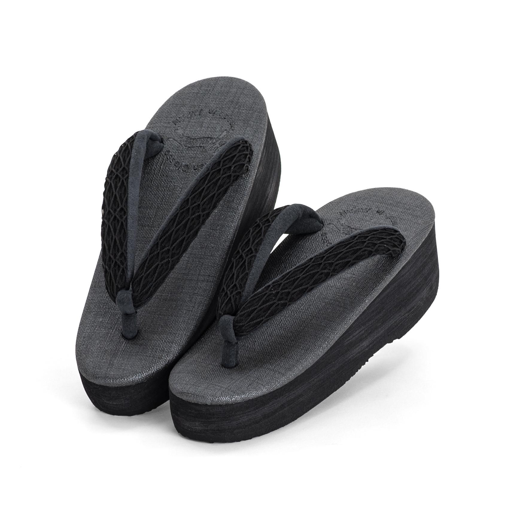 墨黒の台に網目模様が浮かぶポップな鼻緒を合わせたカフェ草履です。