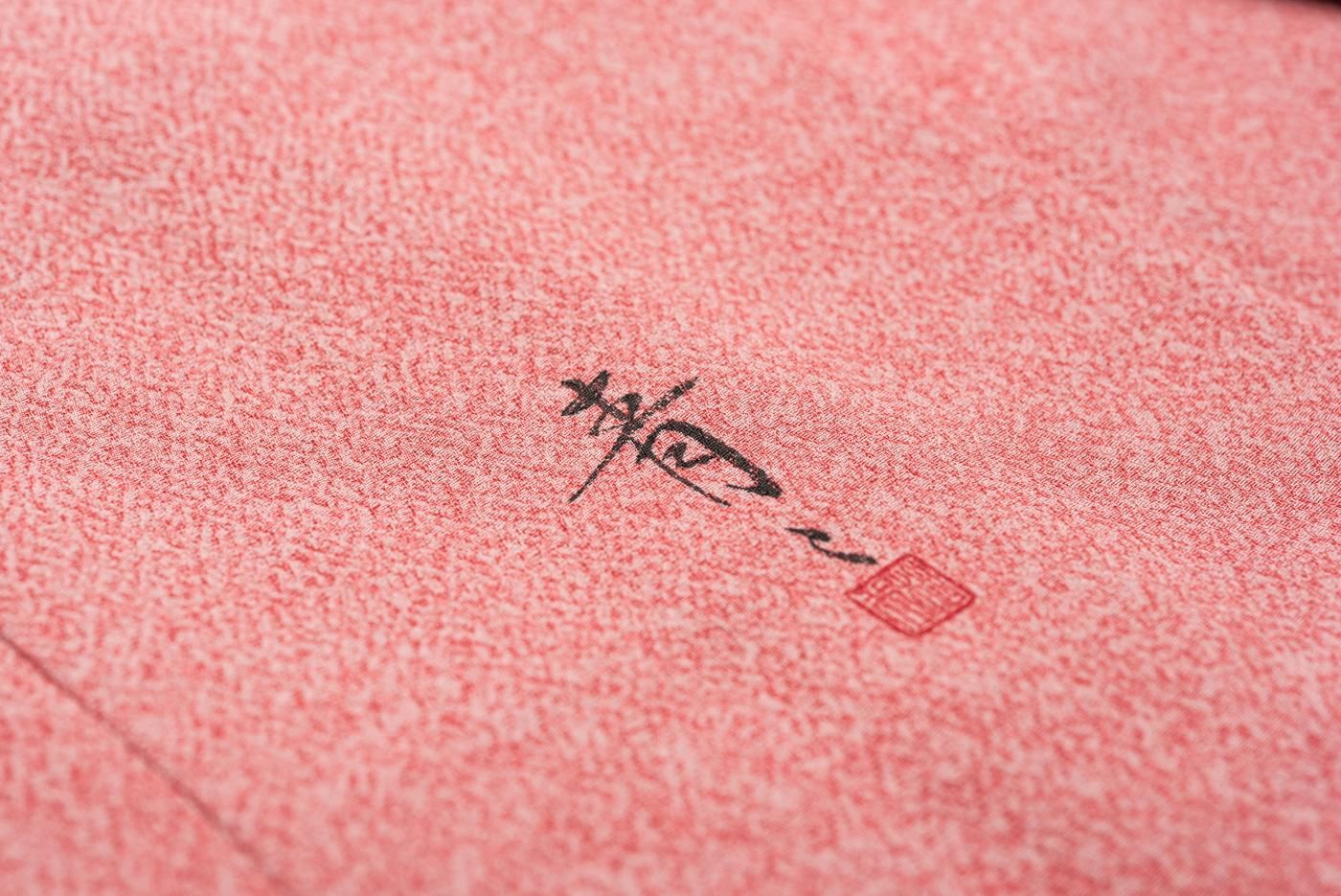 ピンクの地に牡丹、菊、桔梗などの花が繊細に描かれています。