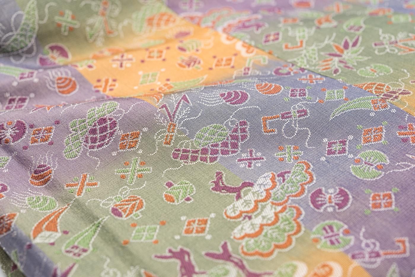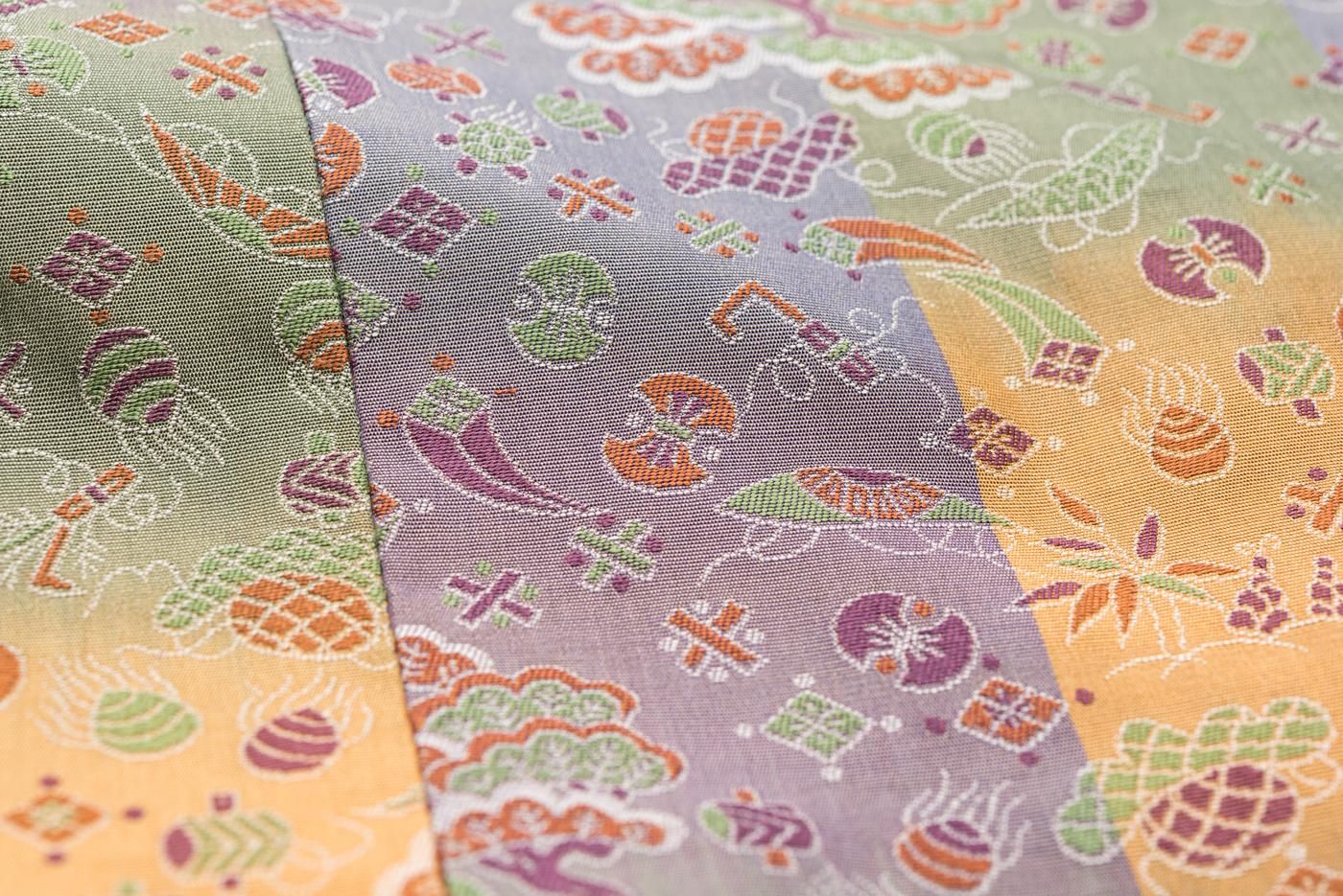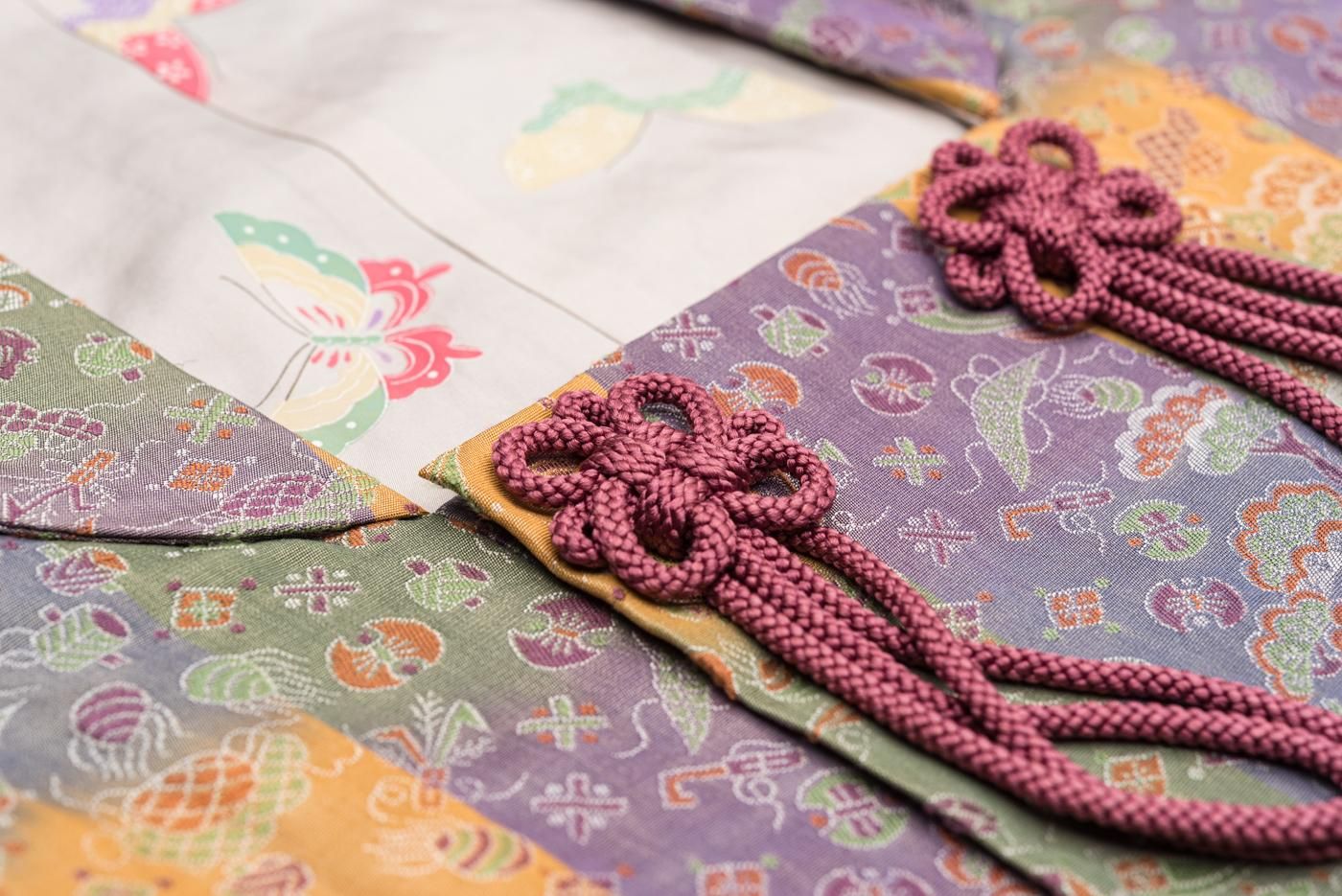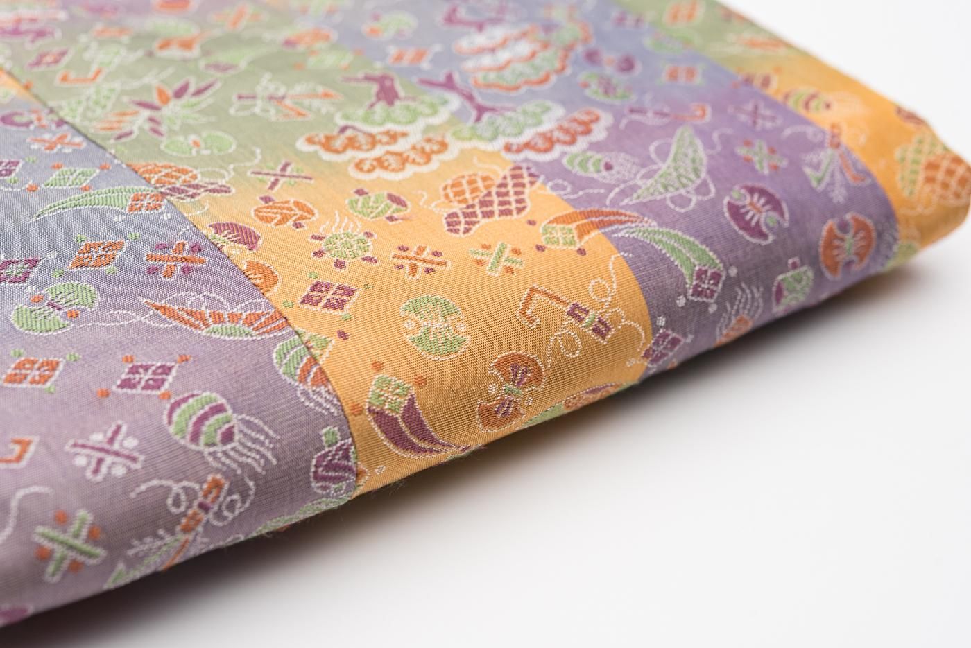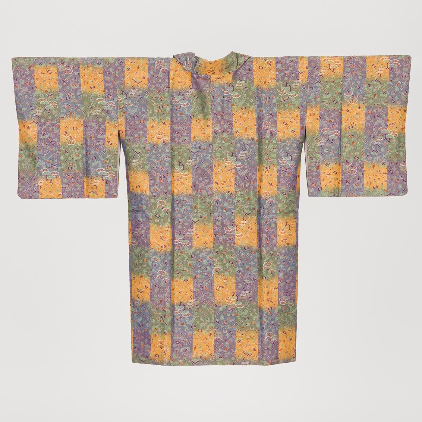 市松暈しに宝尽くしの文様を織り出した被布衿コートです。
