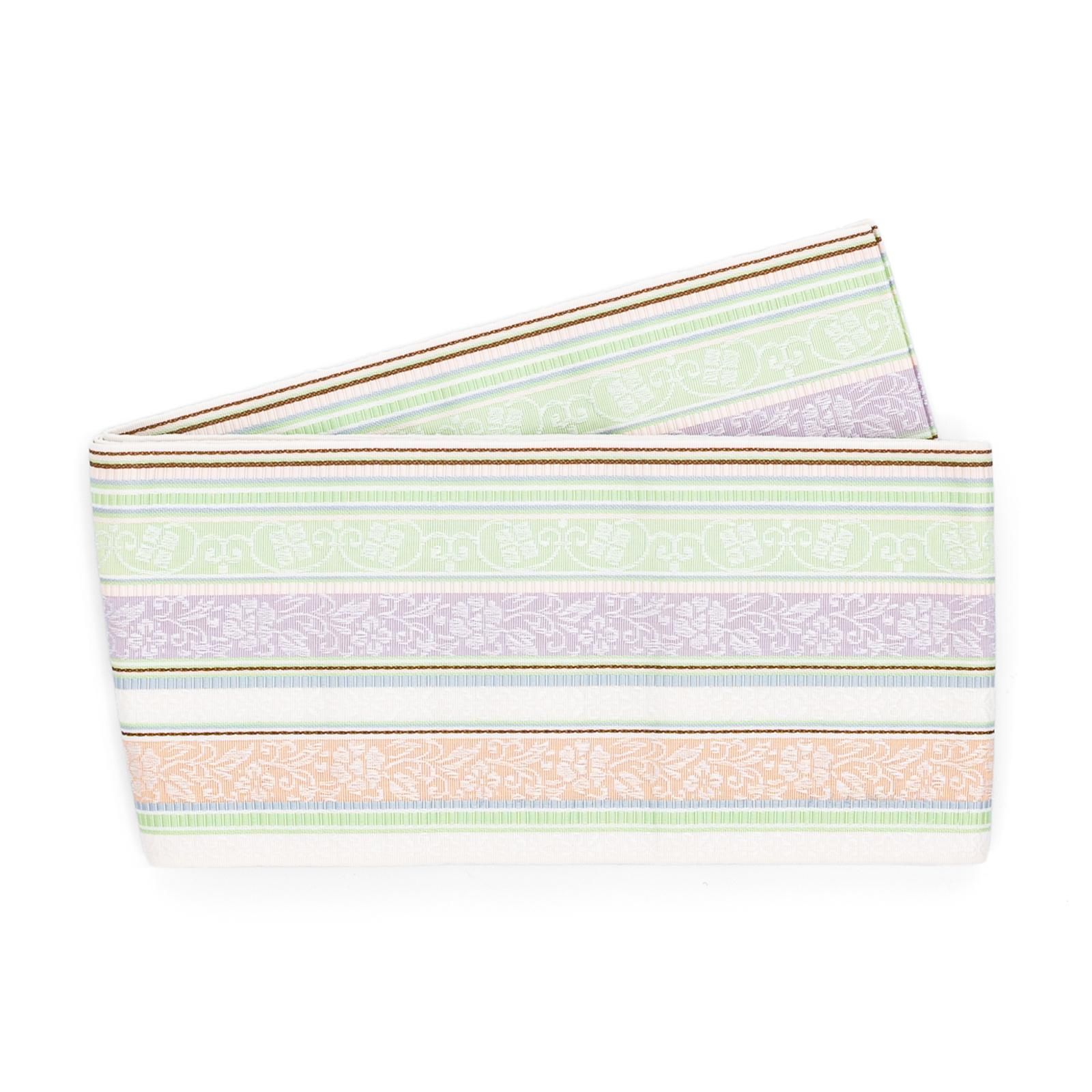 リズミカルな縞に小ぶりの花やくるんと弧を描くラインなどを織り出した博多小袋帯です。