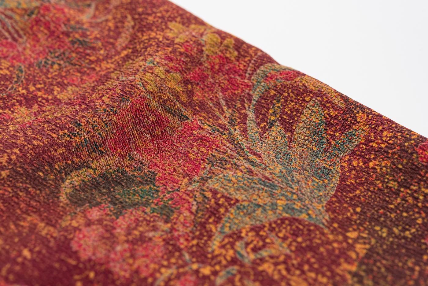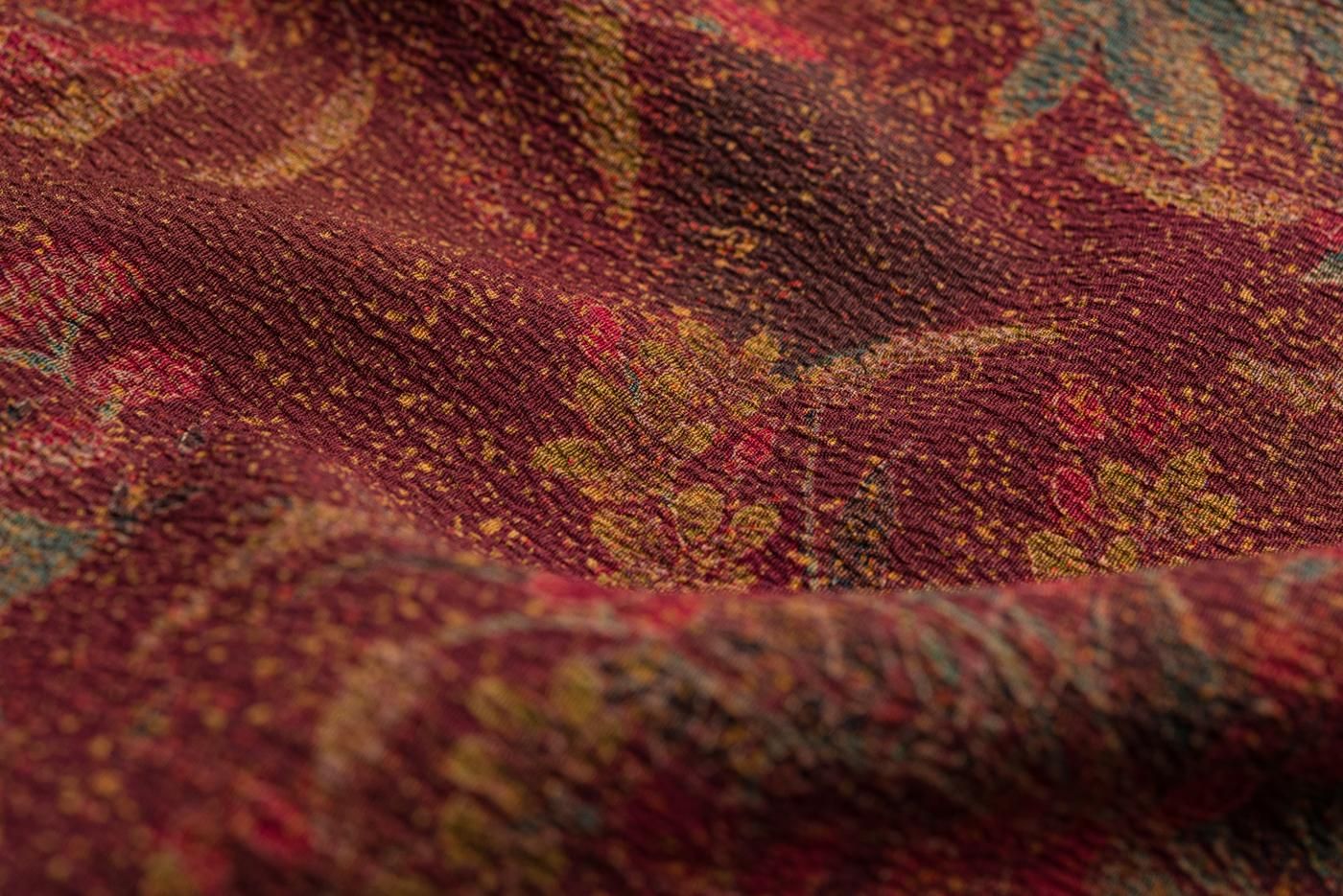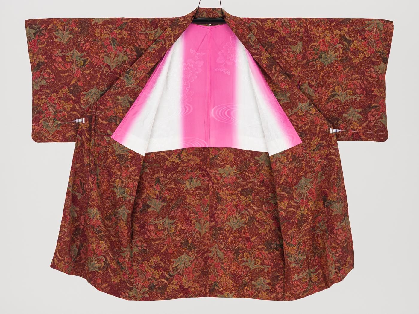 赤銅色の地に草花模様を染めたロング丈の道中着です。