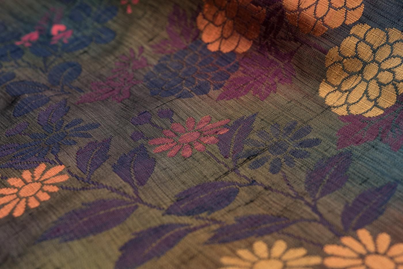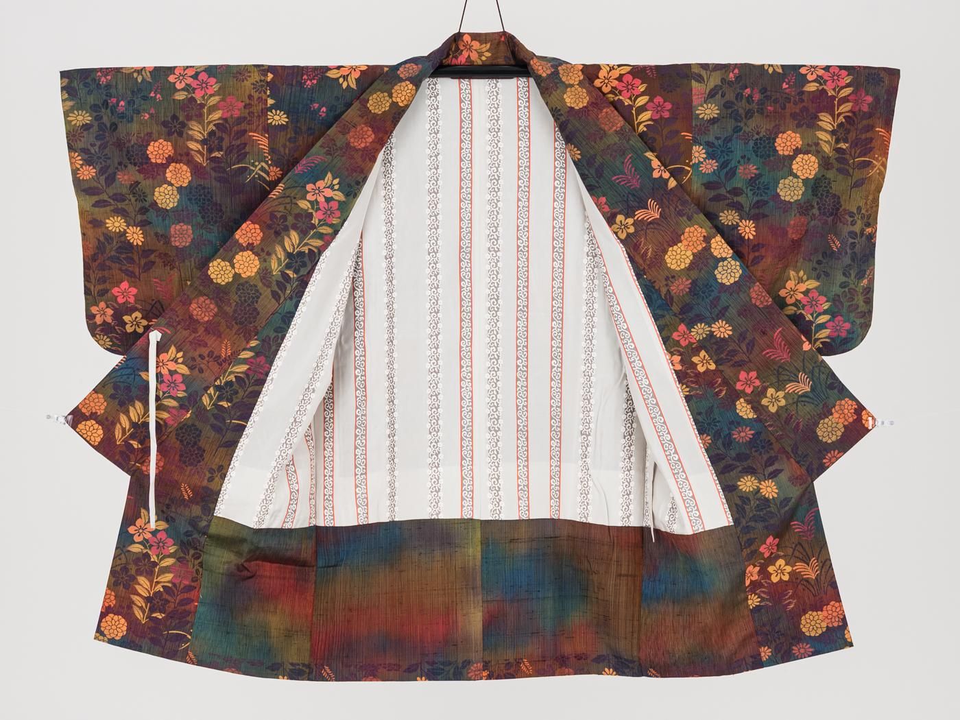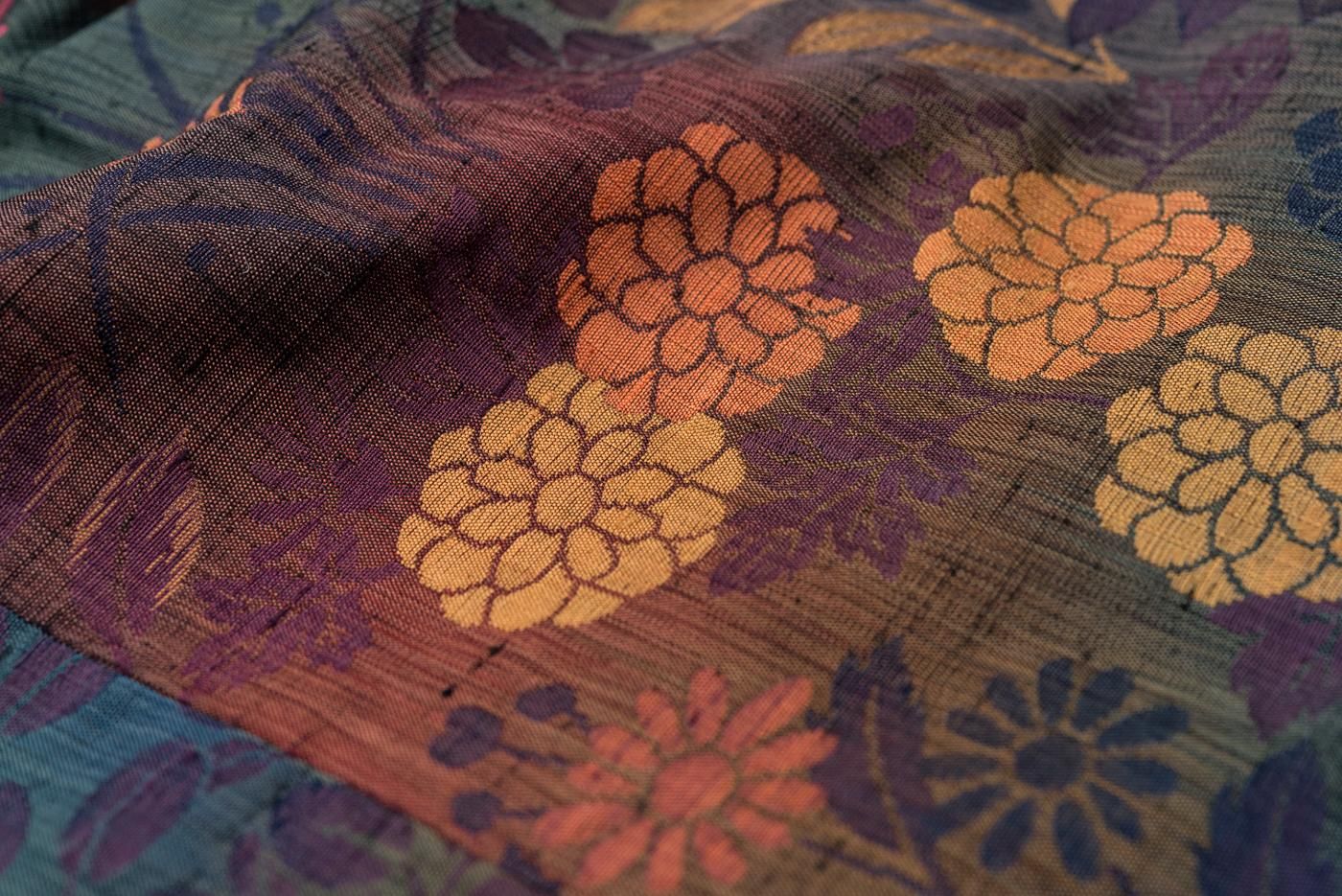 菊、桔梗、ススキなどの秋草模様を織り出したロング丈の道中着です。