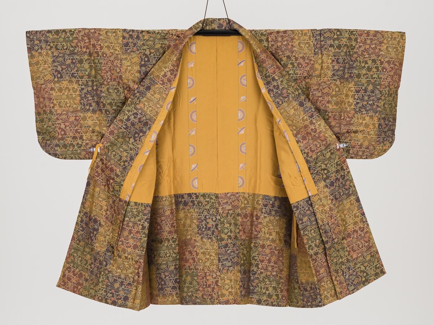 籠目に宝尽くし文様を添えたロング丈の道中着です。