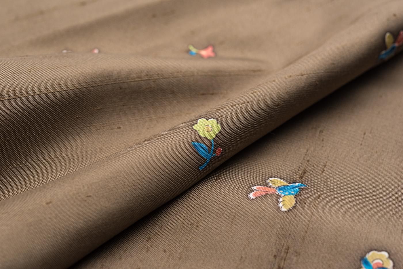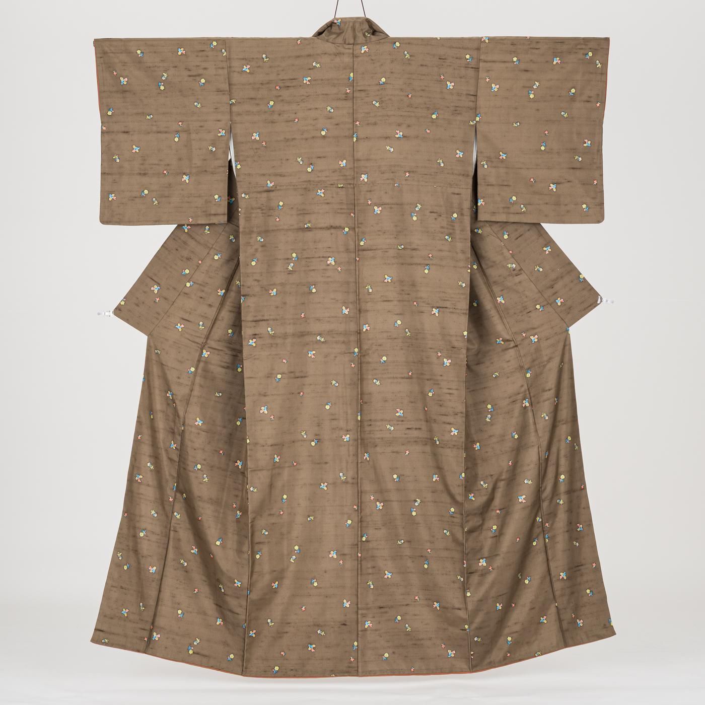 チョコレート色の地に小花と鳥を染めた紬の着物です。