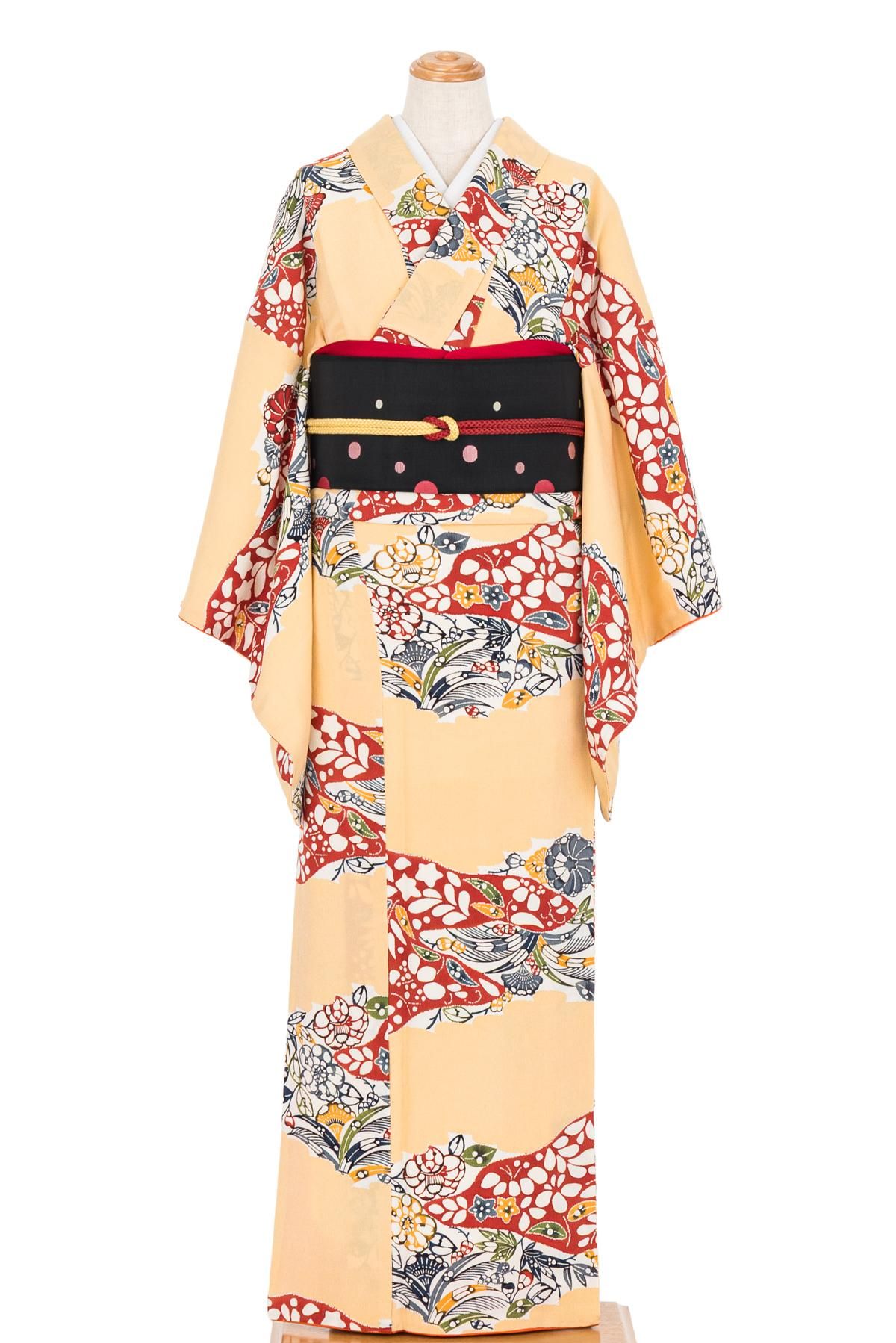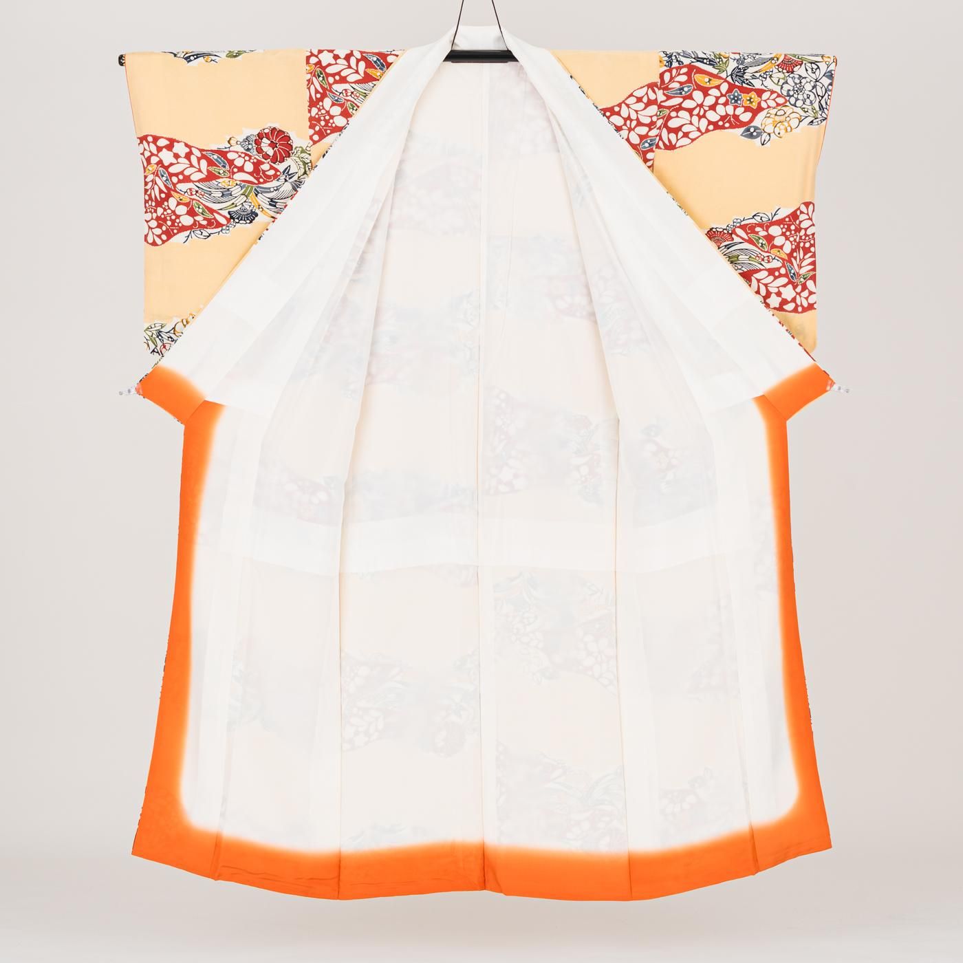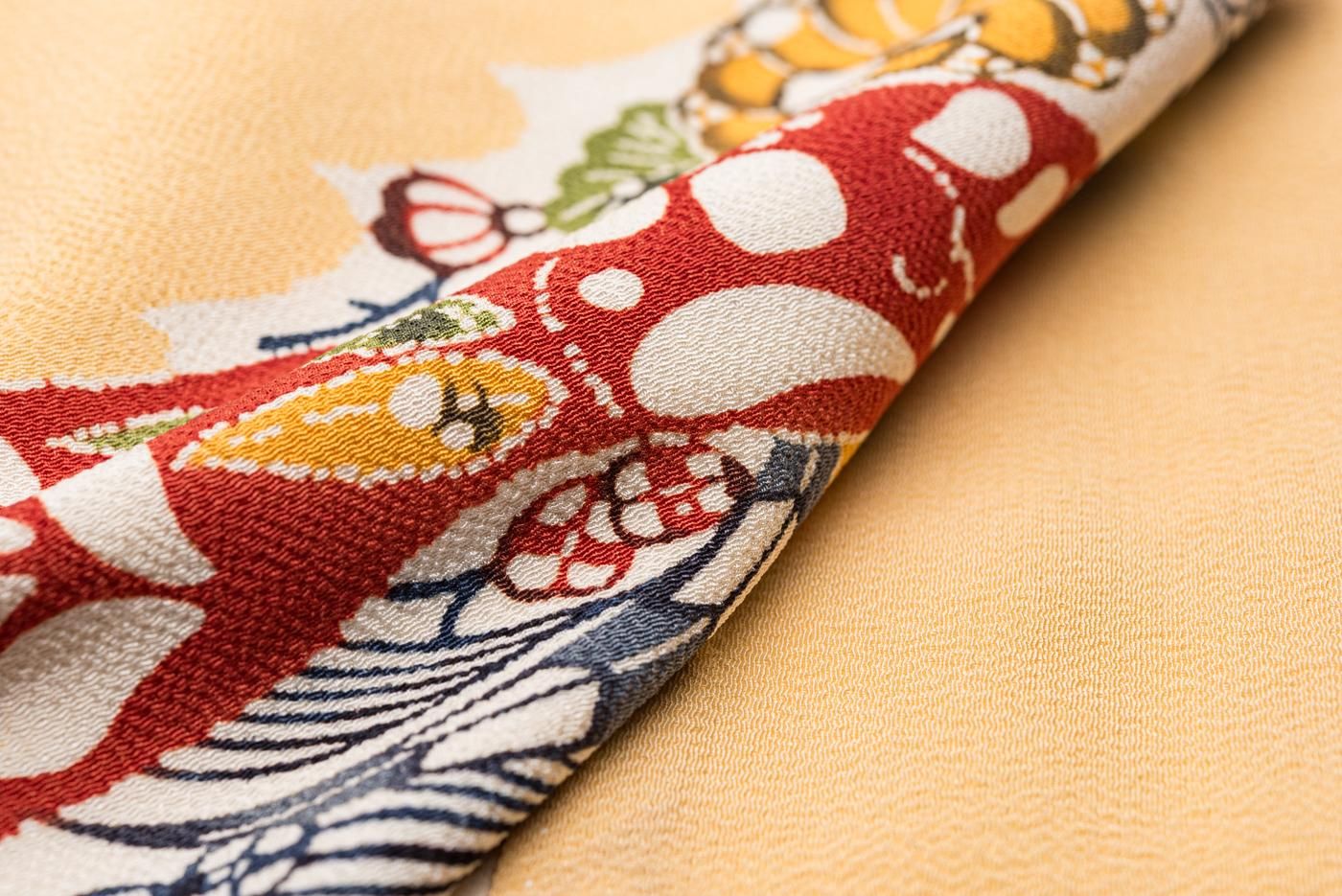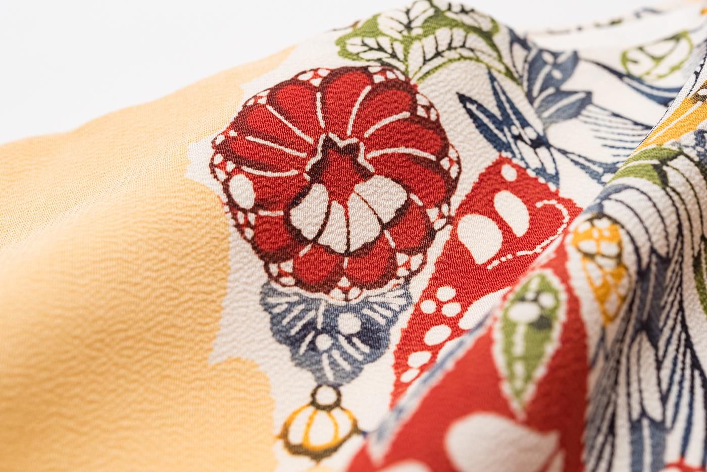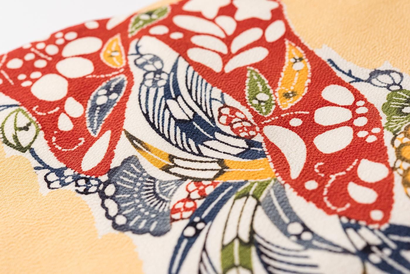 ぱっと明るい薄黄色の地が柄の鮮やかな色彩をより一層際立たせているようです。