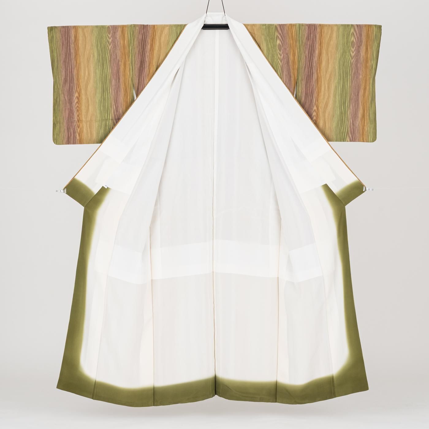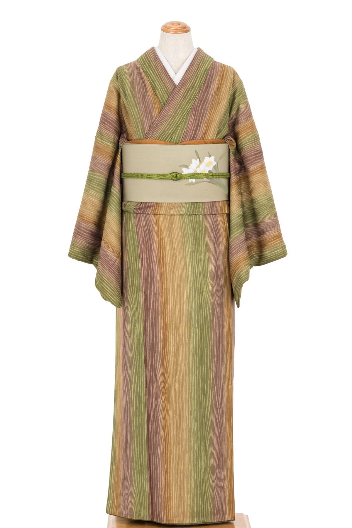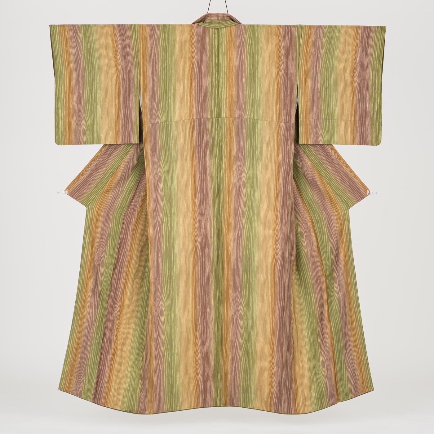 暈し縞に杢目柄を重ねた小紋の着物です。