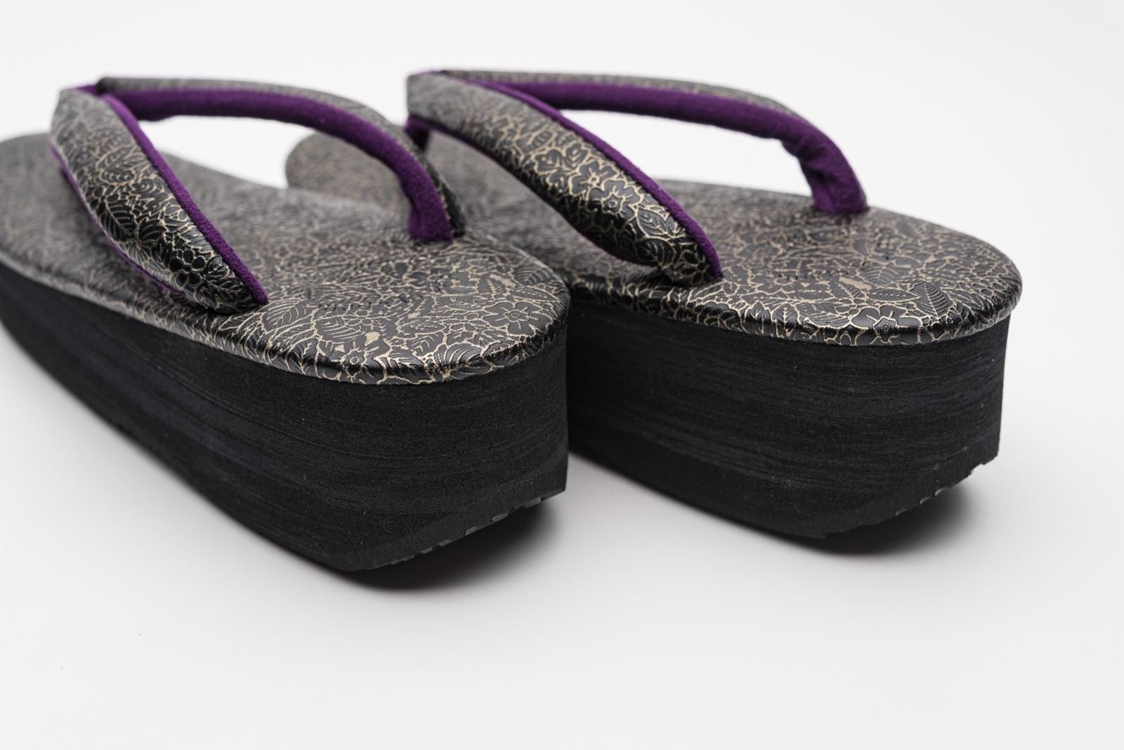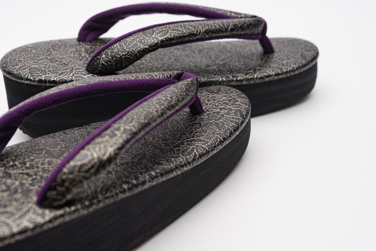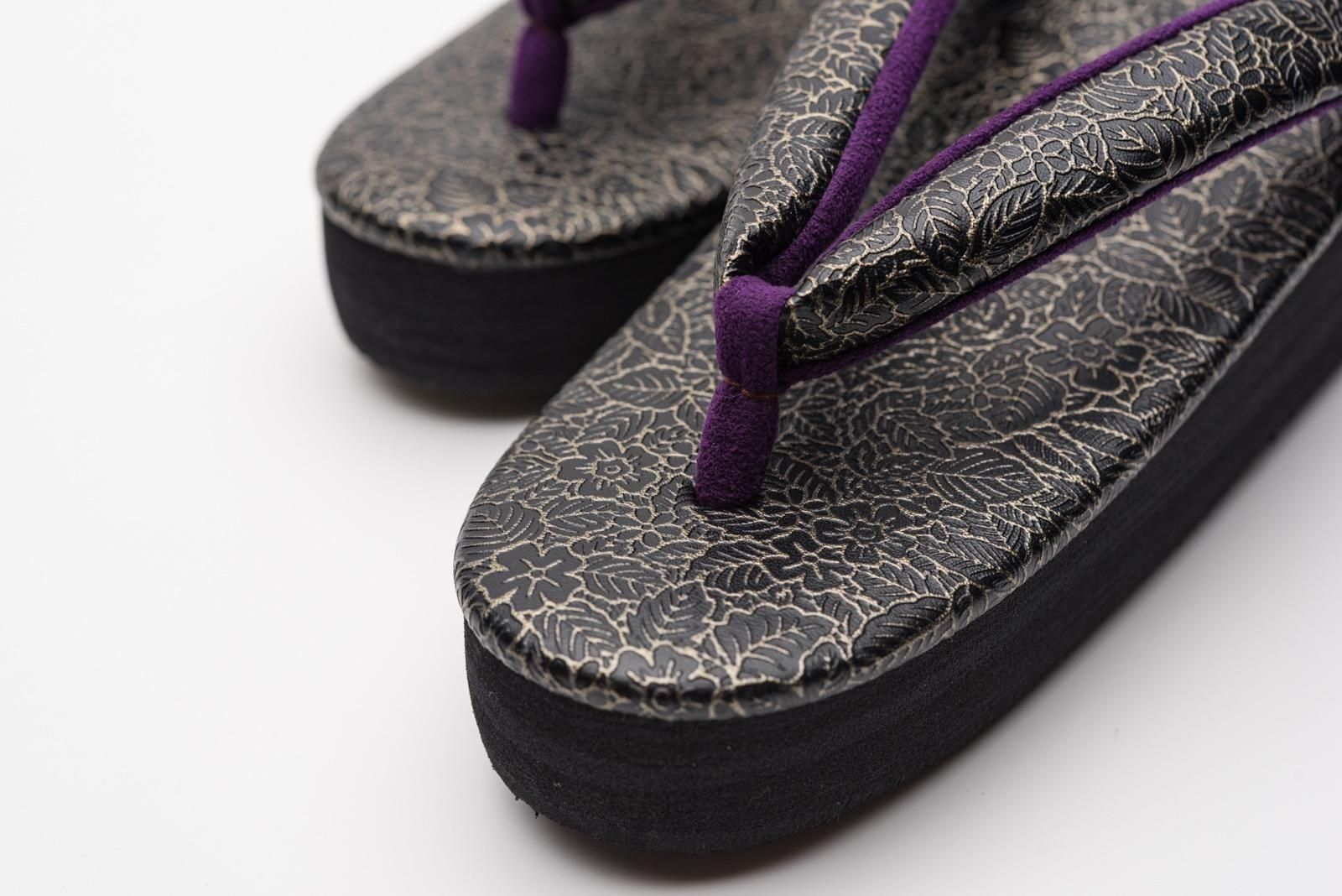 小さな花や葉っぱの柄を緻密に配したカフェ草履です。