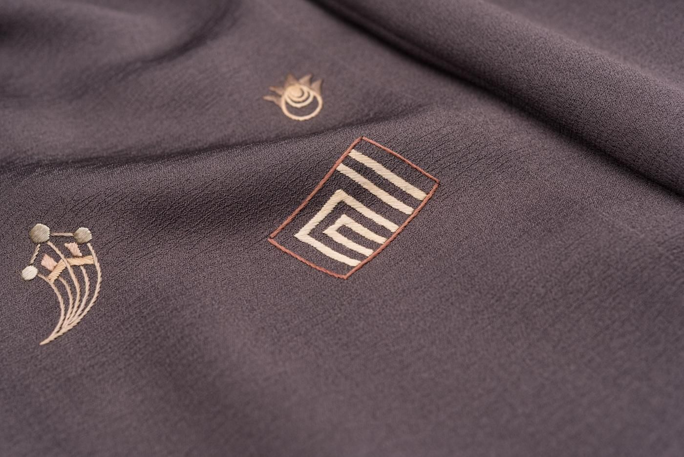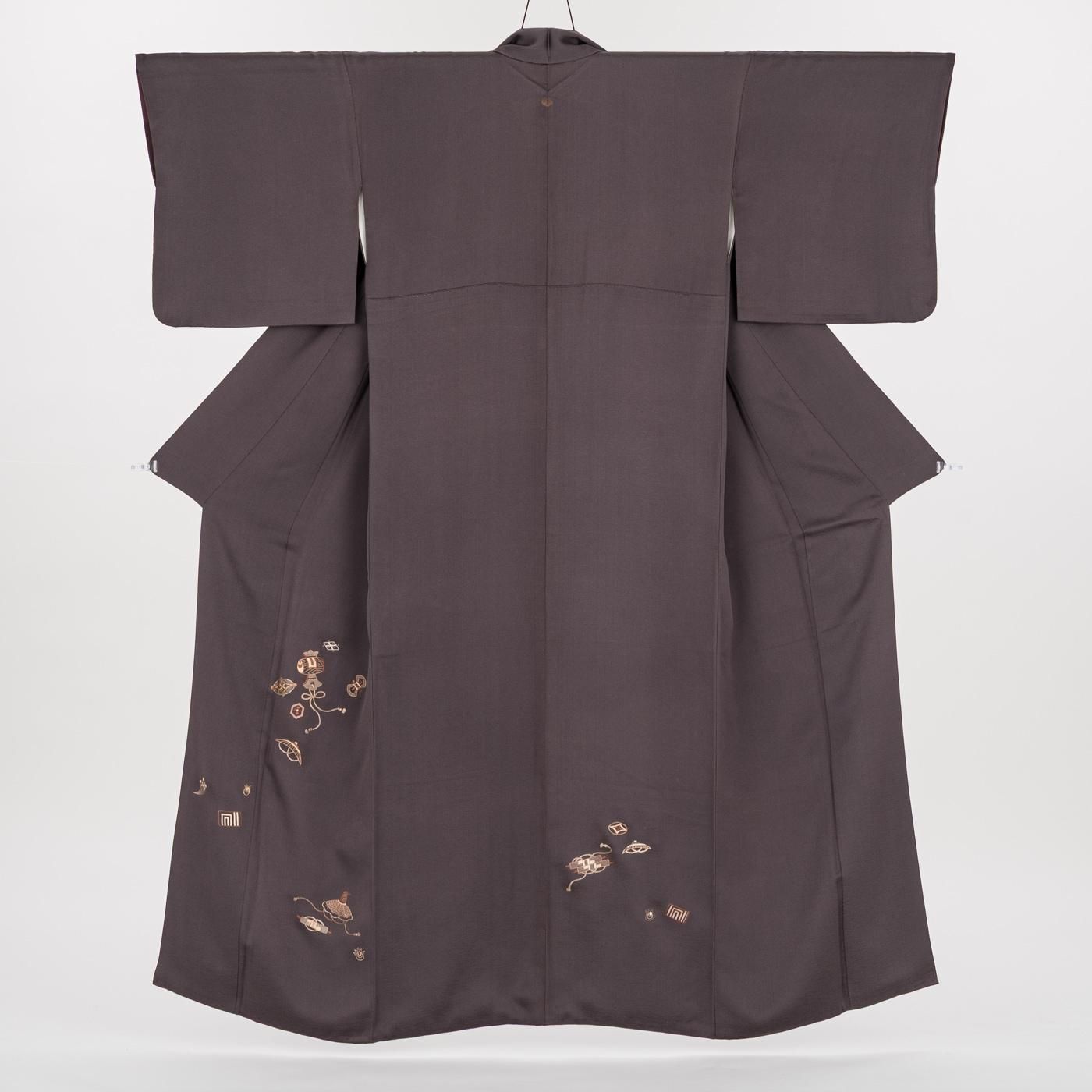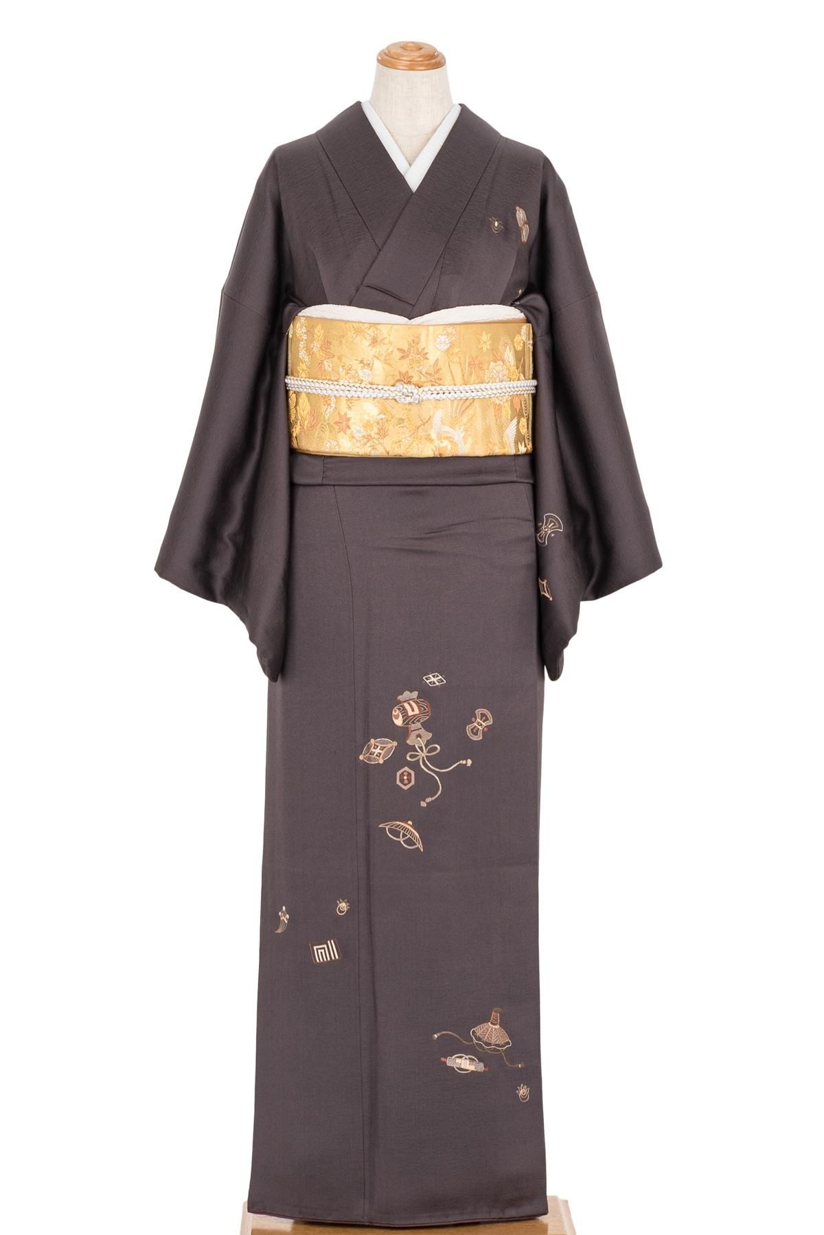 滅紫色の地に宝尽くしや源氏香を刺繍した一つ紋入りの訪問着です。