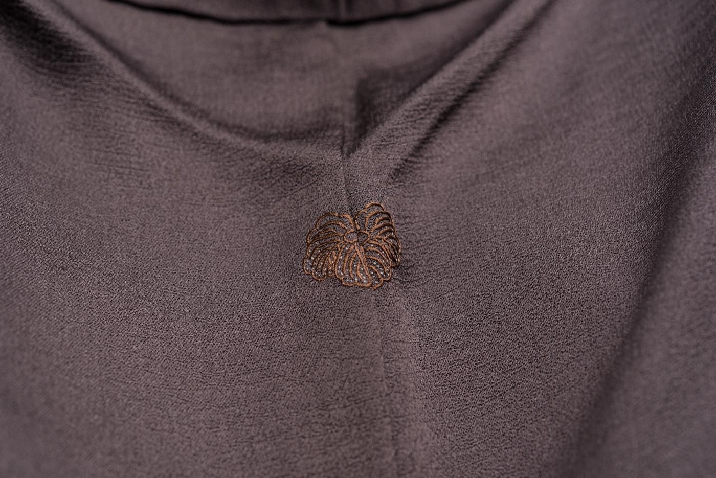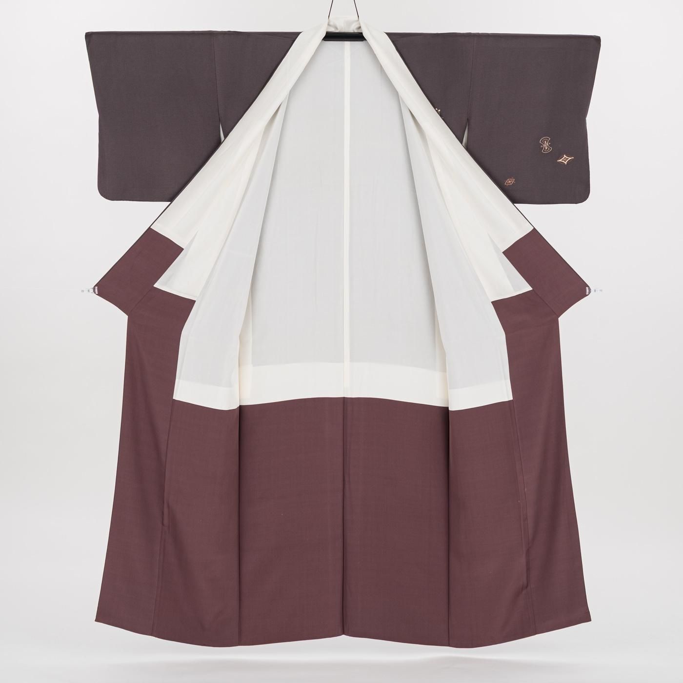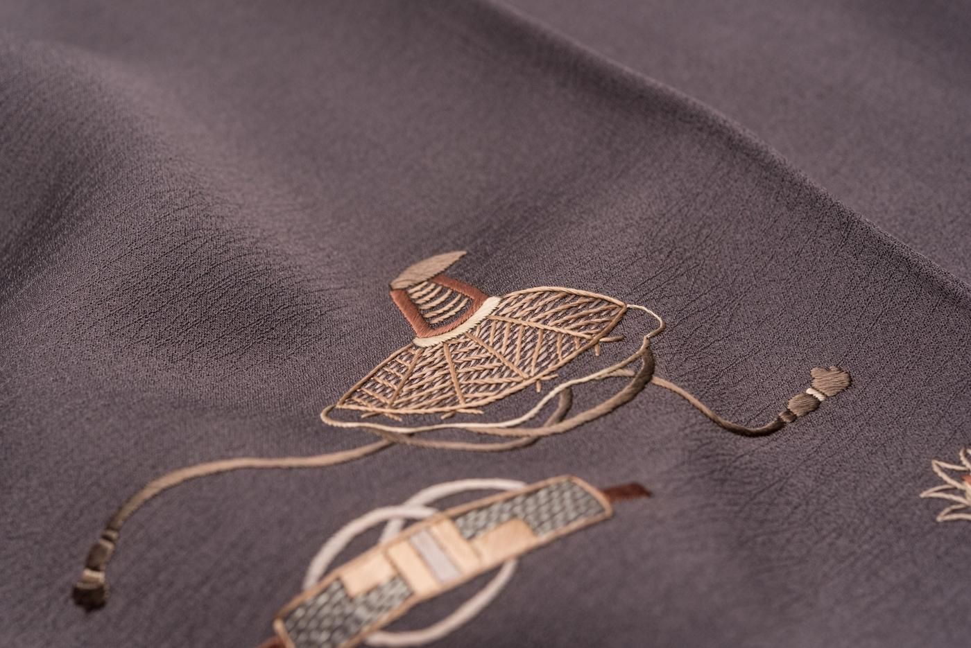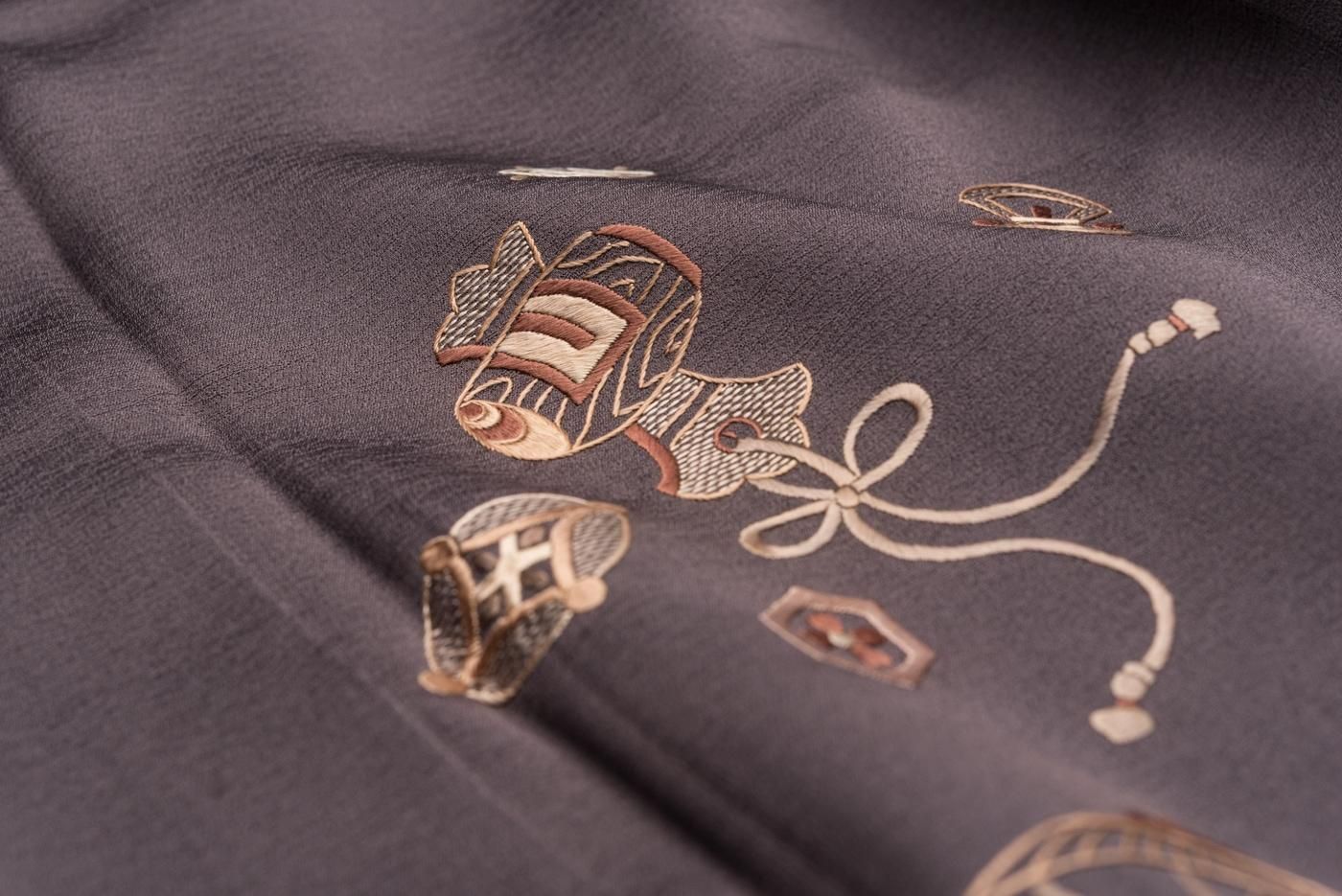 滅紫色の地に宝尽くしや源氏香を刺繍した一つ紋入りの訪問着です。