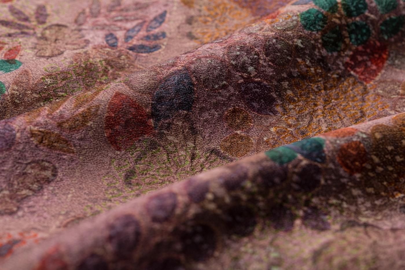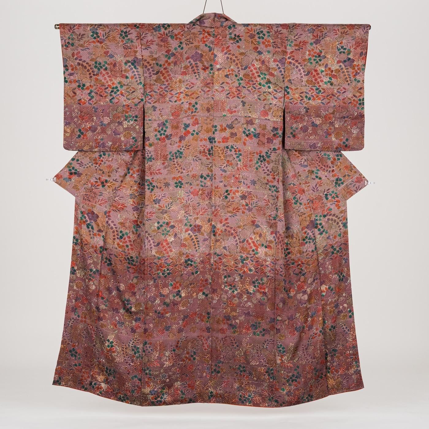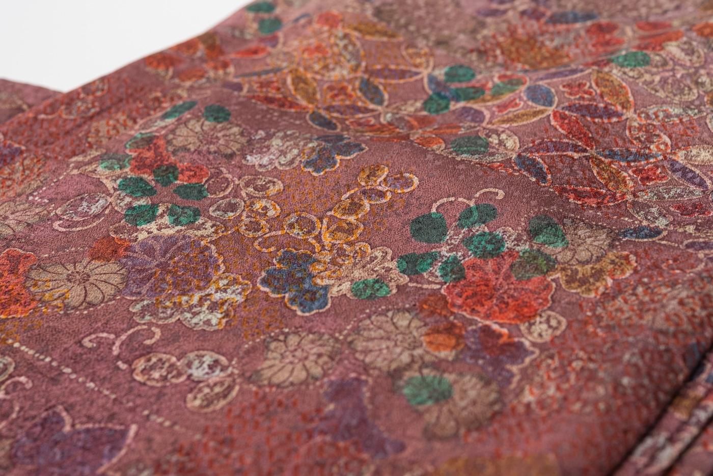 色とりどりの草花模様を染めた付け下げ小紋の着物です。