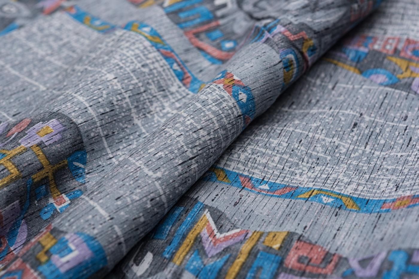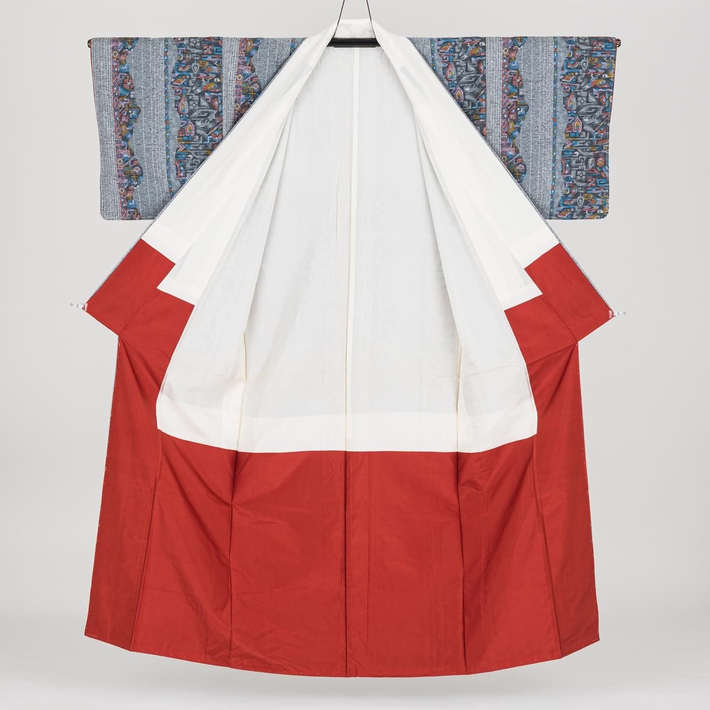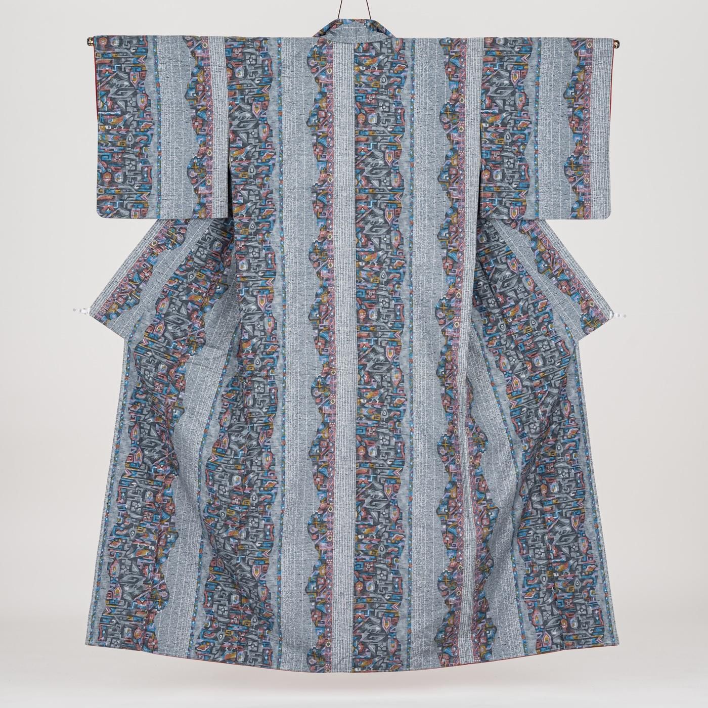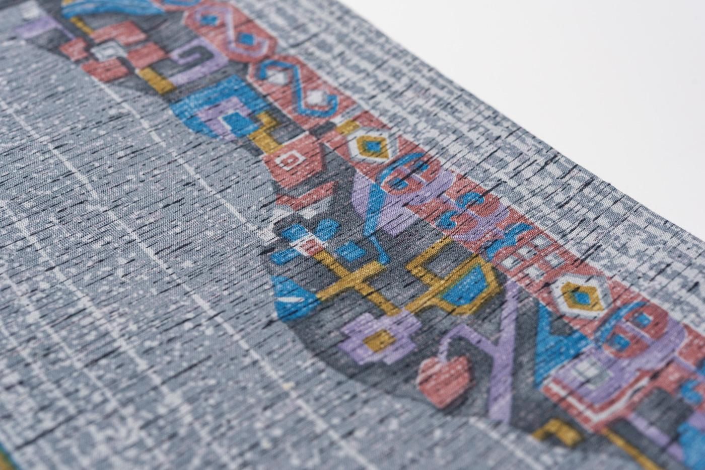 抽象的な幾何学柄を染めた紬地の小紋です。