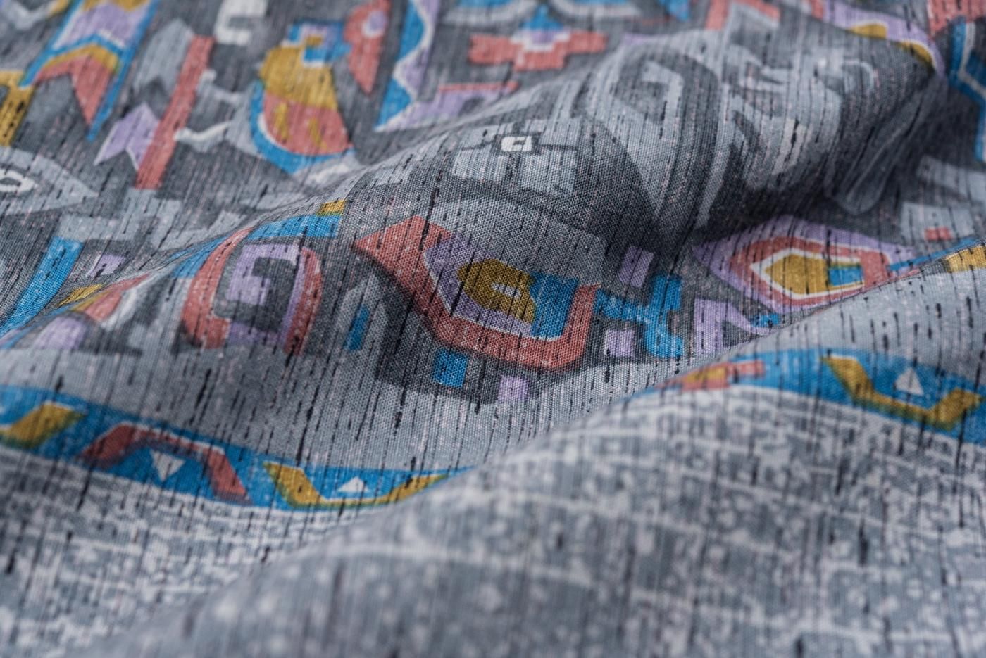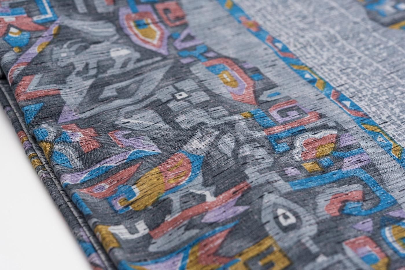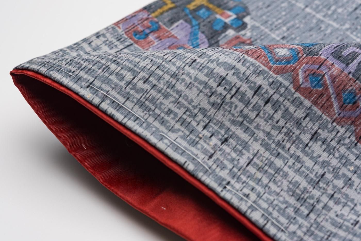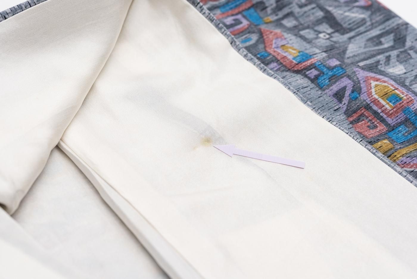 抽象的な幾何学柄を染めた紬地の小紋です。
