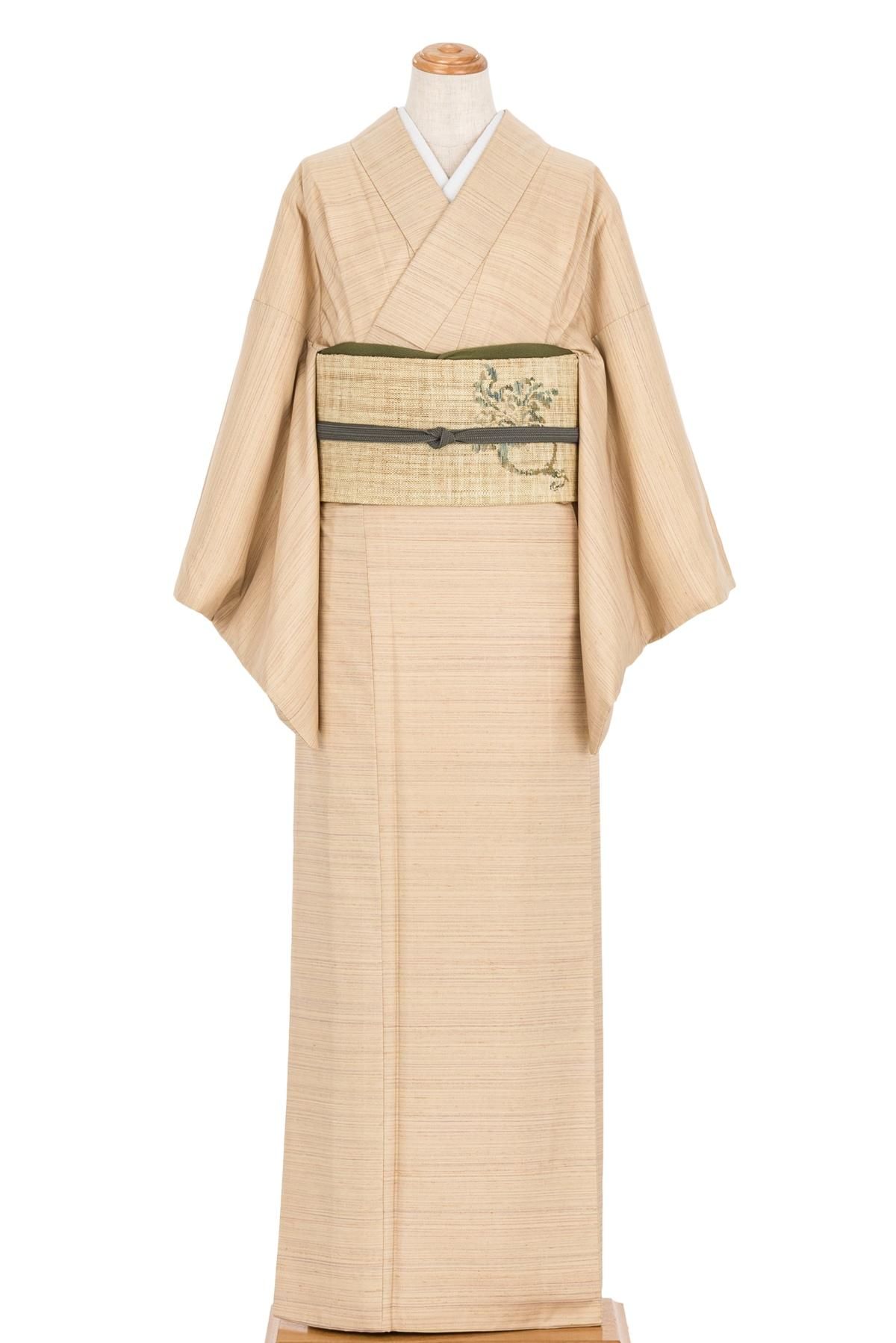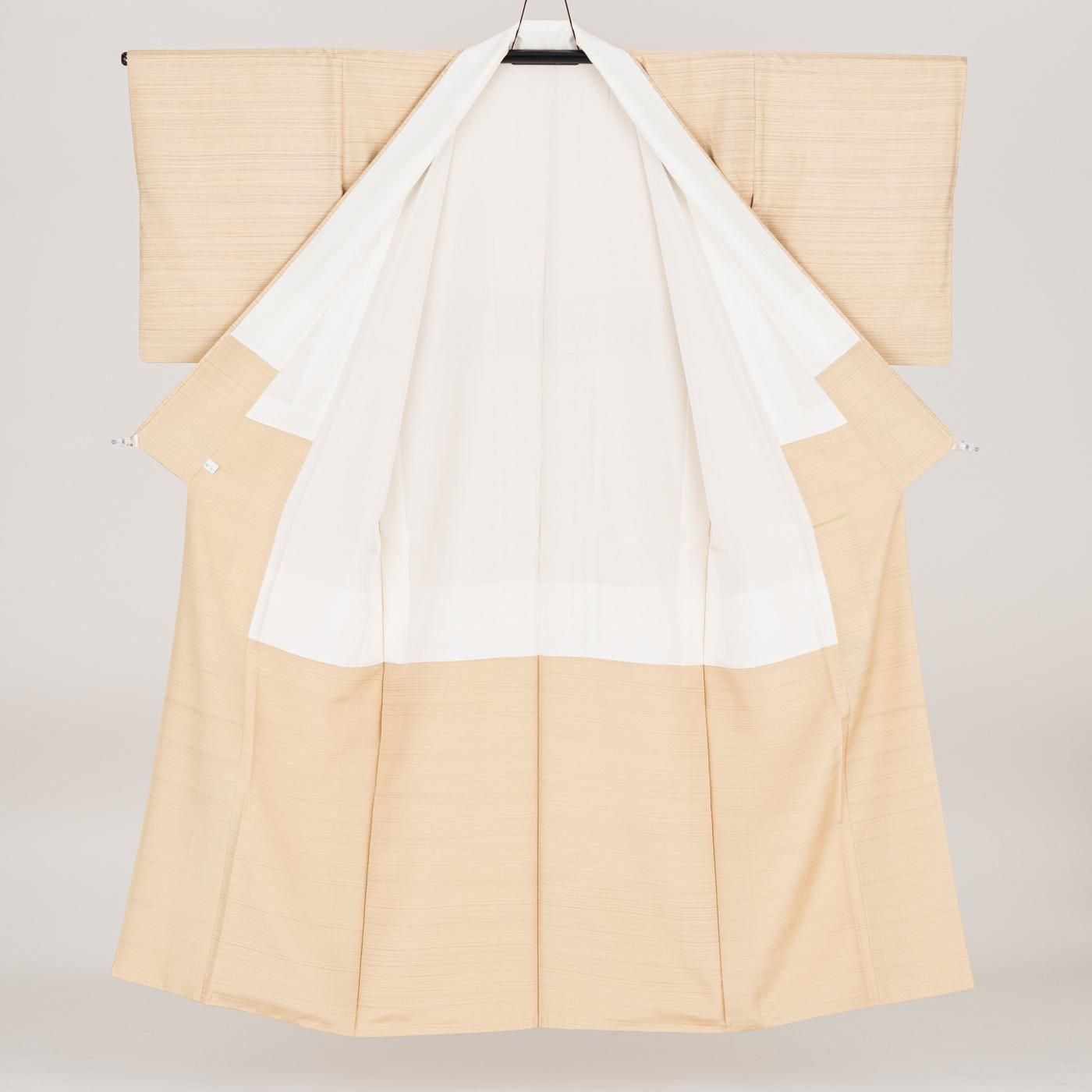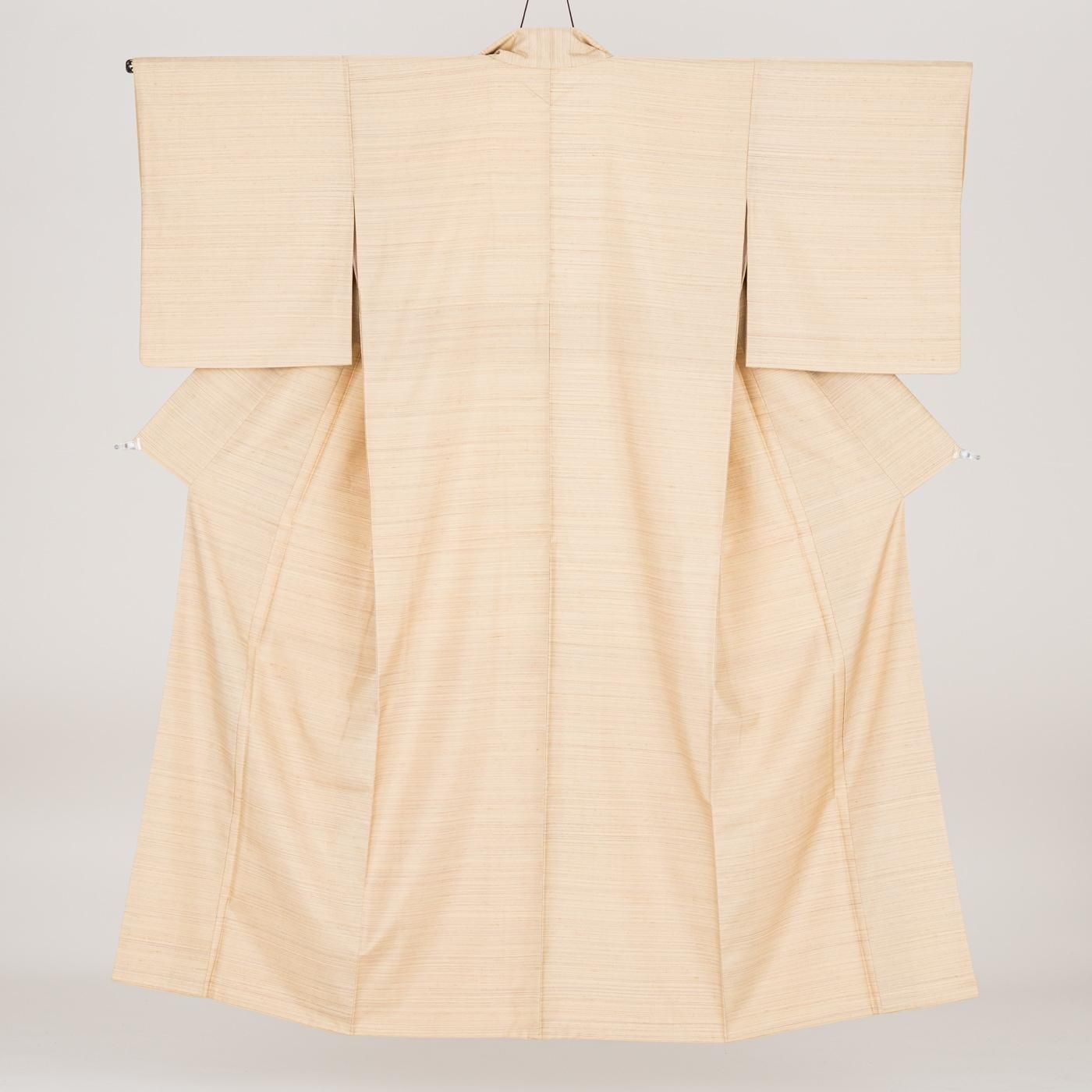黄みがかったベージュ地に横段模様を織り出した紬の着物です。